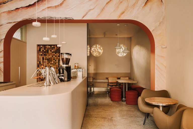 W wyniku współpracy z Ekri i CUDO: powstał specjalny, beżowy tynk, który doskonale oddaje kolor i strukturę muszli. Bar o obłej, delikatnej formie został pokryty mikrocementem. W projekcie zastosowano również interesujący detal – drewniane koraliki, które pełnią funkcję przesłon. Umieszczone w oknach, umożliwiają kontrolowanie wpadającego światła, a we wnętrzu zasłaniają zaplecze.