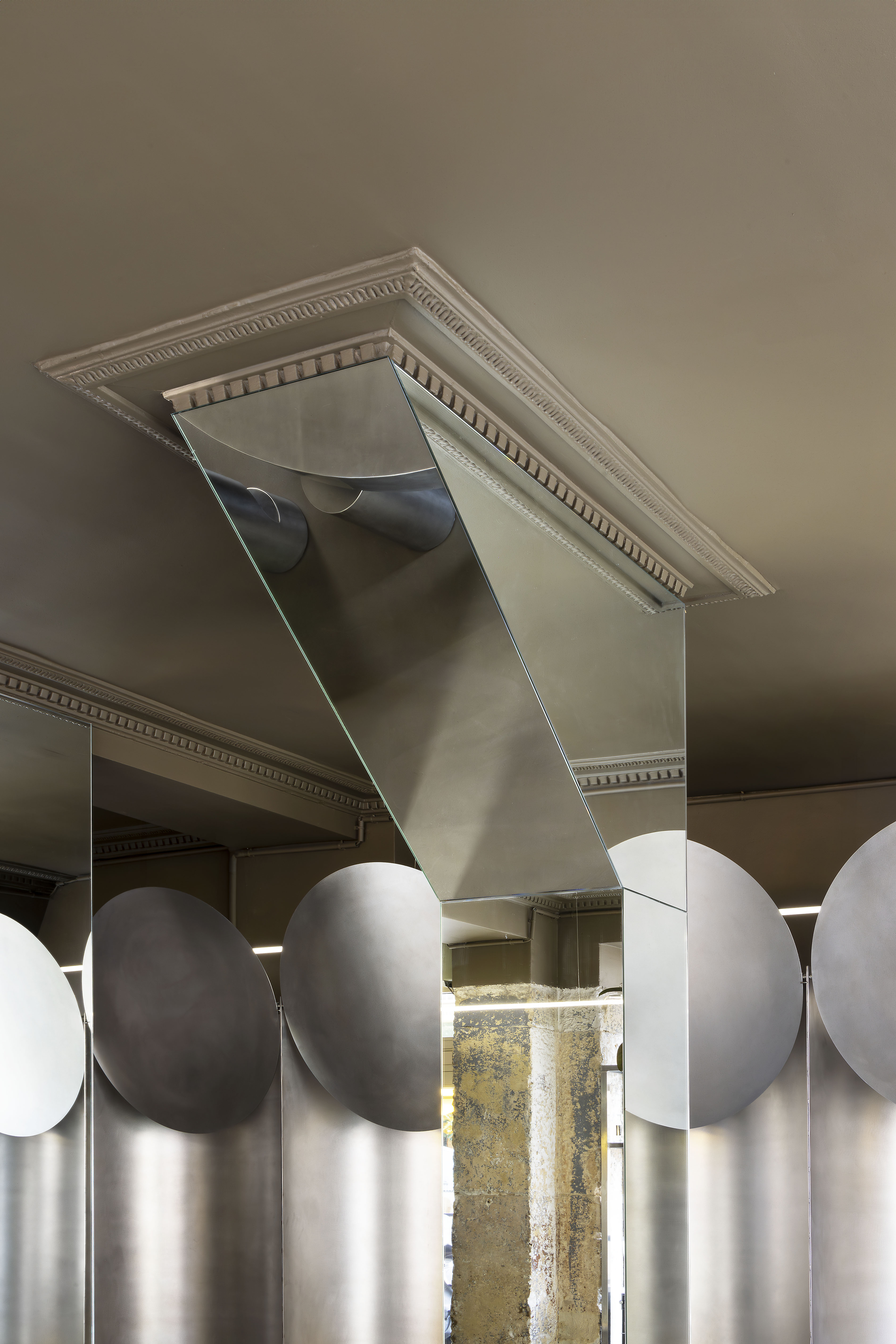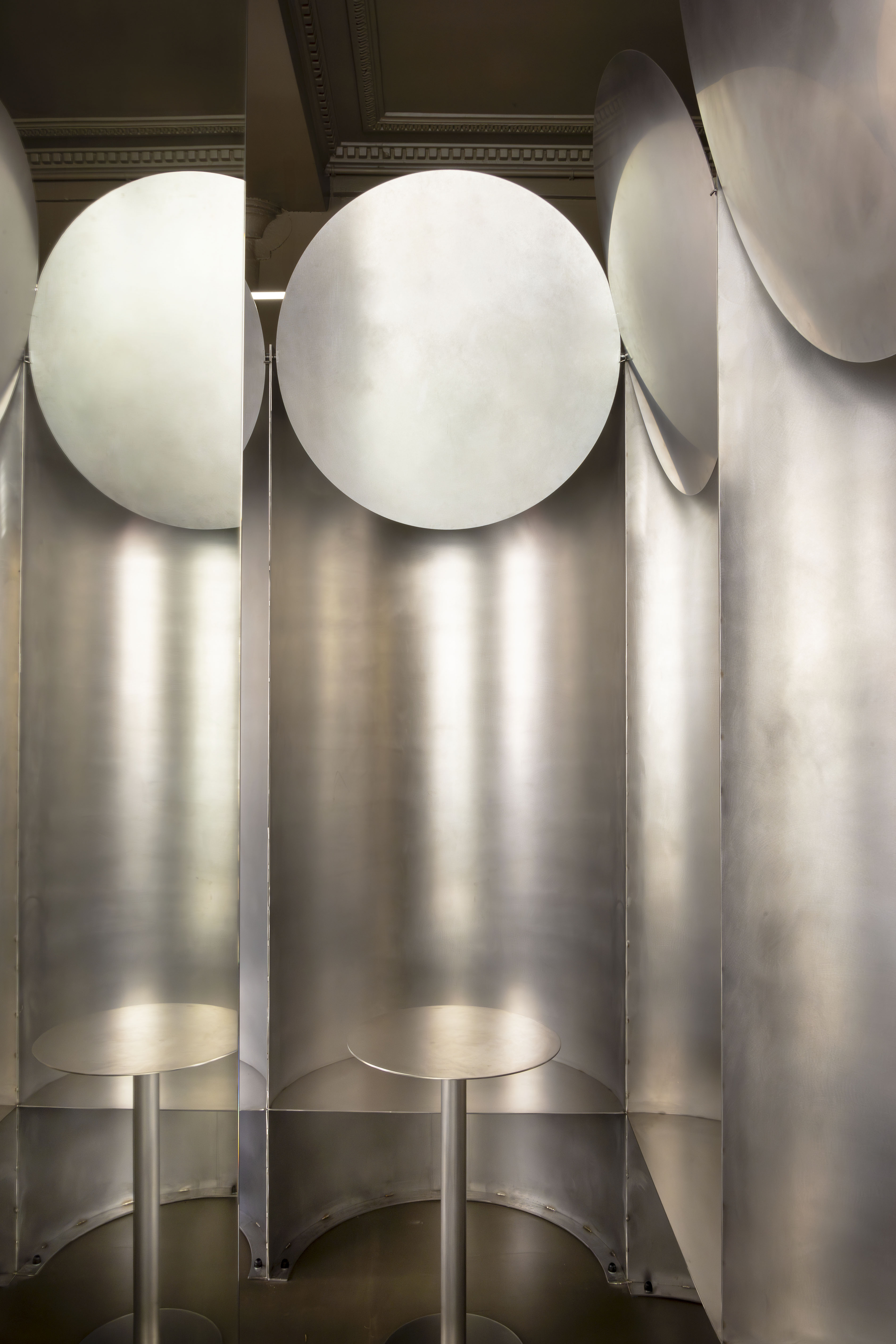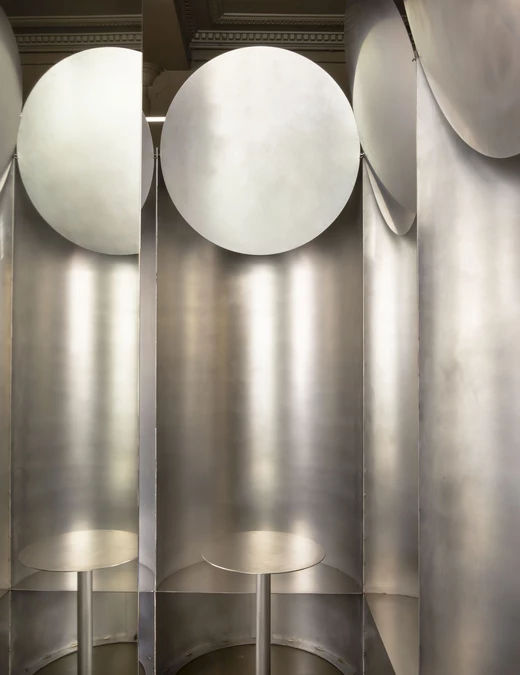 Te nietypowe nisze gwarantują gościom prywatność, nie odcinając ich jednocześnie od widoku na malowniczą ulicę za oknem. Każde stanowisko zostało wyposażone w ruchomy, stalowy dysk umieszczony nad siedziskiem, który służy jako reflektor światła neonowego, pozwalając odwiedzającym na samodzielne kształtowanie nastroju.