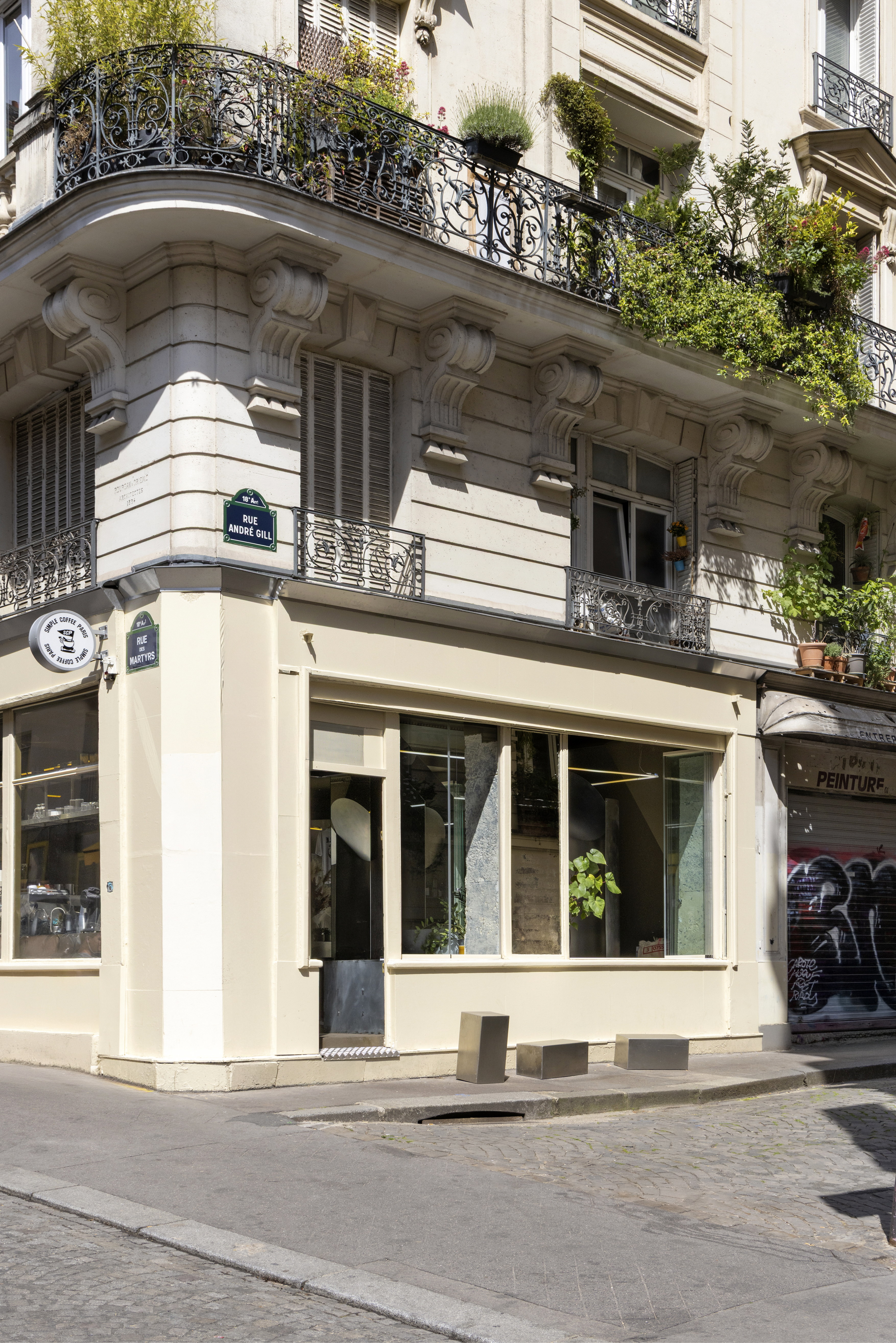 Kawiarnia zajmuje całe pomieszczenie, a zaplecze kuchenne ukryte zostało w piwnicy, skomunikowanej z parterem za pomocą krętych stalowych schodów. Aby podkreślić dynamikę miejsca, projektanci celowo dosunęli ladę barową bezpośrednio do frontowych przeszkleń, czyniąc codzienną pracę baristów widoczną dla przechodniów zmierzających w stronę Placu Pigalle.