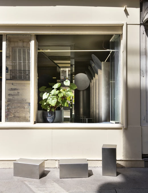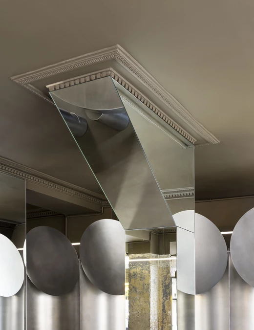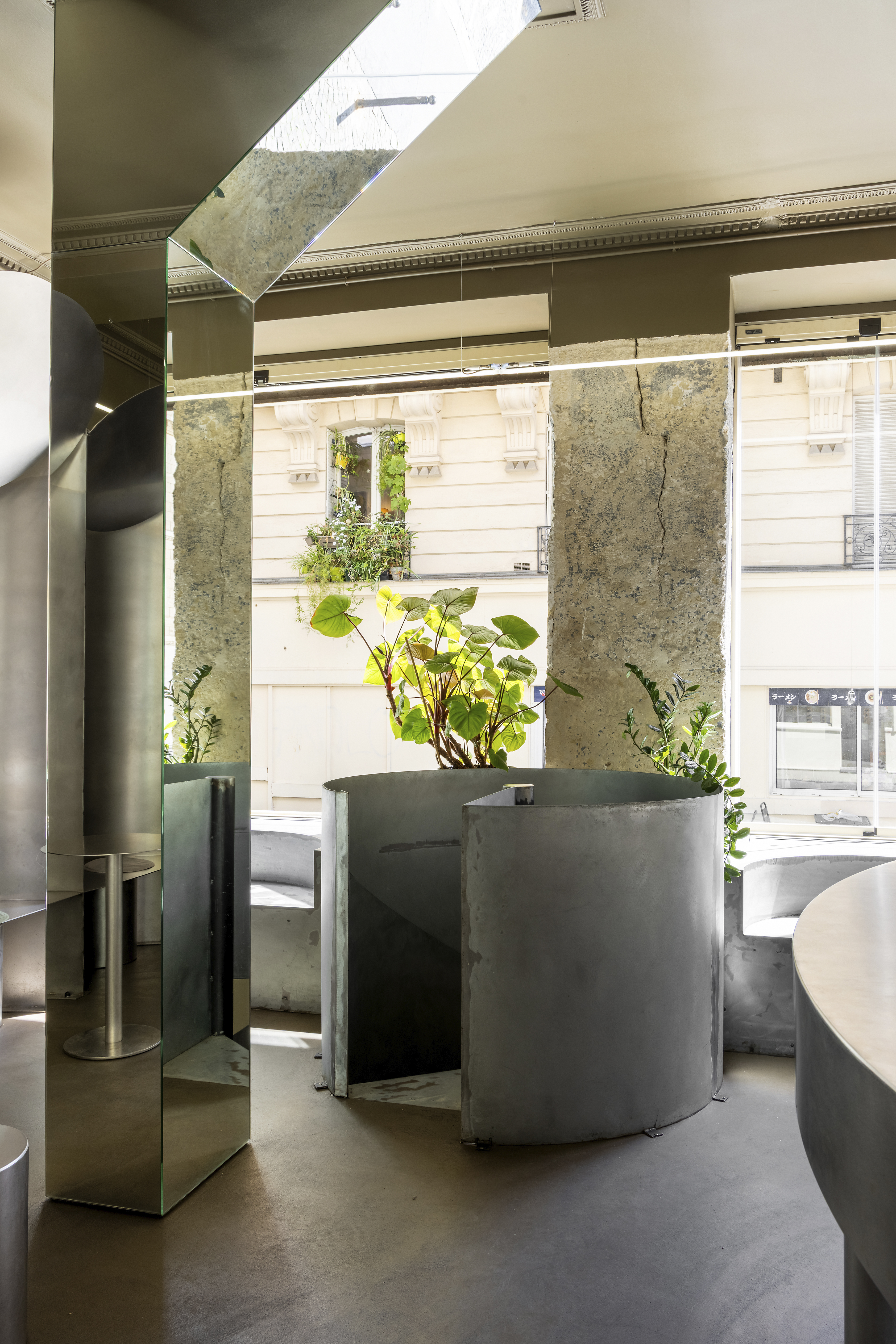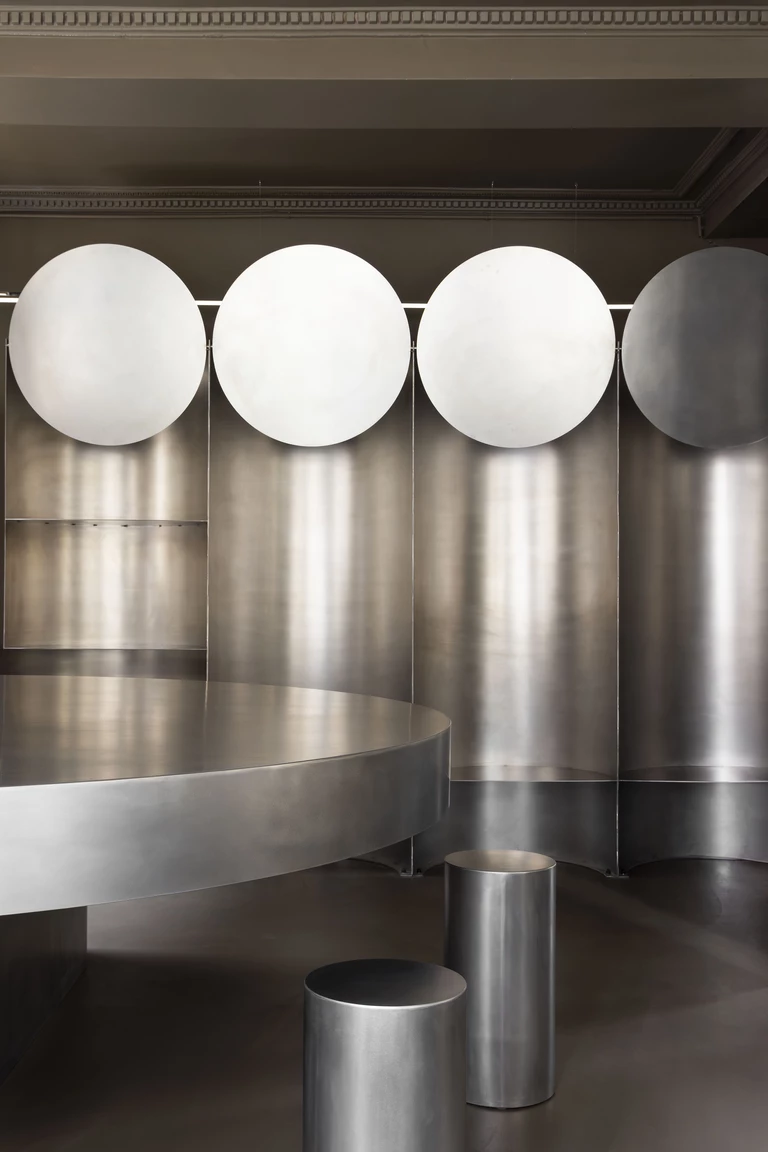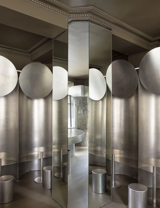 Wszystkie elementy wyposażenia zostały wykonane na wymiar, jednak to stal nierdzewna, spod ręki Martina Legueta z Atelier Héphaistos, dominuje w aranżacji. Projektanci postawili na ten materiał, bo zainspirowali się estetyką kuchni profesjonalnych oraz rolniczych silosów zbożowych. Wykorzystując maszyny do formowania blach o dużych gabarytach, zaprojektowali obłe, stalowe formy, które pełnią funkcję głębokich i komfortowych nisz do siedzenia.