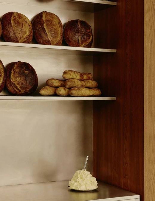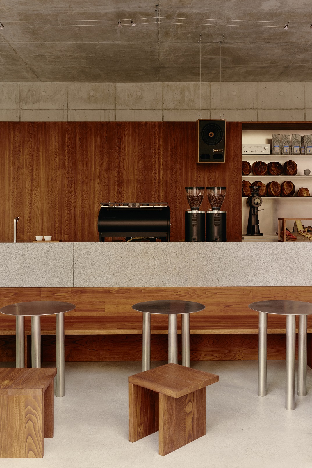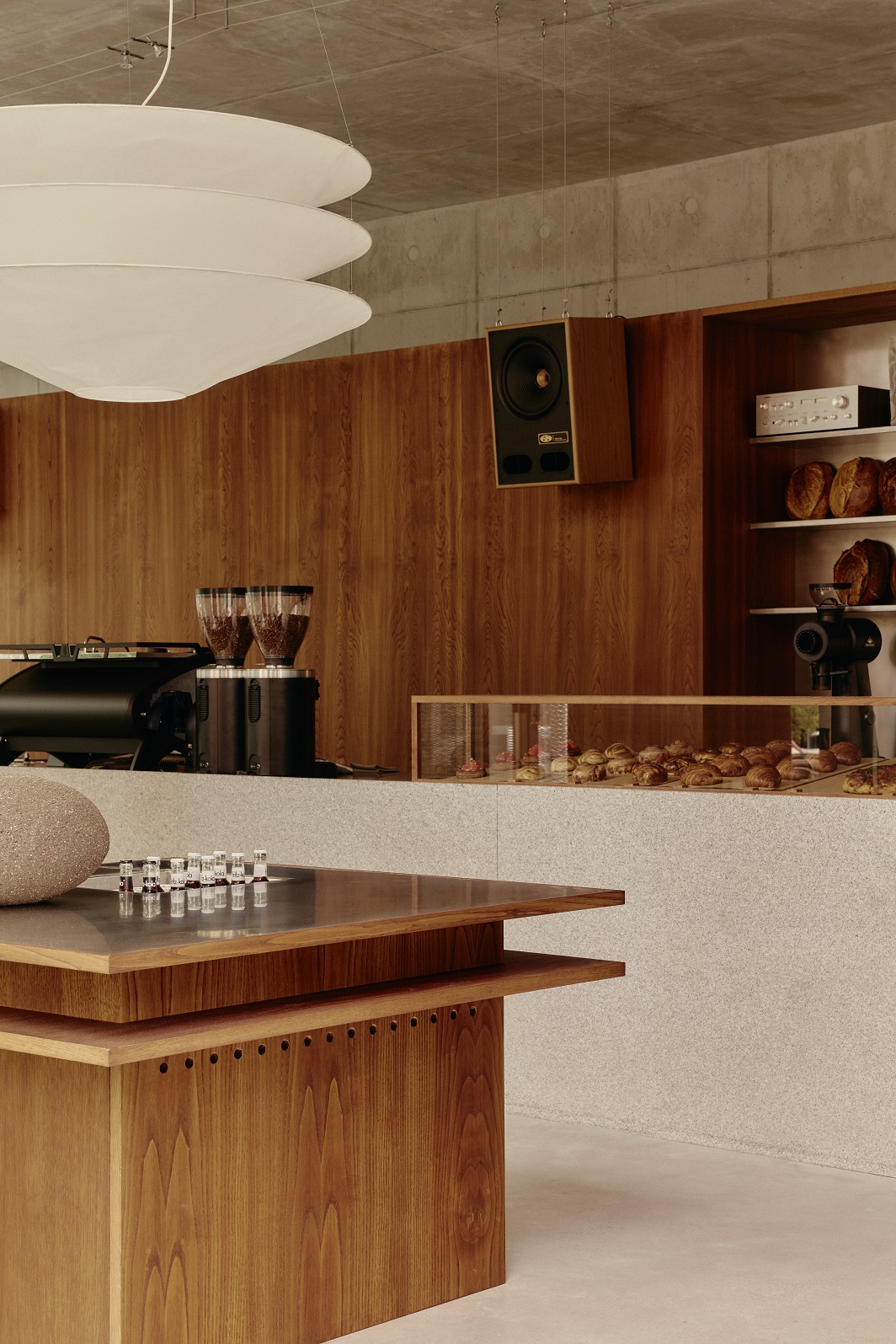 Centralnym punktem wnętrza stała się masywna konstrukcja z kasztanowca osłaniająca schody do piwnicy, mieszcząca półki na pieczywo i sprzęt barowy. Stanowi też tło dla charakterystycznych drewnianych głośników, z których płynie nastrojowa muzyka.