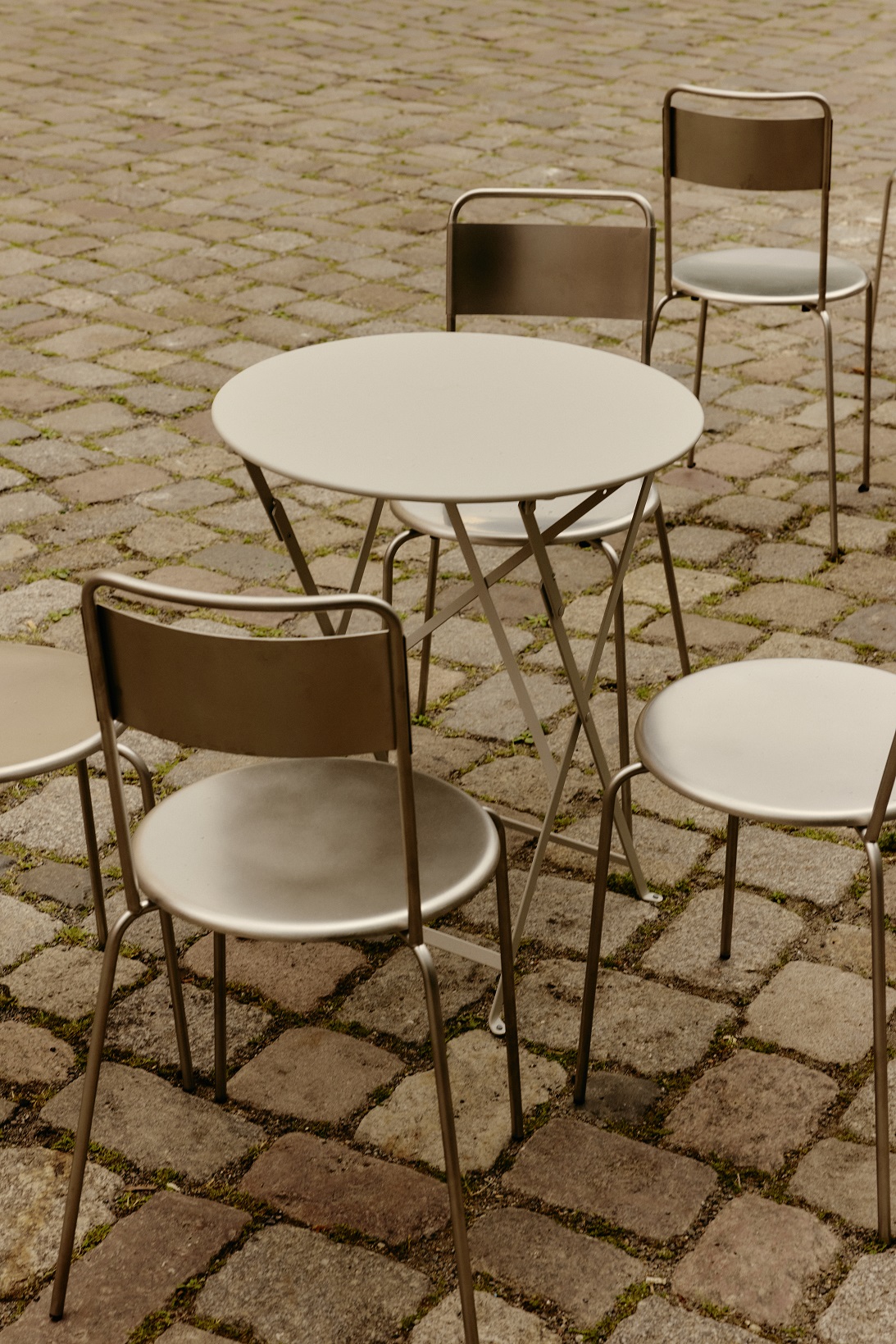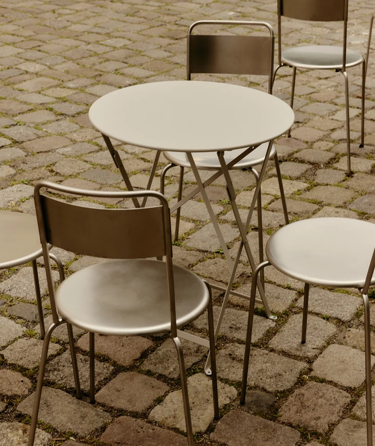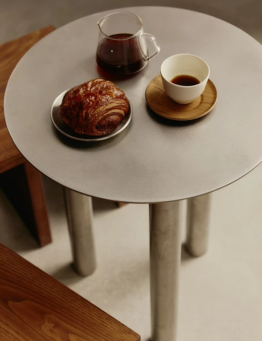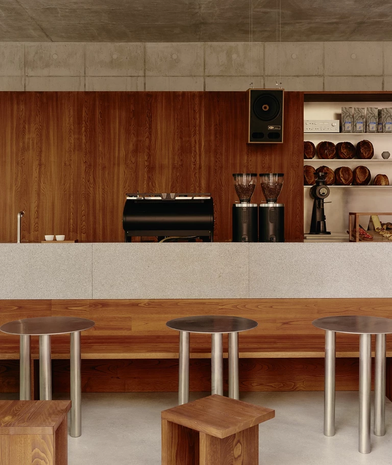 Naprzeciw drewnianej ściany umieszczono stalowo-granitowy bar – techniczny, surowy, ale pasujący do betonowego otoczenia. Jego stonowana kolorystyka sprawia, że ciepło drewna wybija się na pierwszy plan. Bliżej fasady rozmieszczono siedziska: długą drewnianą ławę i taborety oraz proste stalowe stoliki.