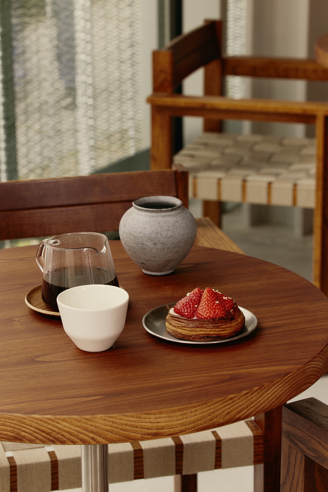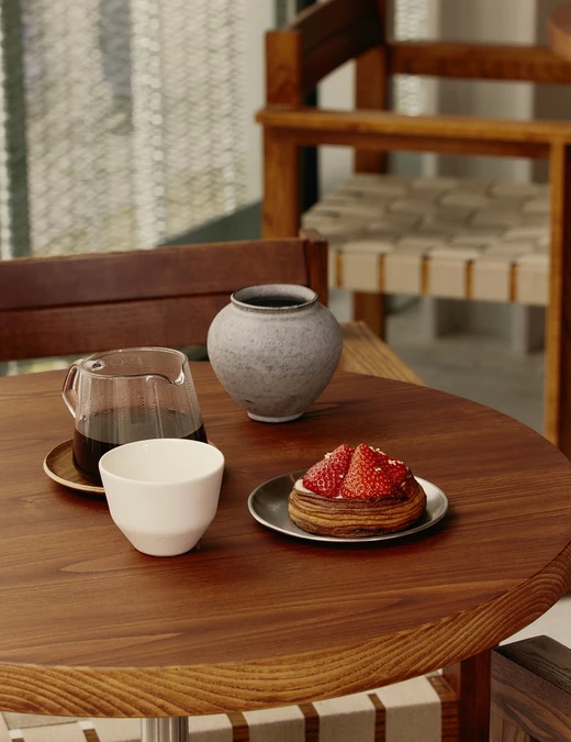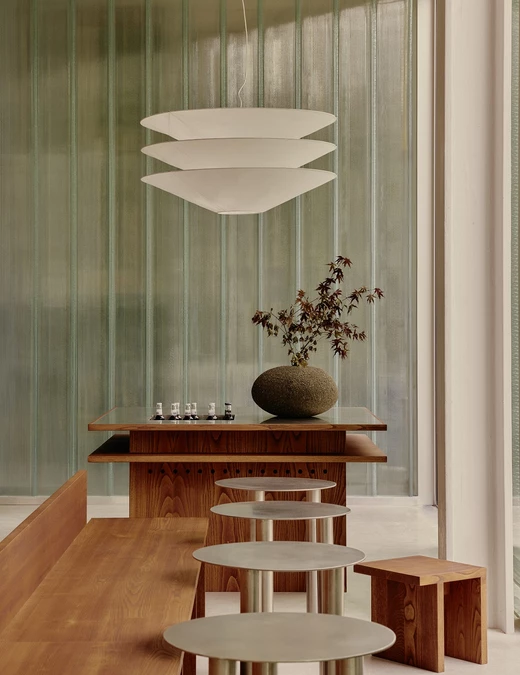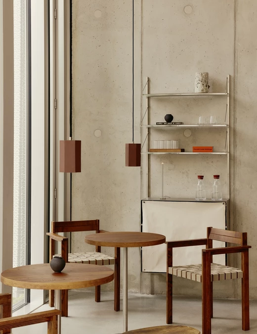 W strefie wejściowej uwagę przyciąga duży kwadratowy stół również z drewna i stali, oświetlony charakterystyczną lampą projektu Ingo Maurera. Wzdłuż okien z widokiem na park ustawiono krzesła i stoliki Framy. Całość dopełniają ceramiczne lampy autorstwa Wendy Taylor. Na końcu przestrzeni znalazł się stalowo-lniany regał Framy, na którym wyeksponowano starannie wyselekcjonowane obiekty i prace artystyczne – w tym monumentalną czarną rzeźbę autorstwa Raúla Mouro wykonaną z mieszanki kamionki i gliny.