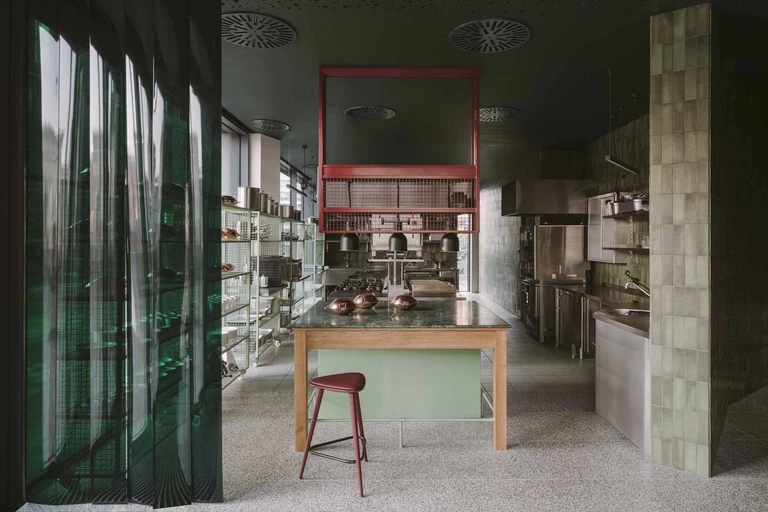 Tuż przed przekroczeniem progu restauracji zaskakuje widoczna przez szklane witryny całkowicie otwarta kuchnia, sygnalizując bezpretensjonalny charakter miejsca. Przy samym wejściu, na froncie kuchni znajduje się chef’s table, gdzie można swobodnie porozmawiać z szefem kuchni obserwując pracę całego zespołu.