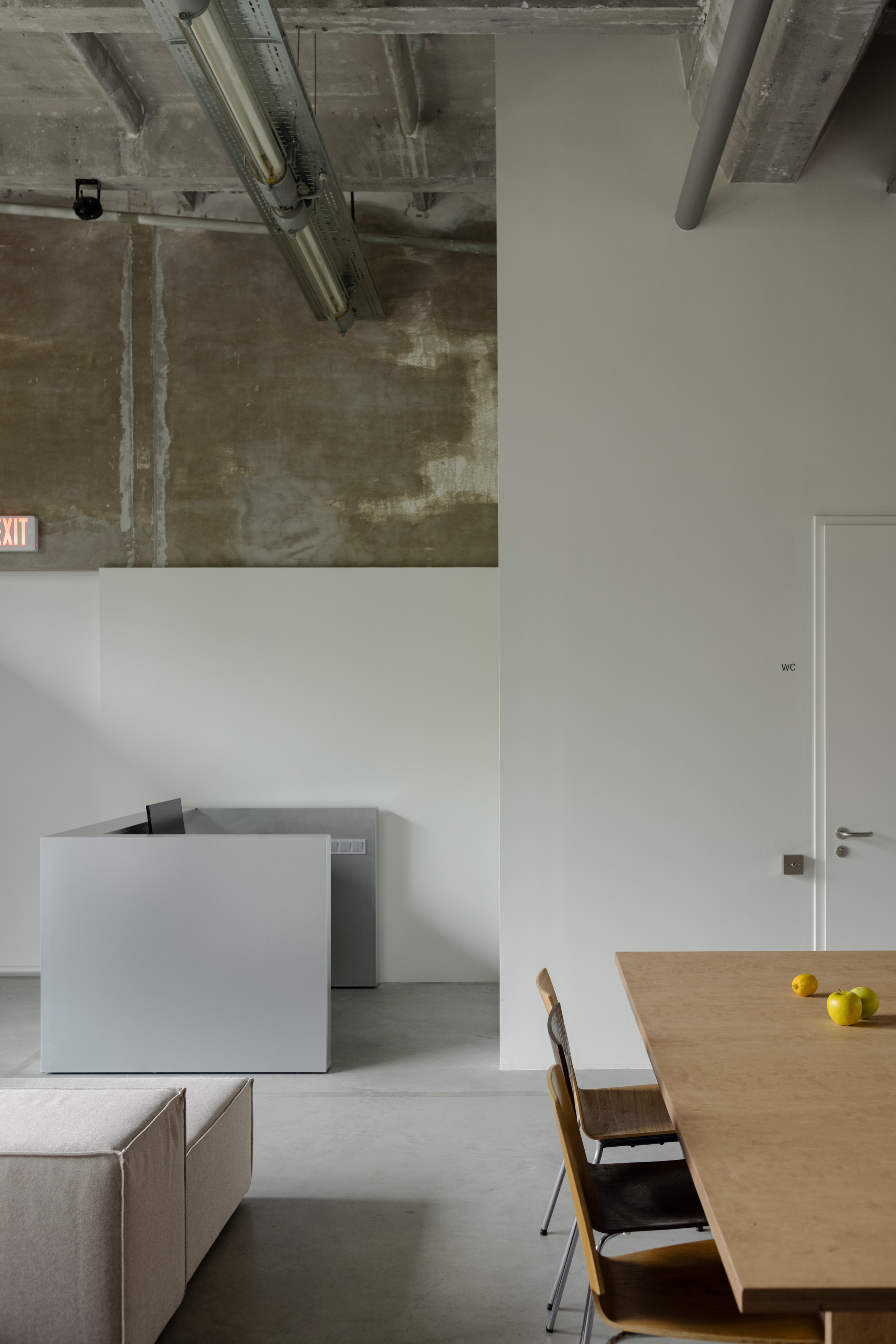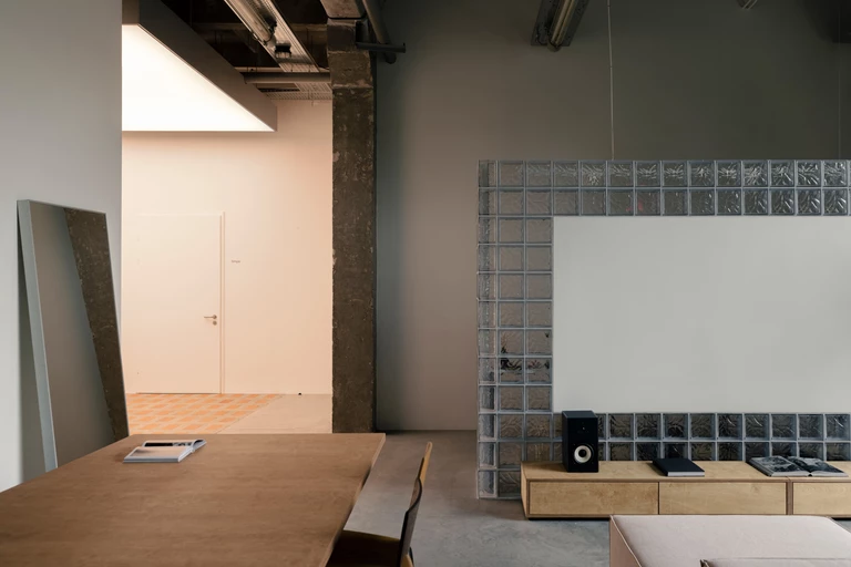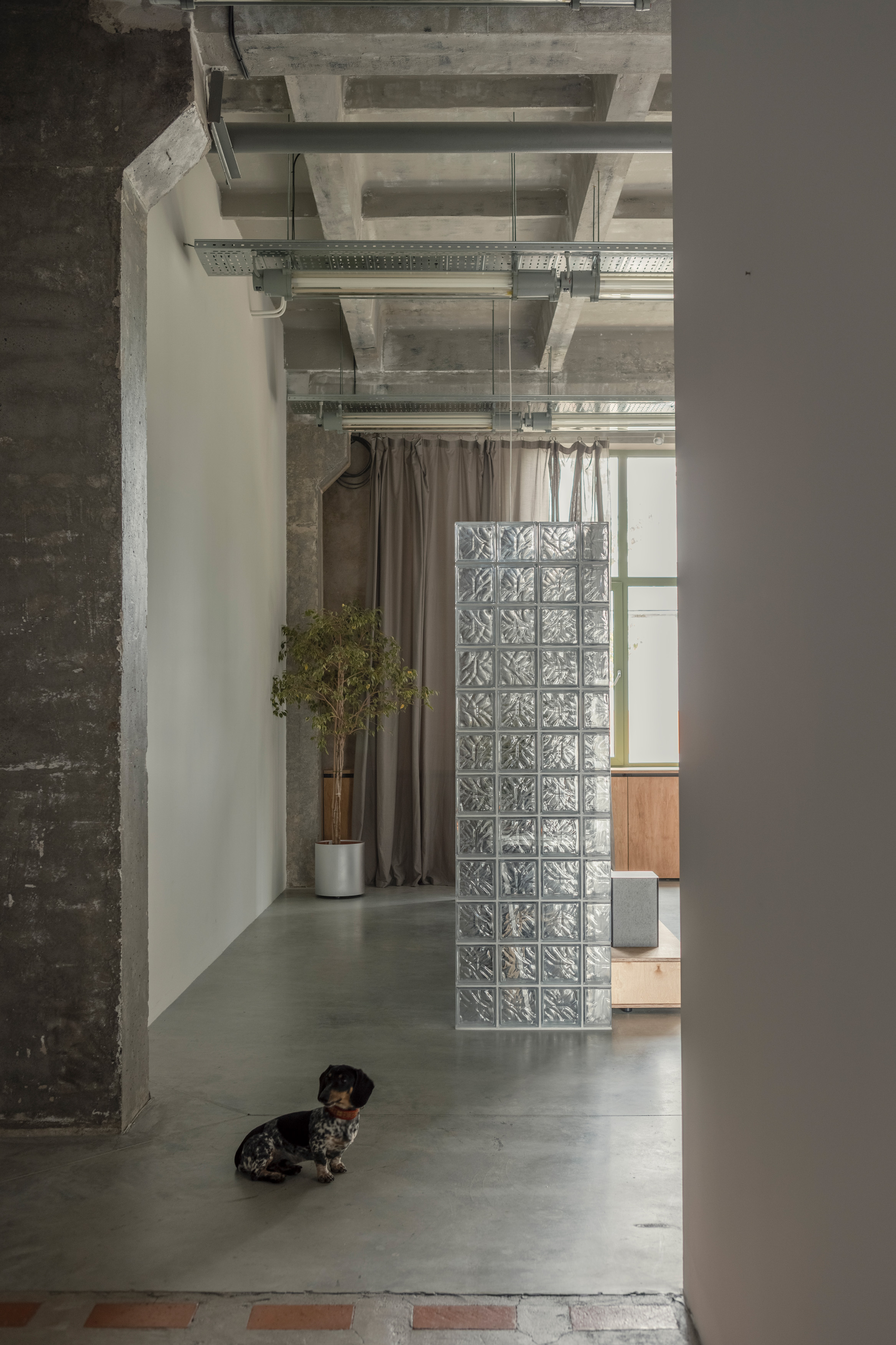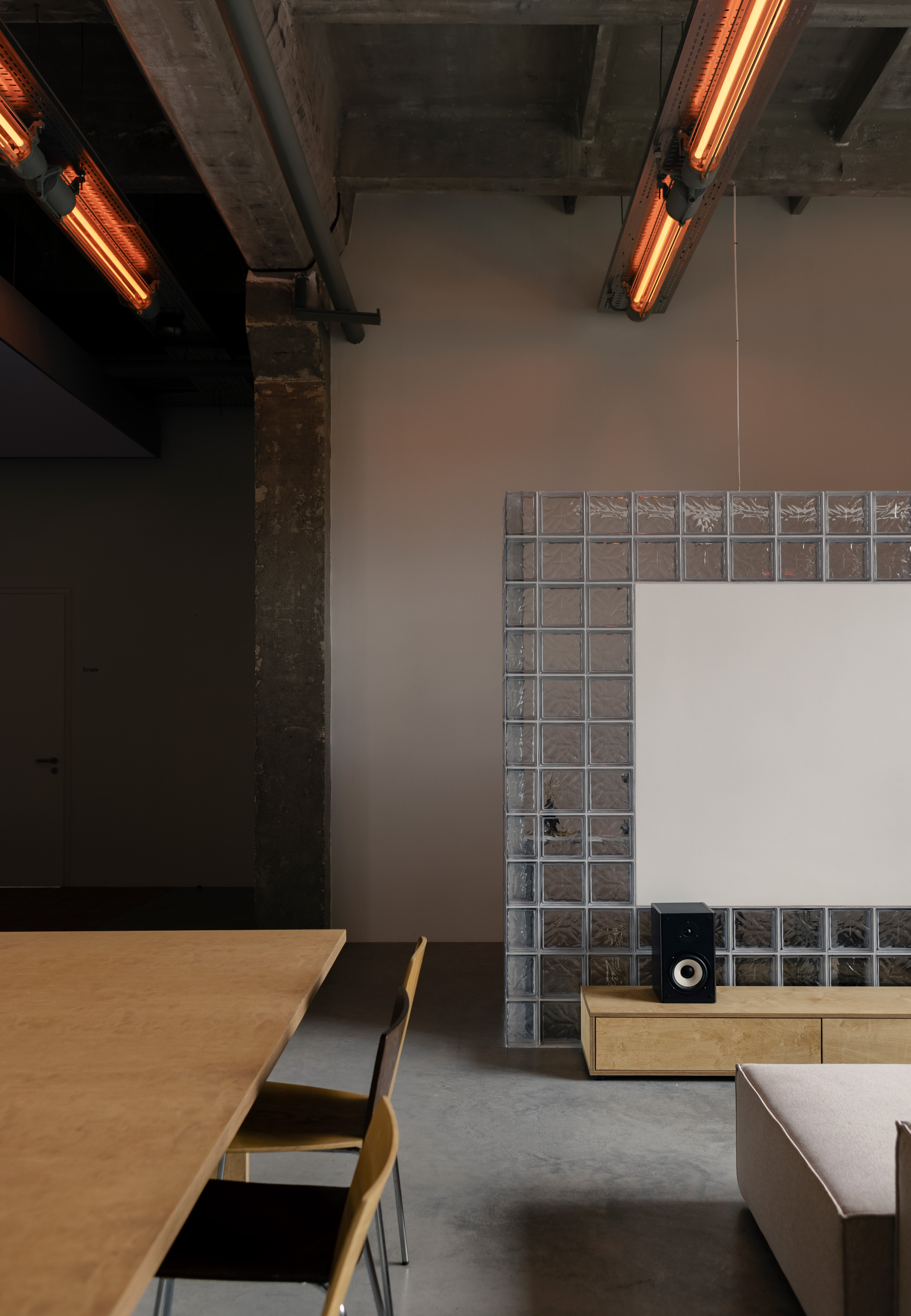 Układ funkcjonalny studia prowadzi użytkownika przez kolejne strefy. Za ścianą luksferów mieści się recepcja i szatnia, dalej lounge z miękkimi sofami i ścianą projekcyjną. Część kuchenna została obudowana stalą nierdzewną i uzupełniona dużym stołem.