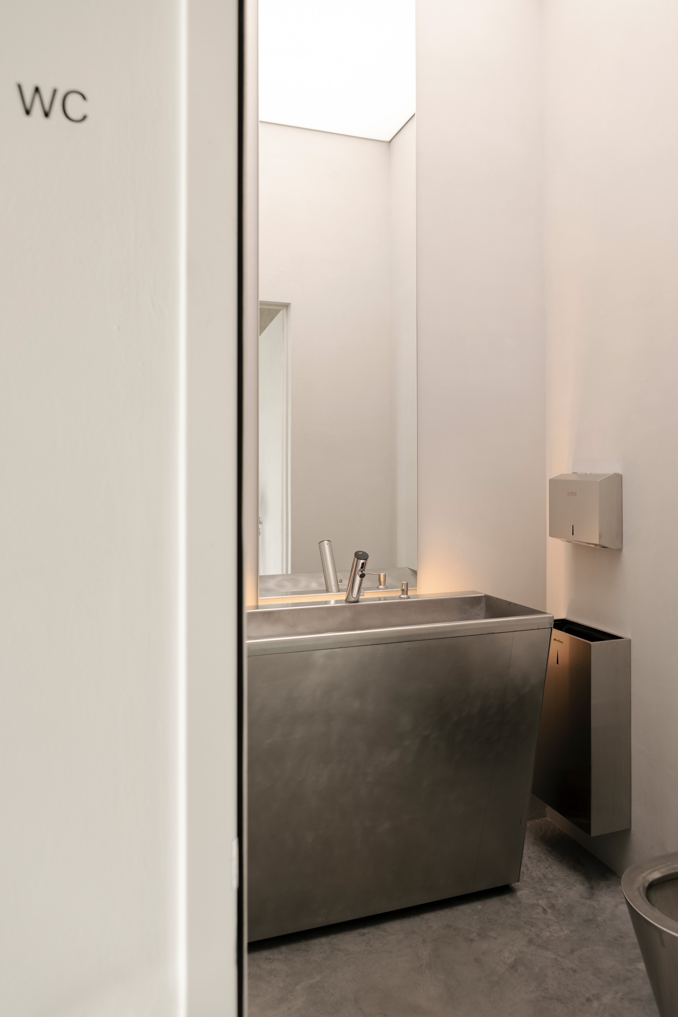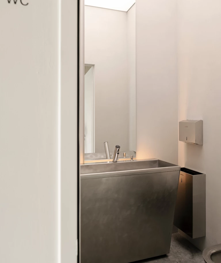 Minimalistyczne toalety zaprojektowano na wzór futurystycznych kapsuł – szarość mikrocementu, meble ze stali nierdzewnej i podświetlany sufit tworzą sterylną, a jednocześnie efektowną atmosferę.