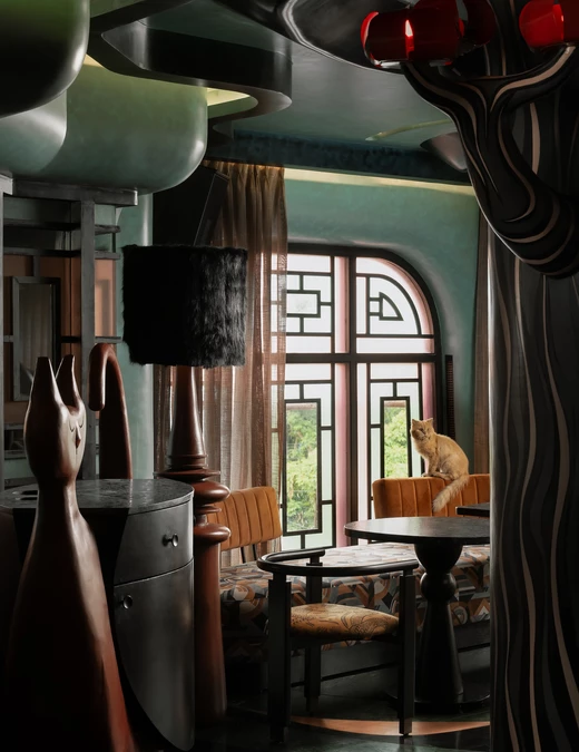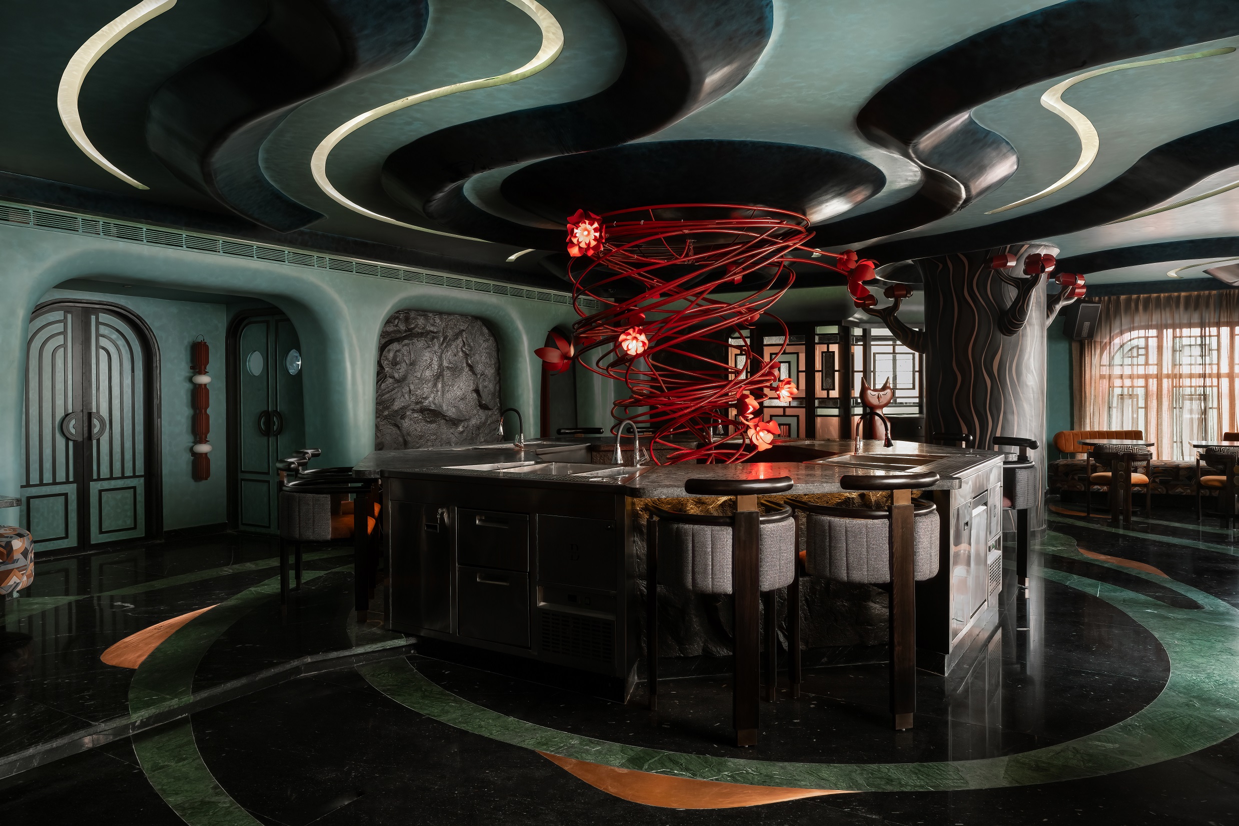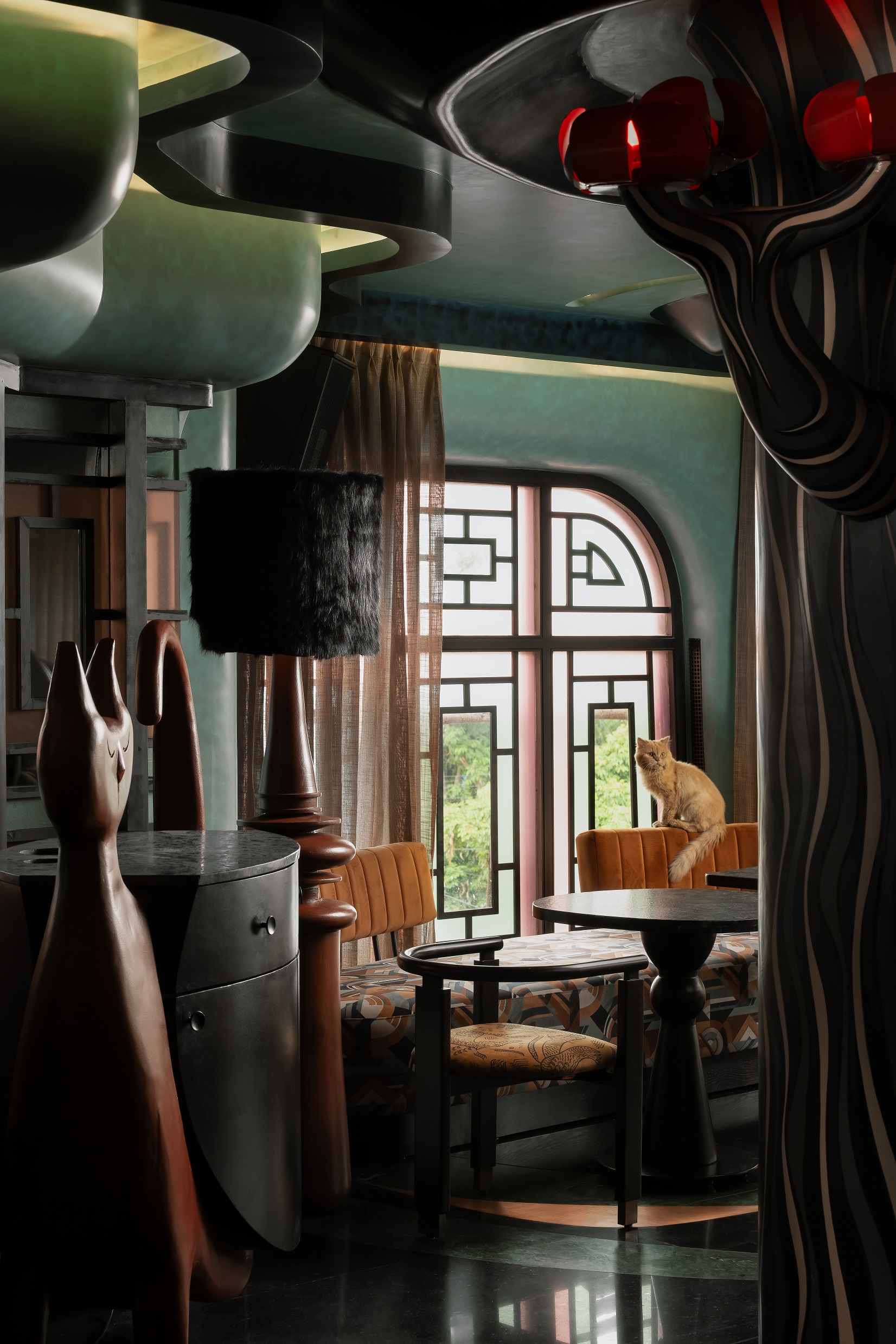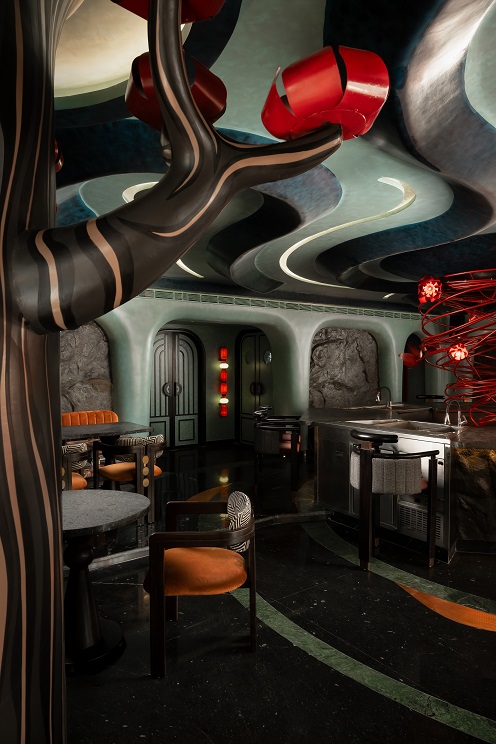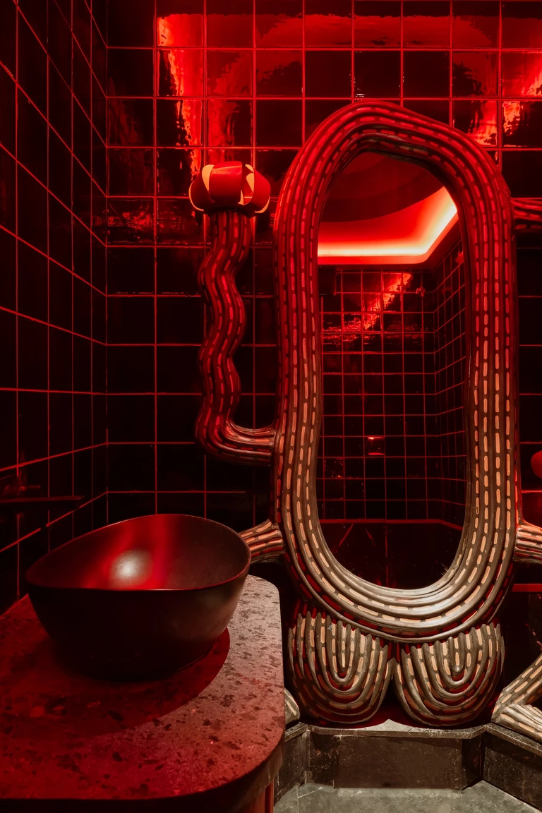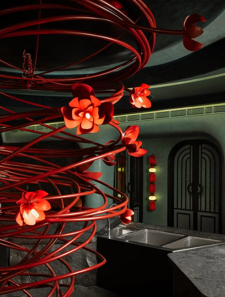Najodważniejszym elementem wnętrza jest czerwona lampa zawieszona nad ośmiokątnym barem. Od wejścia przyciąga wzrok. Jej ruch wprowadza do wnętrza zmienność i napięcie, które dobrze korespondują z energią miejsca.
