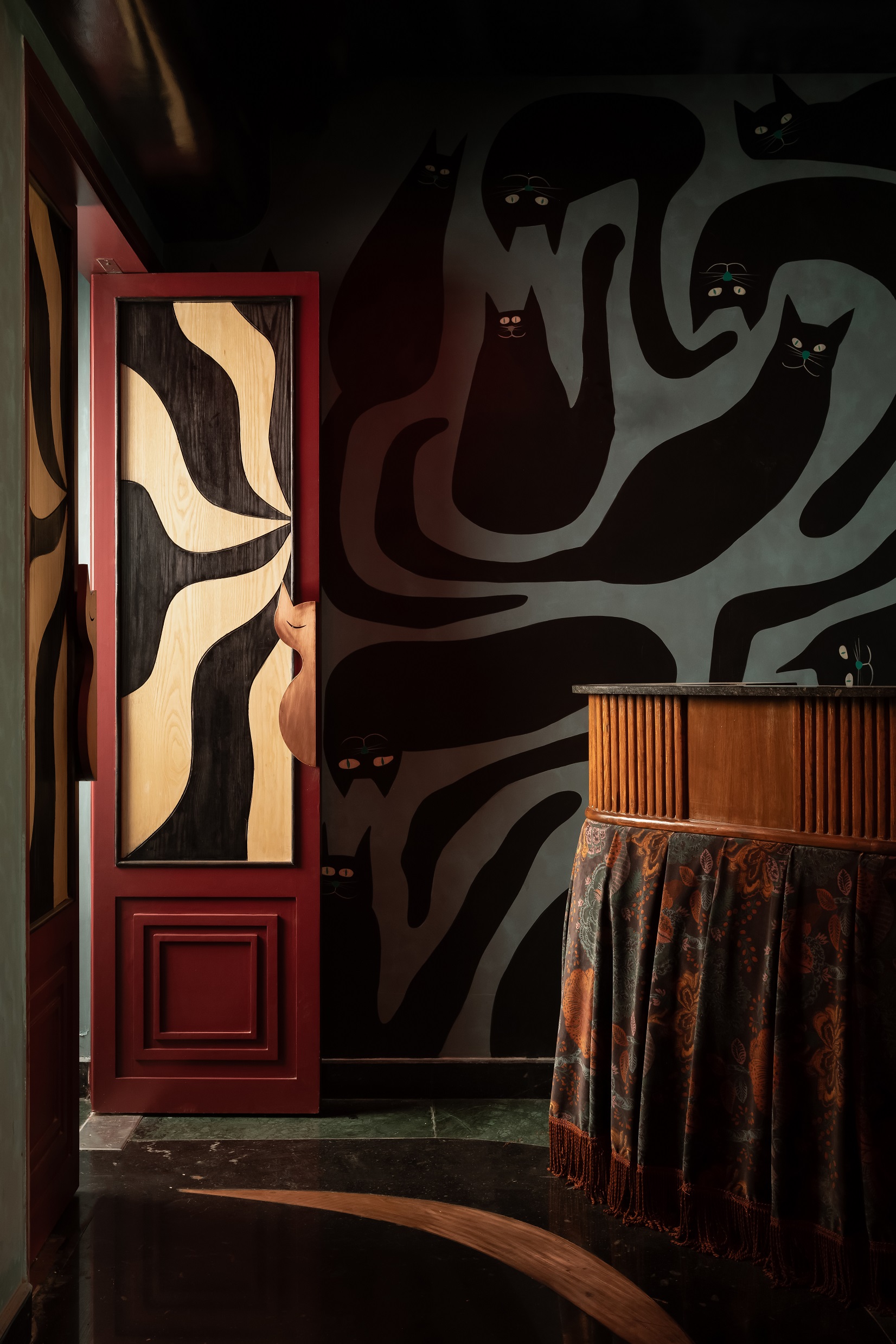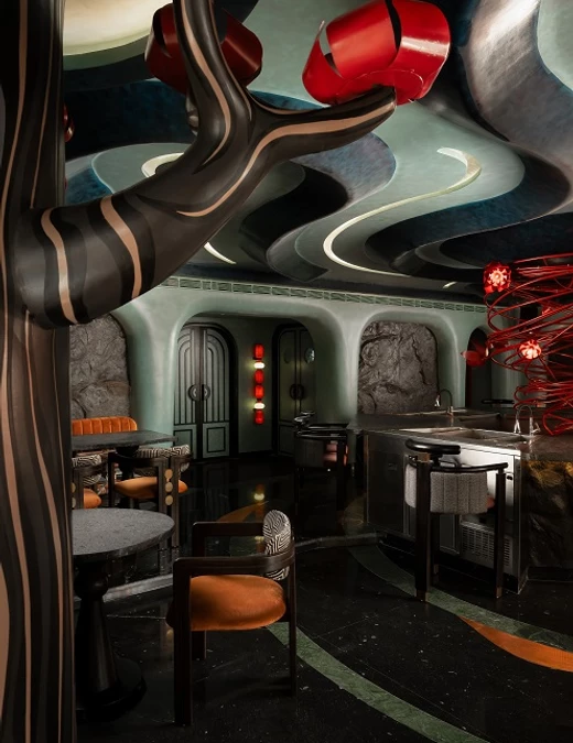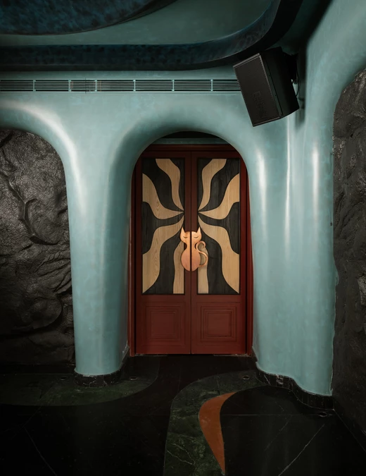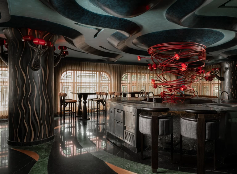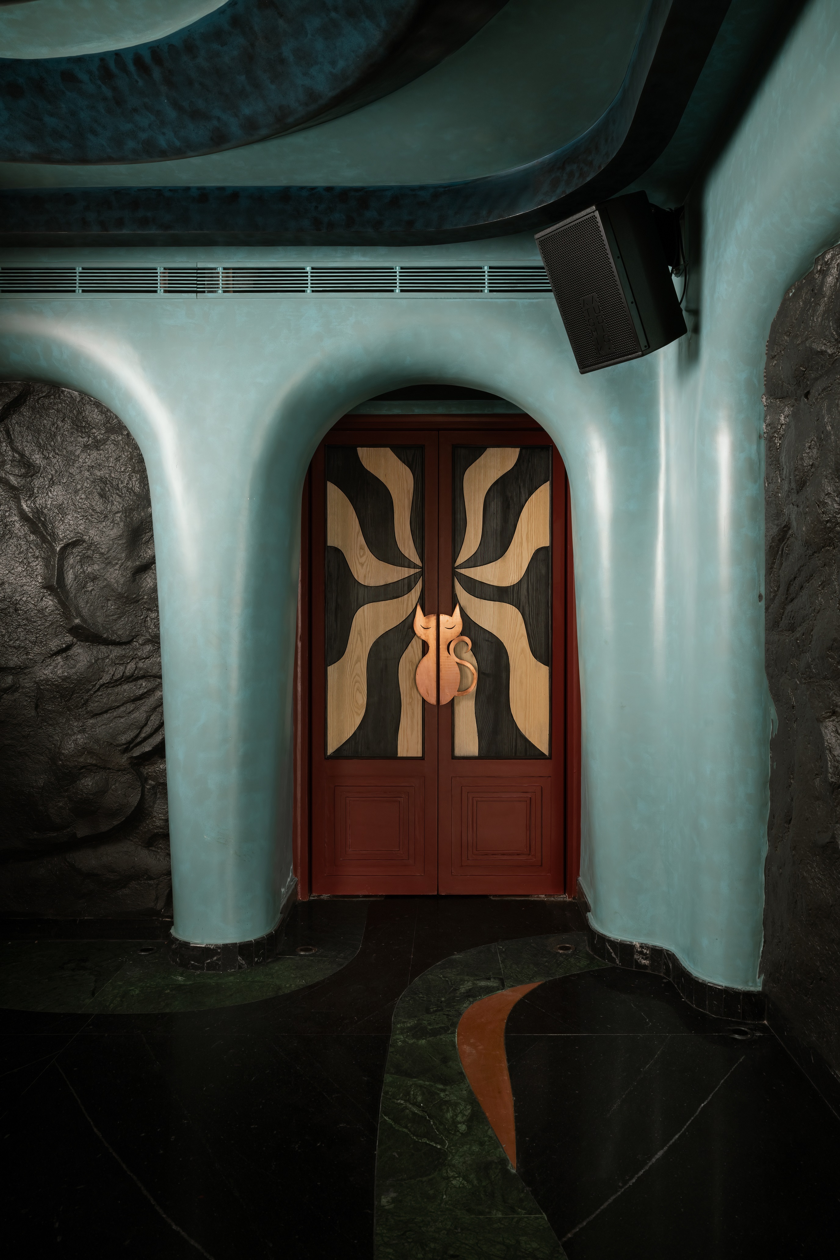 Punktem wyjścia dla całej koncepcji był koktajl Naked & Famous – wyrazisty, a jednocześnie zrównoważony, łączący nuty dymne, cytrusowe i ziołowe. Projektanci ze Studia Camarada przełożyli tę logikę na projekt wnętrza. W palecie kolorów postawili na ciepły bursztyn, antracyt, turkus i czerwień. Do tego dobrali szczotkowane metale i miękkie, rozproszone światło.