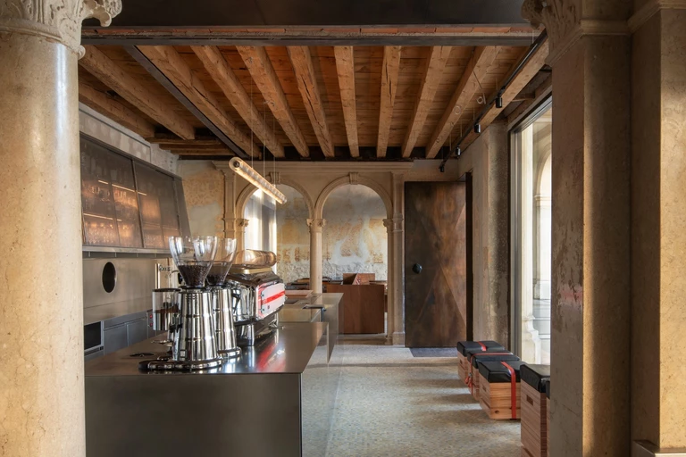 Wnętrze umeblowano specjalnie zaprojektowanymi przez Studio AMAA stołami i ławami, powstałymi we współpracy z artystą Alessandro Nerettim. Ich forma nawiązuje do estetyki Donalda Judda oraz charakterystycznych dla Nowego Jorku ławek metra. Uwagę zwracają także kontrasty. Fragmenty dawnych polichromii, odsłonięte spod kolejnych warstw tynków, pozostawiono w surowym stanie, by wyeksponować autentyczność materiału i upływ czasu.