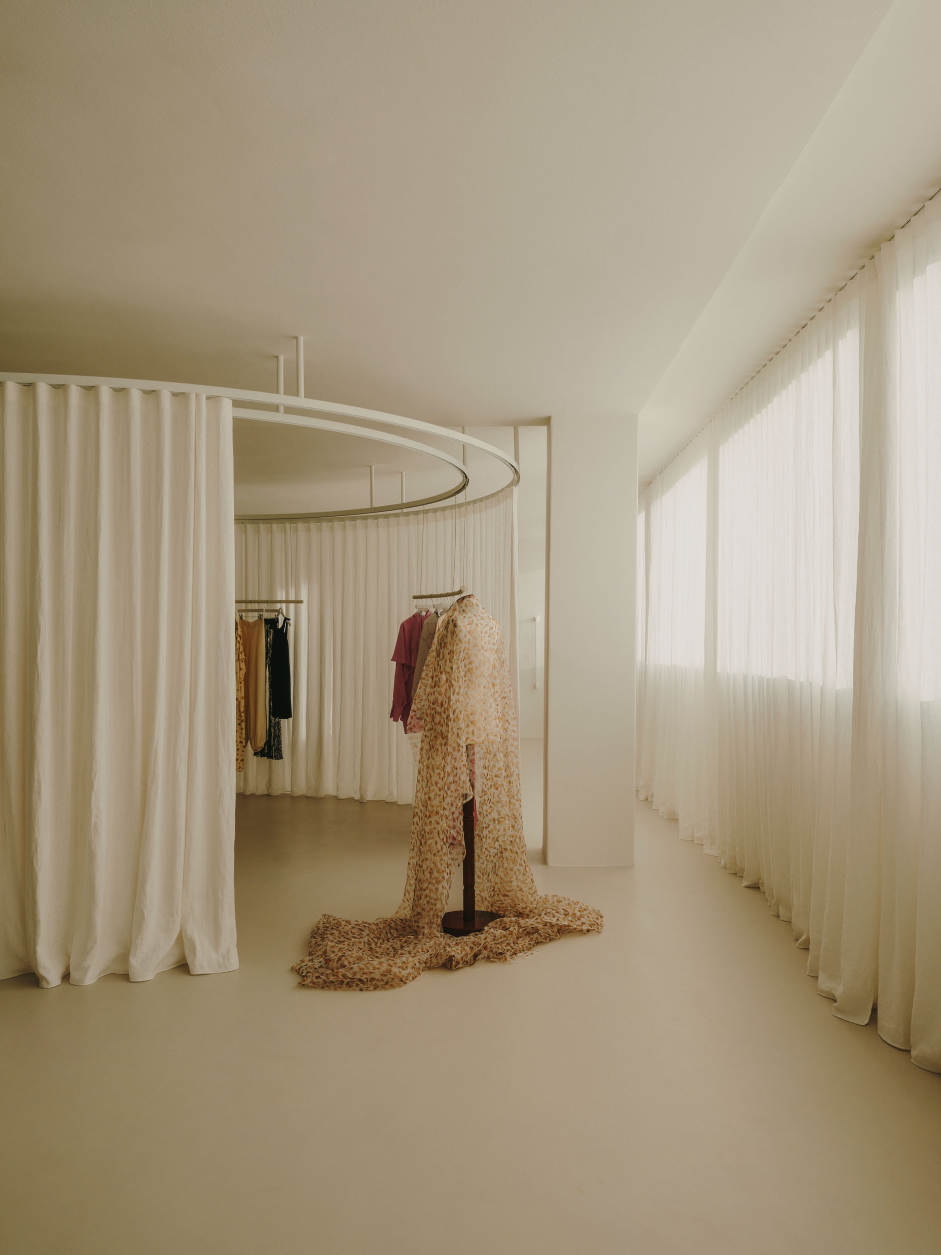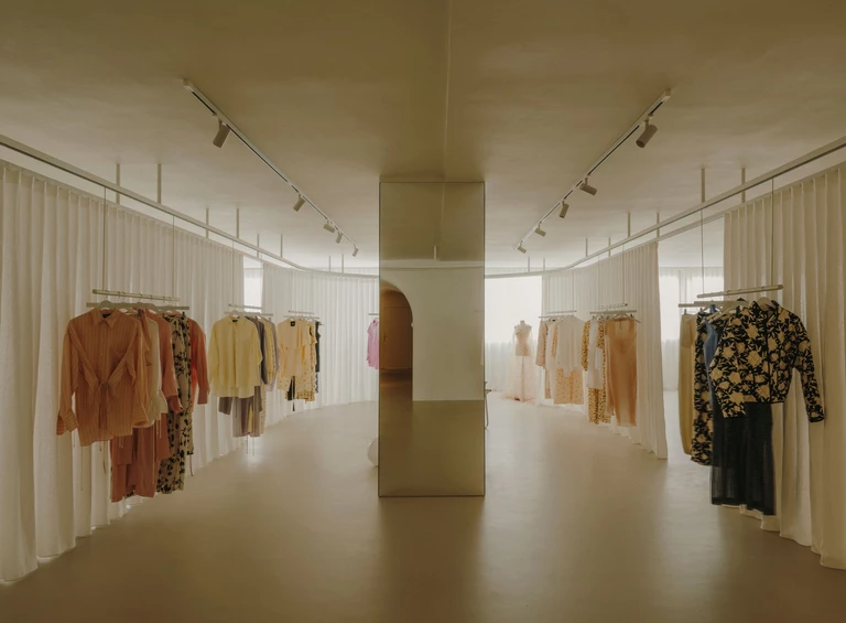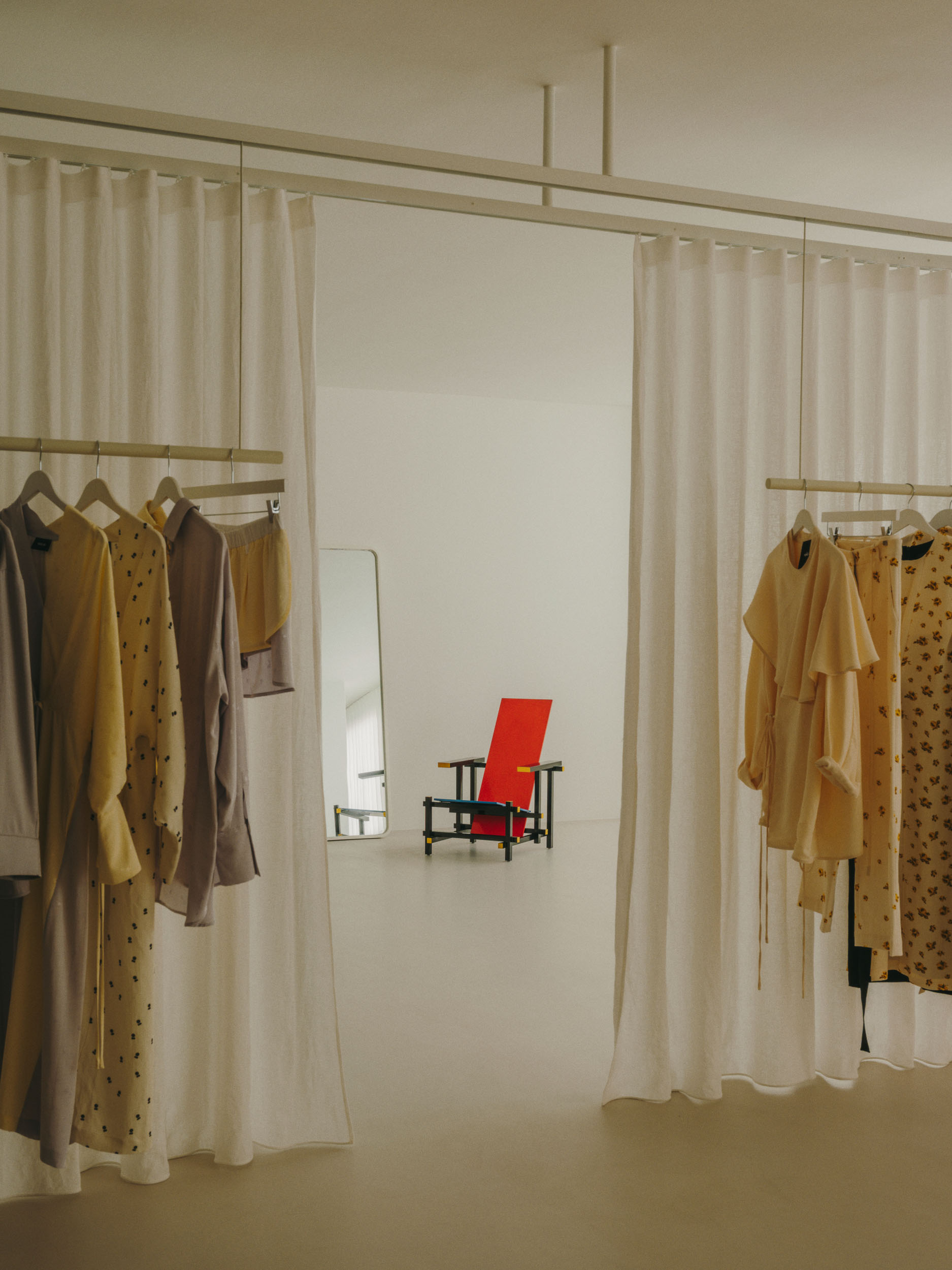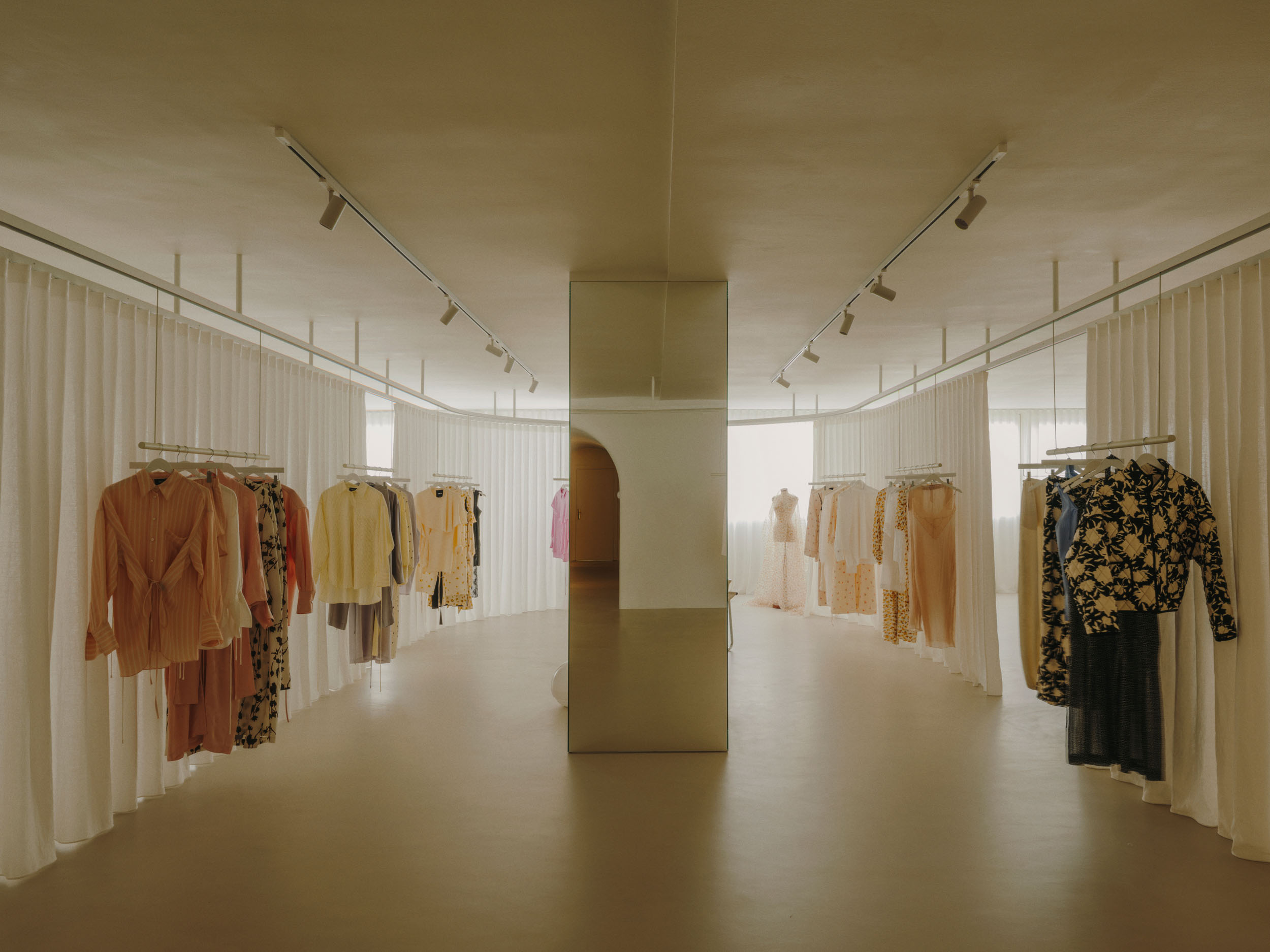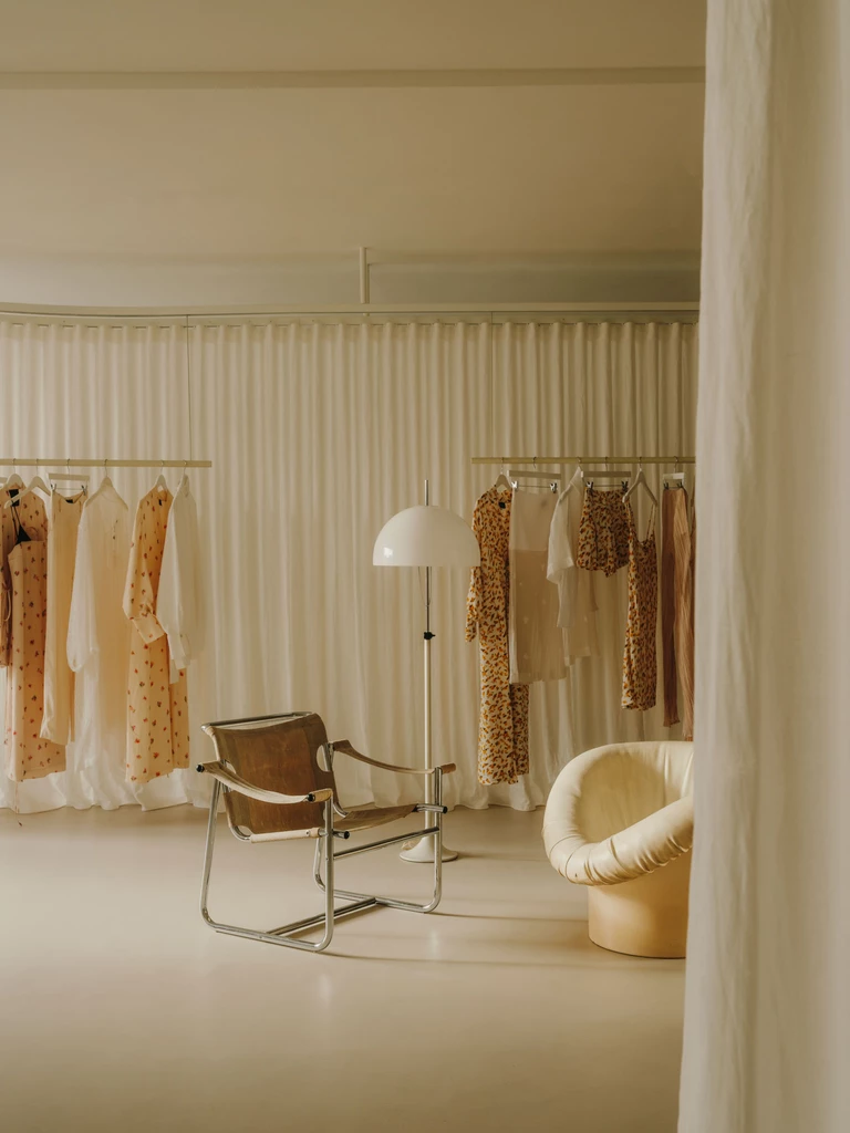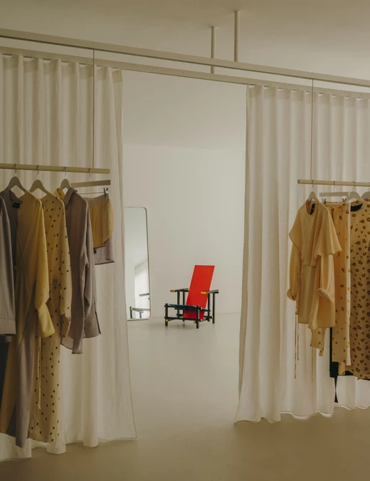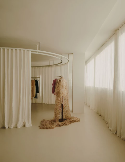 Ubrania nie wiszą w ciężkich szafach, lecz na lekkich podwieszanych konstrukcjach. Wyglądają dzieki temu zabiegowi na zawieszone w powietrzu. A to nadaje wnętrzu lekkości. Ważną rolę odgrywają tu również materiały – lustra odbijające światło i półprzezroczyste tkaniny nawiązują do eterycznego stylu kolekcji marki.