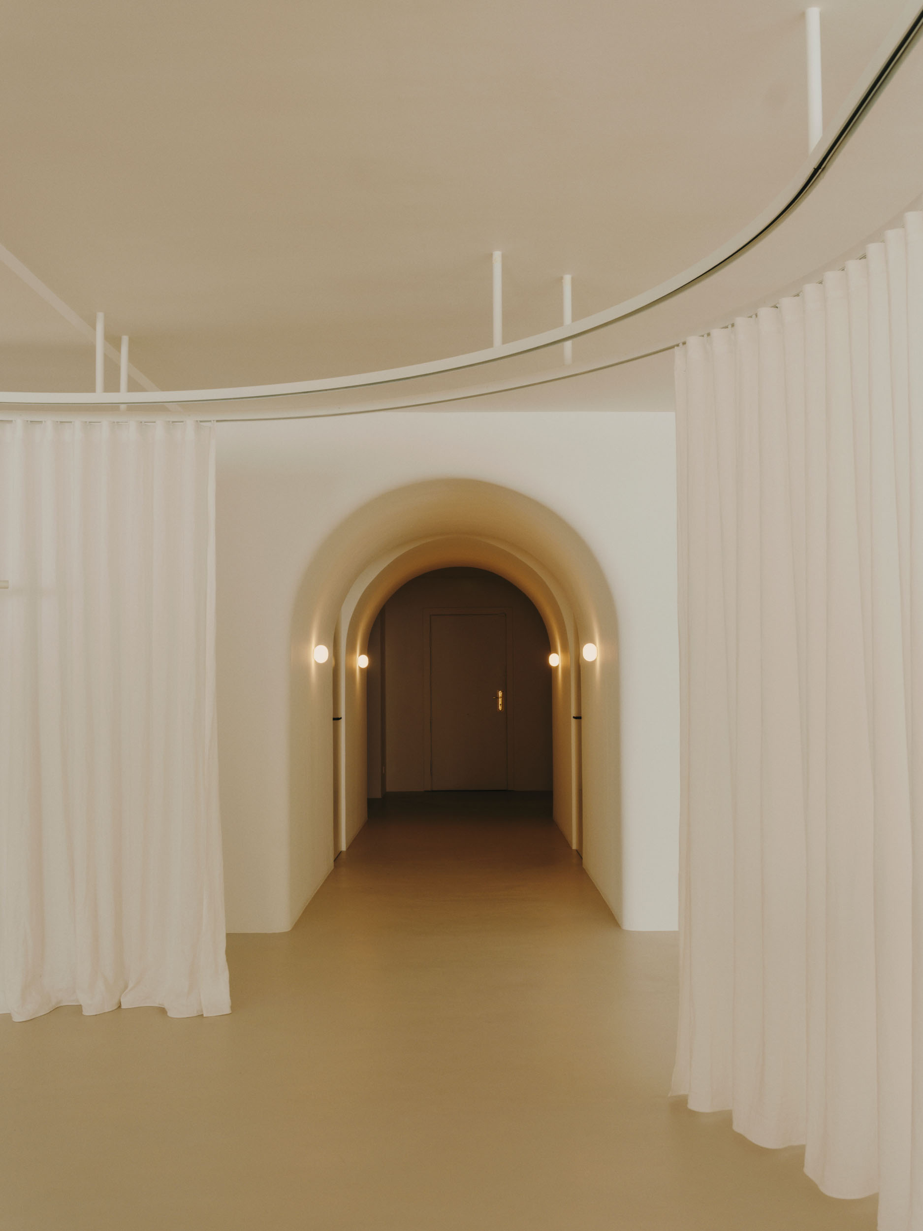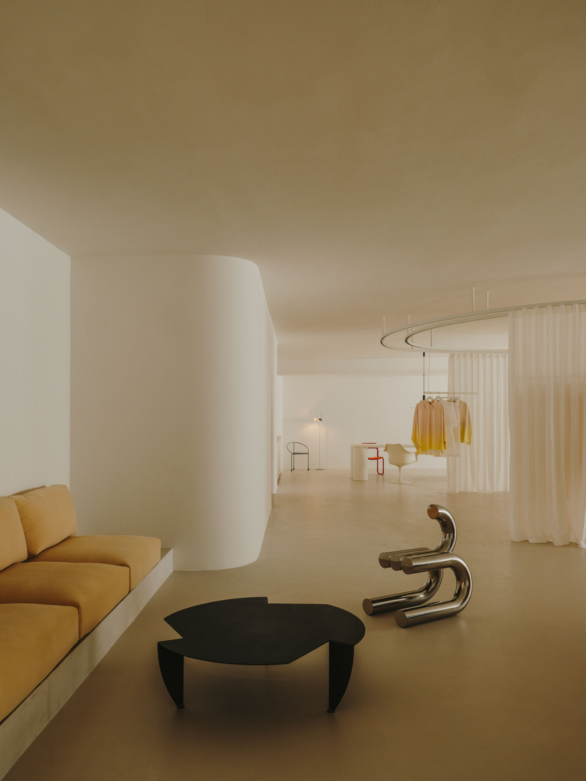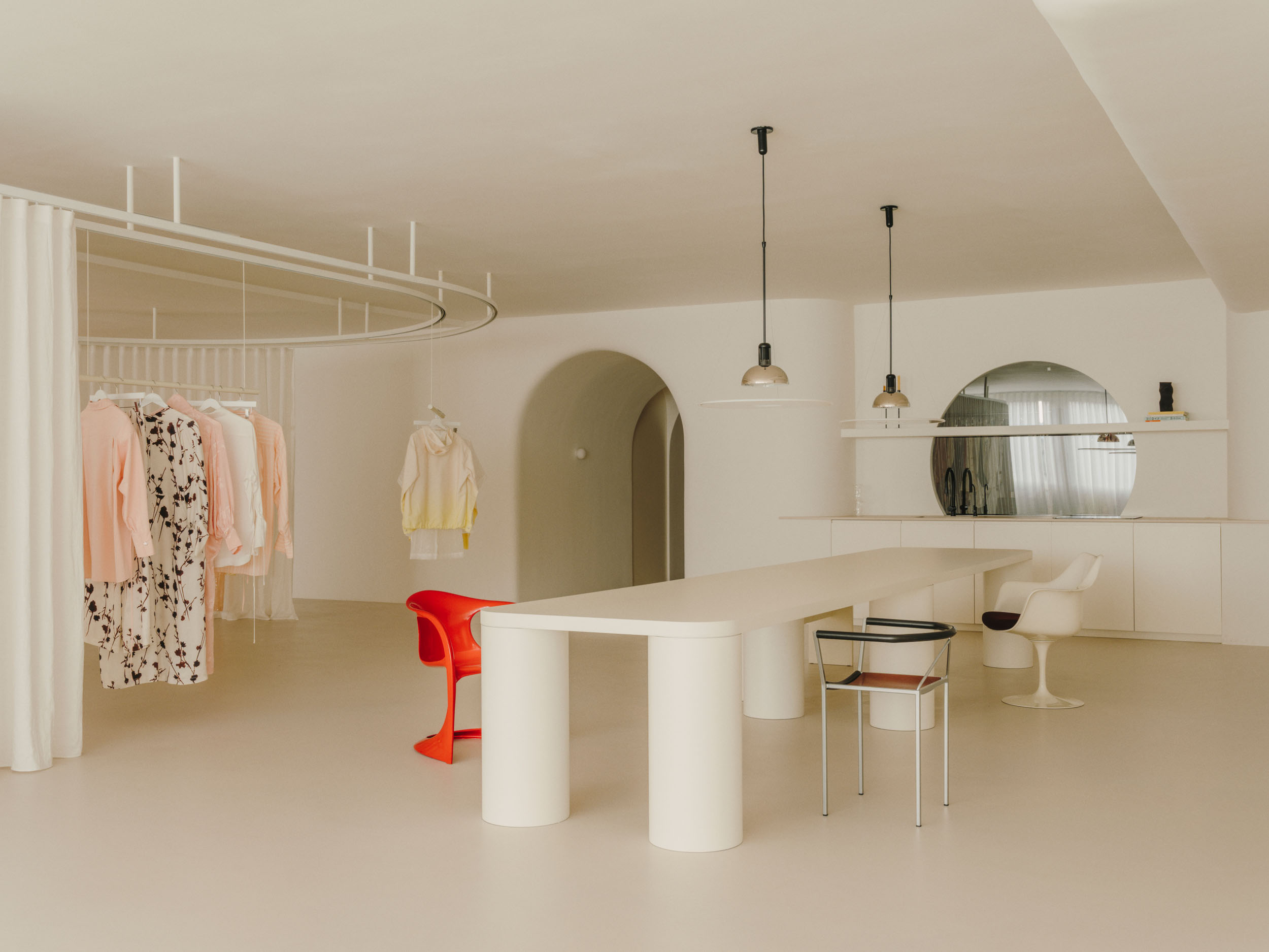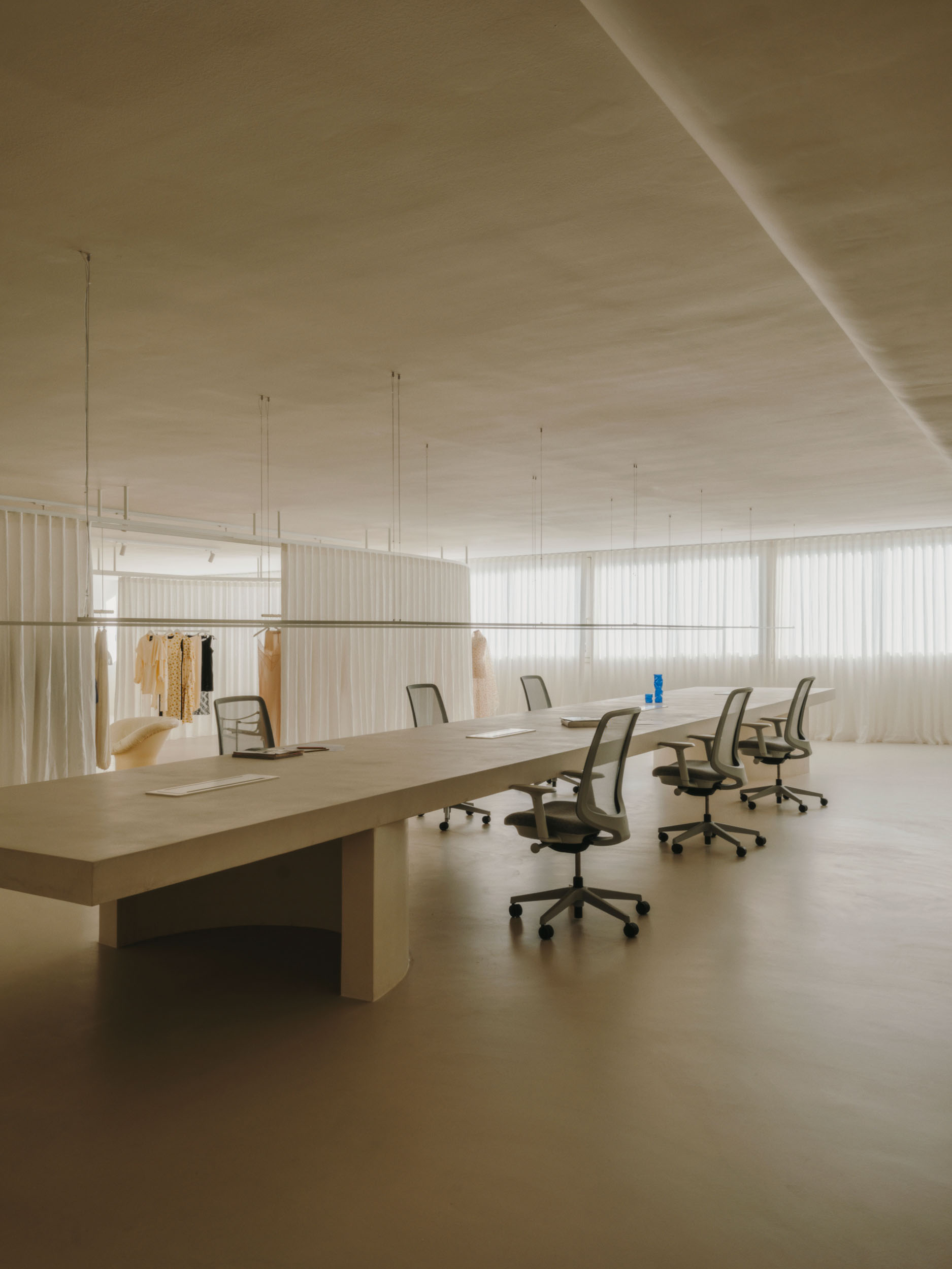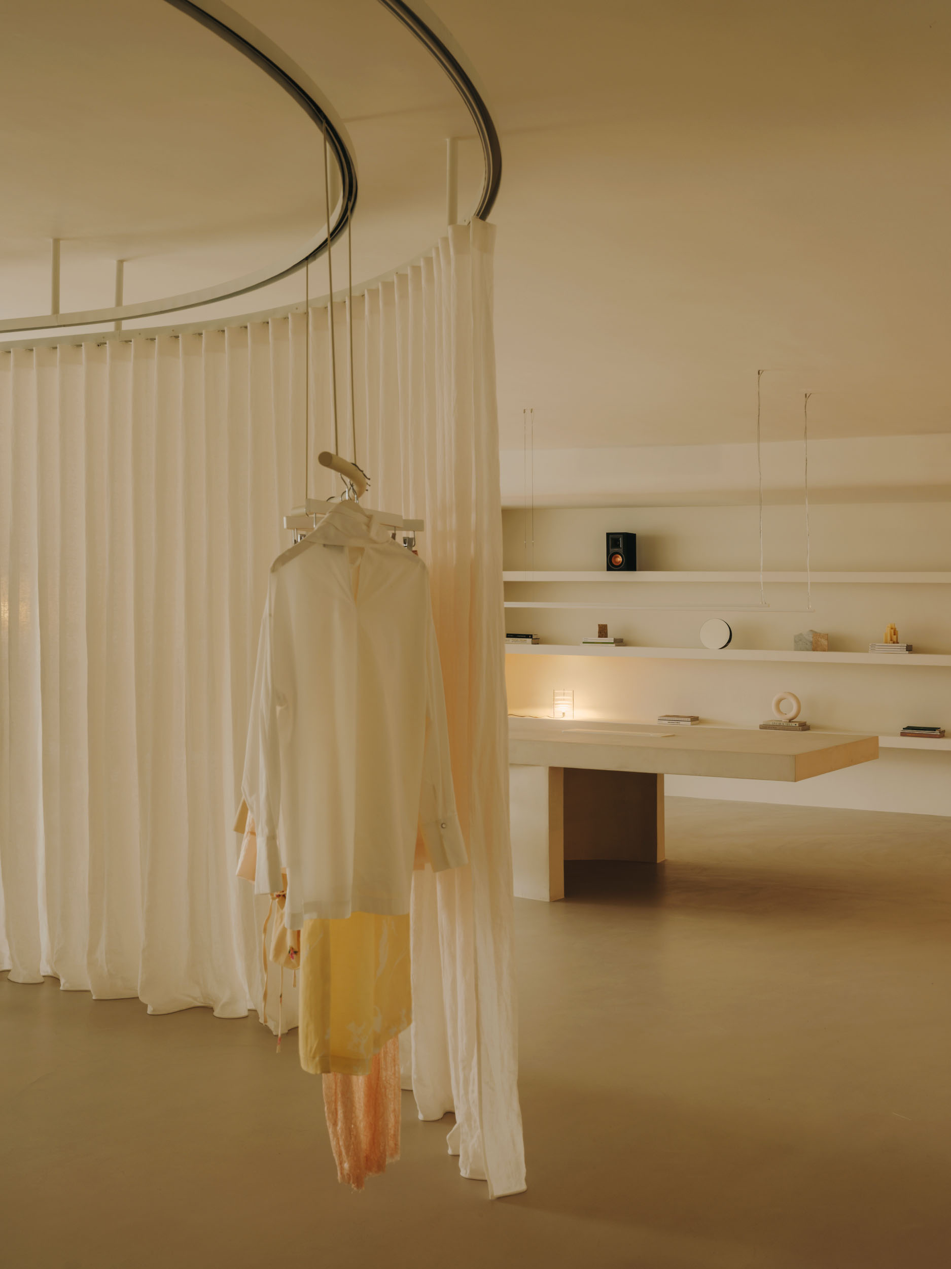 Ubrania nie wiszą w ciężkich szafach, lecz na lekkich podwieszanych konstrukcjach. Wyglądają dzieki temu zabiegowi na zawieszone w powietrzu. A to nadaje wnętrzu lekkości. Ważną rolę odgrywają tu również materiały – lustra odbijające światło i półprzezroczyste tkaniny nawiązują do eterycznego stylu kolekcji marki.