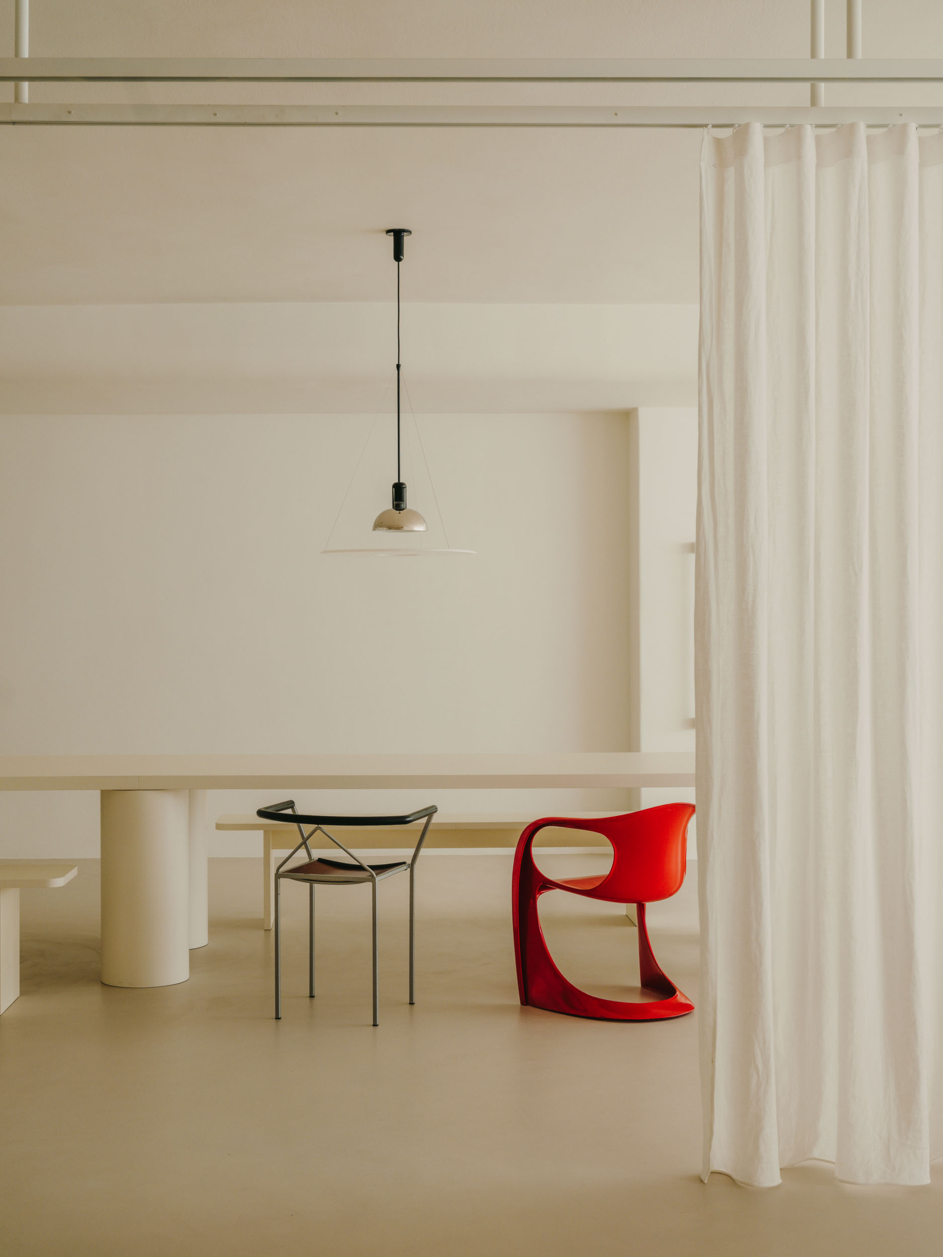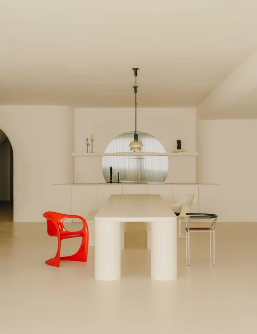 Część przeznaczona do pracy ma zupełnie inny charakter. Najważniejszym punktem jest tutaj ogromny surowy, murowany stół. Obok niego stanęła również murowana sofa oraz unikatowe krzesło zaprojektowane przez duet Sietes i Alexa Belottiego.