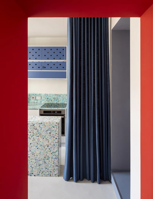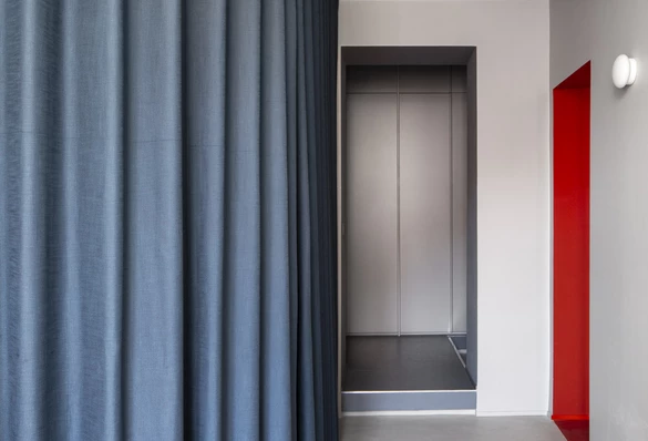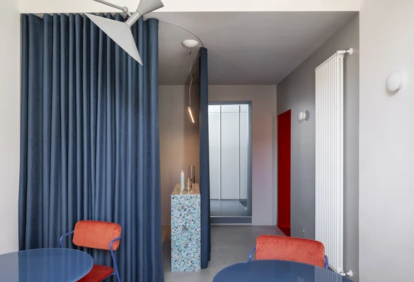 Wejście prowadzące do wspólnej kuchni i jadalni utrzymane jest w ciemnym szaro-niebieskim odcieniu. Architekci umieścili w nim kotarę, po której zamknięciu kuchnia znika z pola widzenia, a pomieszczenie zyskuje bardziej intymny charakter.