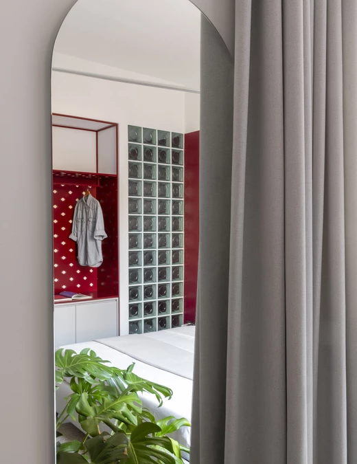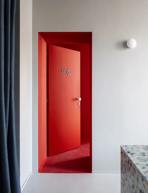 Z tej samej przestrzeni prowadzi wejście do jednego z pokoi, pomalowanego na kolor intensywnej czerwieni, która kontrastuje z błękitami wejścia i kotary.