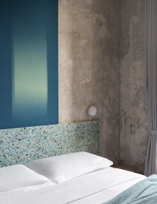 Każdy pokój ma własną paletę barw i unikatowe wykończenie z paneli Plastiz, które tworzą zagłówki i elementy mebli. Obniżone sufity kryjące klimatyzację wprowadzają subtelne zróżnicowanie wysokości i w ilości wpadającego światła, nadając wnętrzom przytulniejszy charakter.