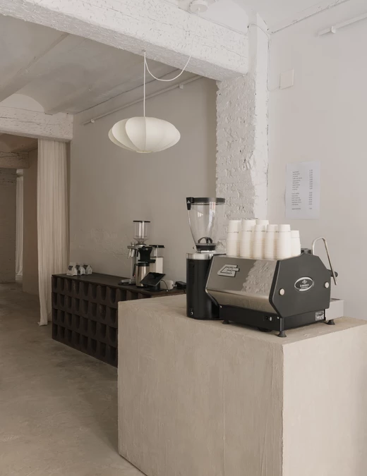 Powierzchnia 170 metrów kwadratowych pełni kilka funkcji jednocześnie. Wnętrze mieści studio architektoniczne, kawiarnię z kawą speciality, przestrzeń wystawienniczą dla produktów projektowych oraz zaplecze do pracy i spotkań. Architektki traktują kawiarnię jako punkt wejścia do swojego świata projektowego. To pierwsza część przestrzeni, z którą spotykają się przechodnie i goście ich biura.