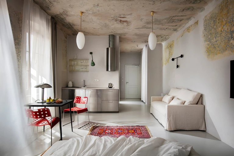 Każdy z pięciu nietypowych apartamentów zapewnia unikalną przestrzeń, ale jednocześnie buduje spójną atmosferę w całym domu. Na parterze znajdują się dwa apartamenty: najmniejszy, przeznaczony dla jednej osoby lub pary oraz drugi, większy z widokiem na cichą uliczkę, z której można poczuć lokalną atmosferę. Na pierwszym piętrze zlokalizowany jest kolejny butikowy apartament oraz większy apartament z przechodnią łazienką, która oddziela strefy wspólne od strefy ciszy. Udało się tu zachować oryginalny piec kaflowy czy stare belki stropowe.