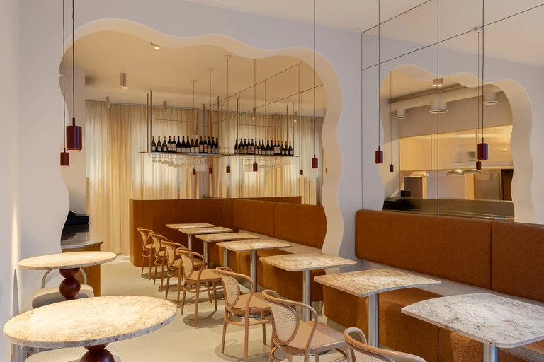 Wzdłuż ścian ustawiono kamienne stoliki, a salę zamknięto barem, który stanowi elegancką dominantę przestrzeni. Otwarta kuchnia z różowym wnętrzem, umiejscowiona w centralnej części bistro, umożliwia gościom podglądanie pracy szefów kuchni.
