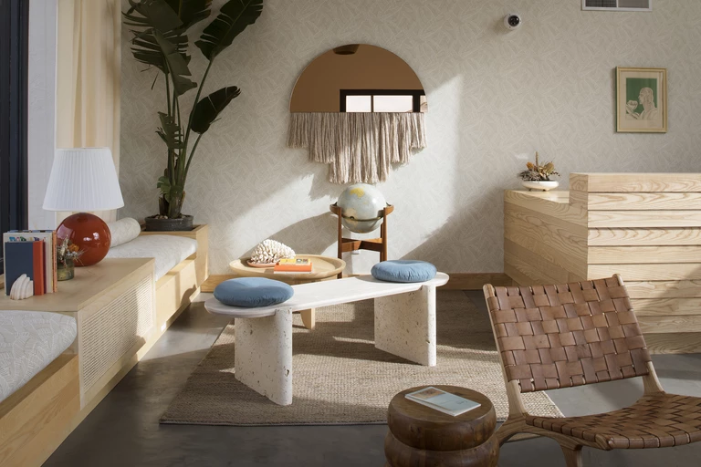 Szczególny klimat tworzy tu miks oryginalnych mebli z drewna jesionowego, a także ciekawych akcentów boho takich ręcznie robione lustro „Half Moon”, zaprojektowane przez Ben & Aja Blanc, z długimi włóknami wykonanymi ręcznie z jedwabiu, wełny i moheru z Japonii.