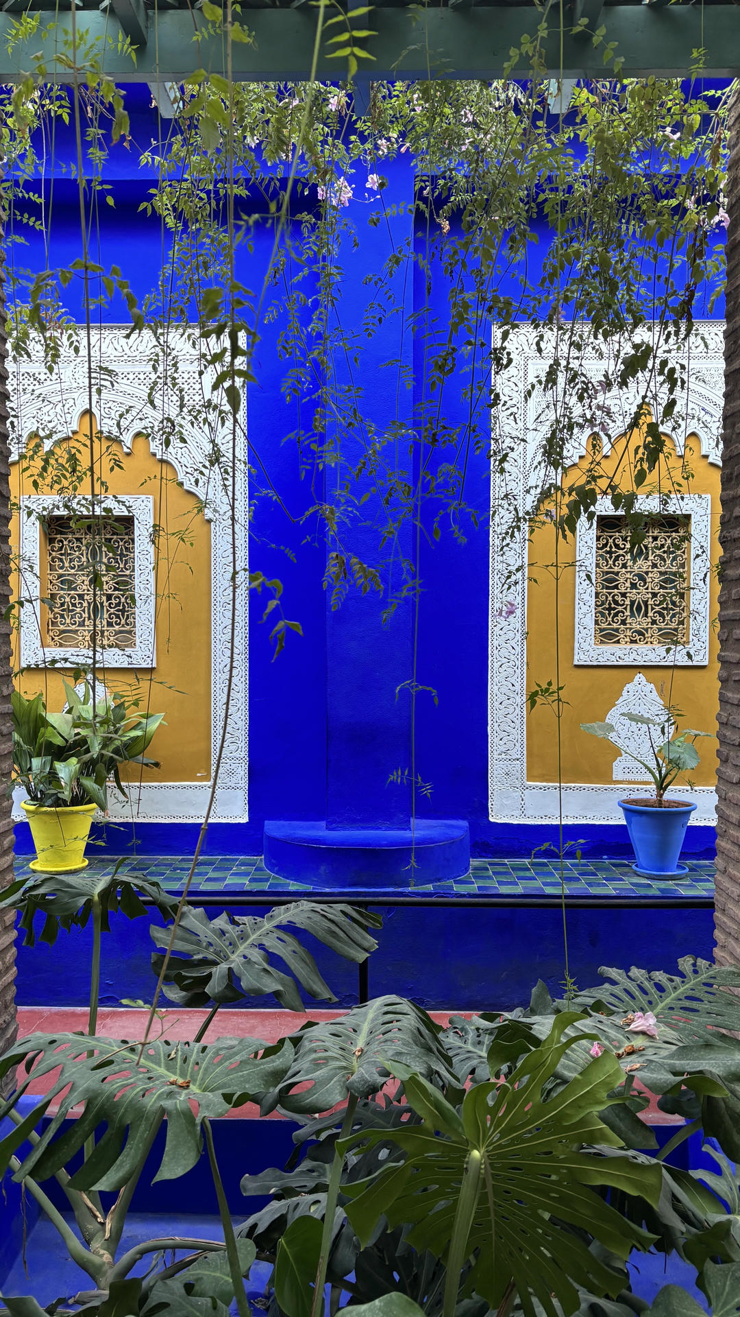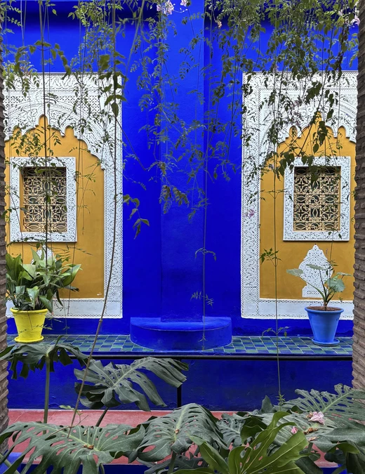 Majorelle, zachwycony intensywnością marokańskich barw, pokrył fasadę swojej willi, okiennice, schody i donice charakterystycznym odcieniem kobaltu, który później zyskał nazwę „błękit Majorelle”. Artysta sprowadził do założonego przez siebie ogrodu rośliny z całego świata, tworząc dzieło, które przerosło sławą jego malarskie prace. Po jego śmierci miejsce popadło w zapomnienie – aż do czasu, gdy odnowili je Saint Laurent i Bergé.