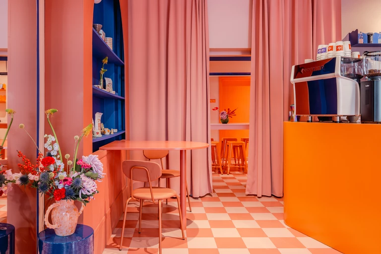 Punktem wyjścia dla całego projektu była różowo-terakotowa szachownica ułożona na podłodze z kafelków marki Tarkett. Tuż przy wejściu zawisło lustro w łukowatej ramie, które nadaje wnętrzu przestrzeni. Mocnym punktem butiku jest także pomarańczowa lada, przy której serwuje się kawę i tworzy kwiatowe kompozycje. Obok, na kolorowych, zaokrąglonych postumentach przy oknie, eksponowane są kwiaty w wazonach.