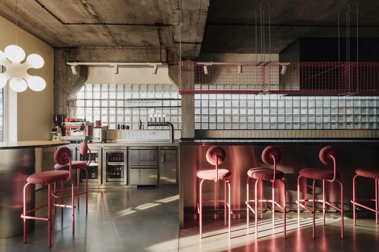 Projektanci zainspirowali się lokalami w miastach takich jak Berlin czy Kopenhaga, gdzie dominują industrialne, surowe przestrzenie o autentycznym charakterze. „Skupiliśmy się na zachowaniu pierwotnych cech wnętrza, takich jak żelbetowy sufit, betonowa posadzka i luksfery, które naturalnie nadają mu surowy styl. Jednocześnie staraliśmy się wprowadzić elementy personalizujące aranżację, które tworzyłyby subtelne kontrasty, takie jak różowe akcenty oraz organiczne formy mebli” – opowiadają architekci.