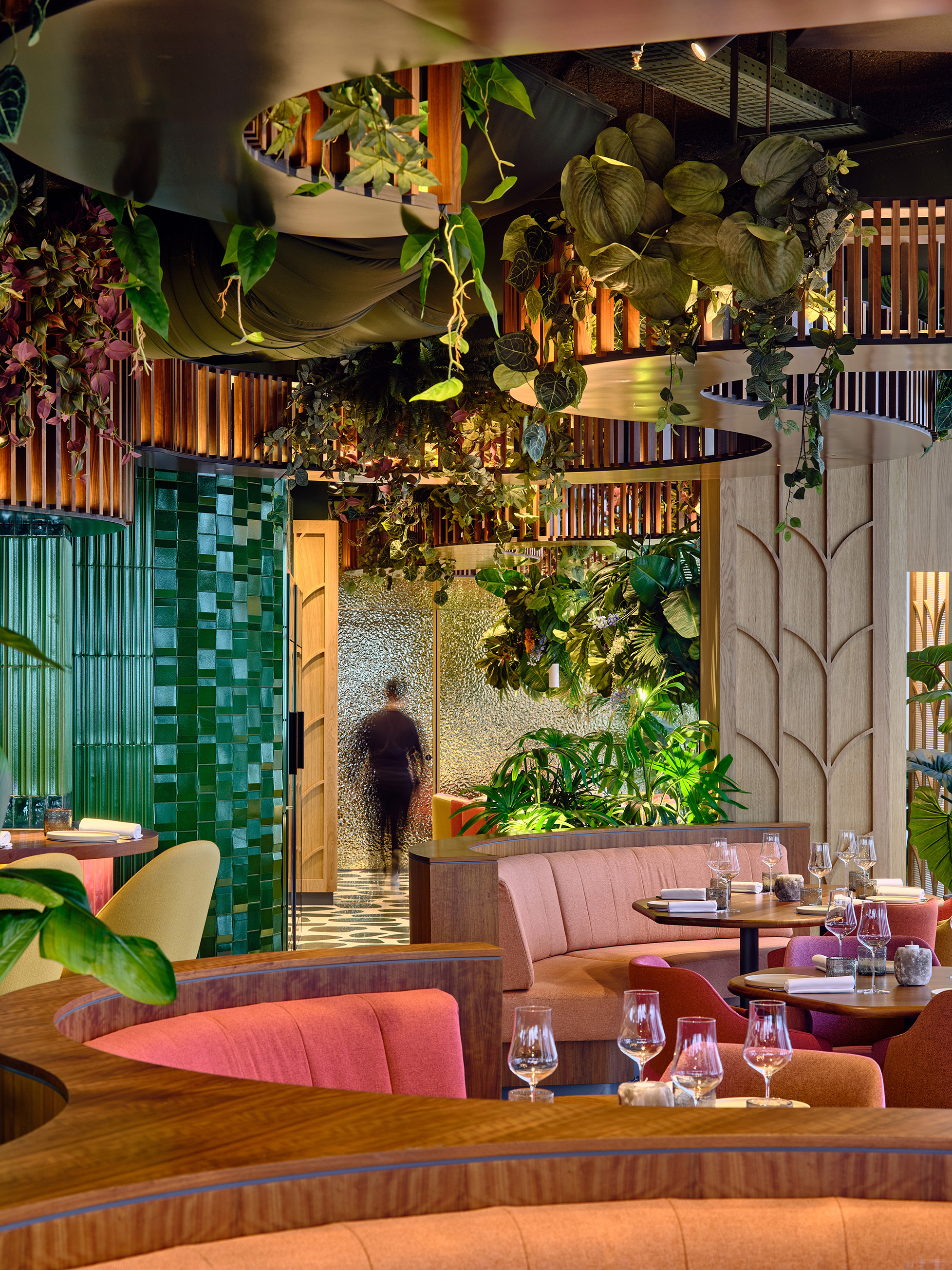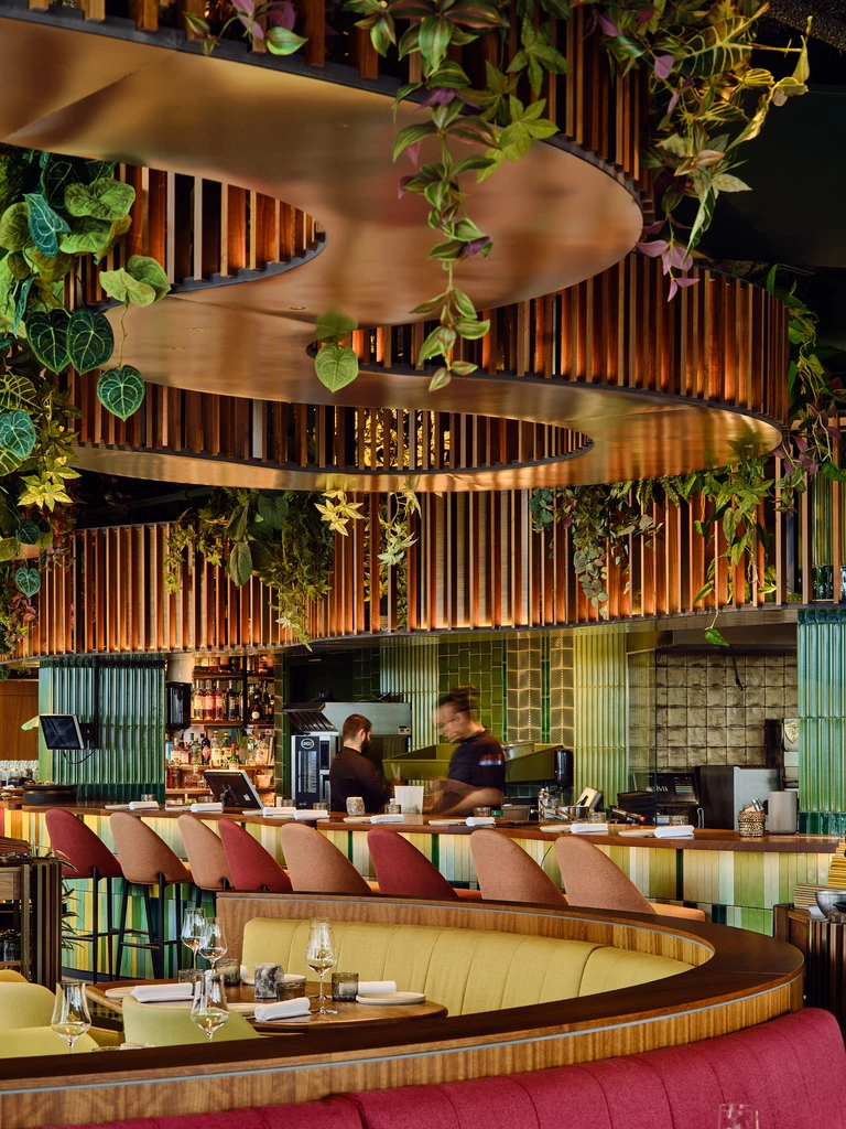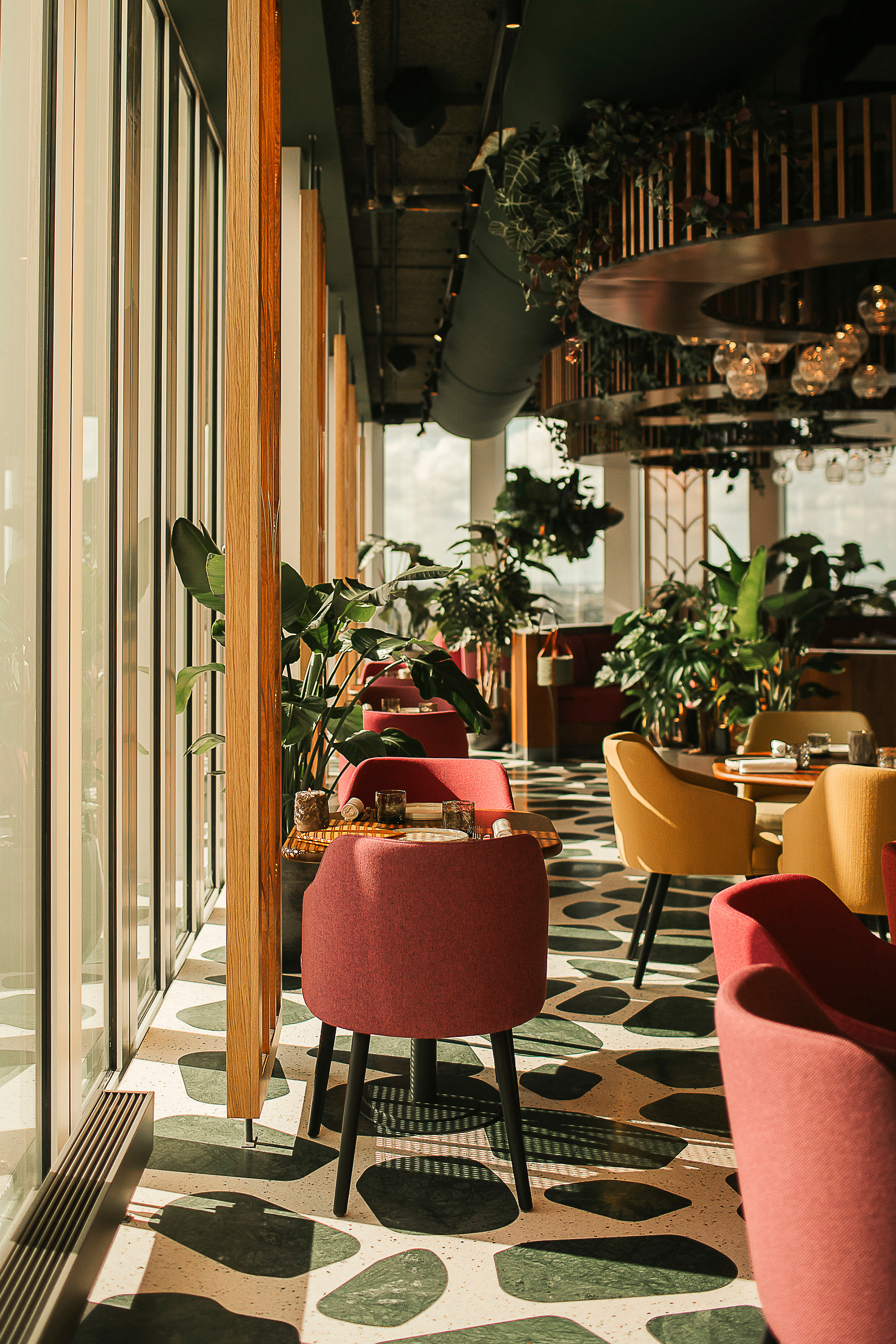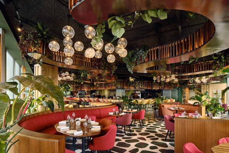 Kręte ścieżki prowadzą gości przez różne strefy restauracji, zachęcając do eksploracji i łagodząc techniczny charakter szklanej bryły wieżowca. Tuż przy wejściu uwagę zwraca podwieszony pod sufitem, lustrzany element przypominający tropikalną rzekę, który wije się ponad grupami szklanych lamp i roślinami.