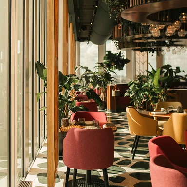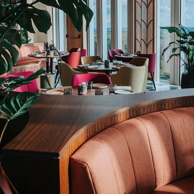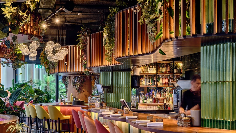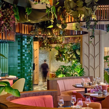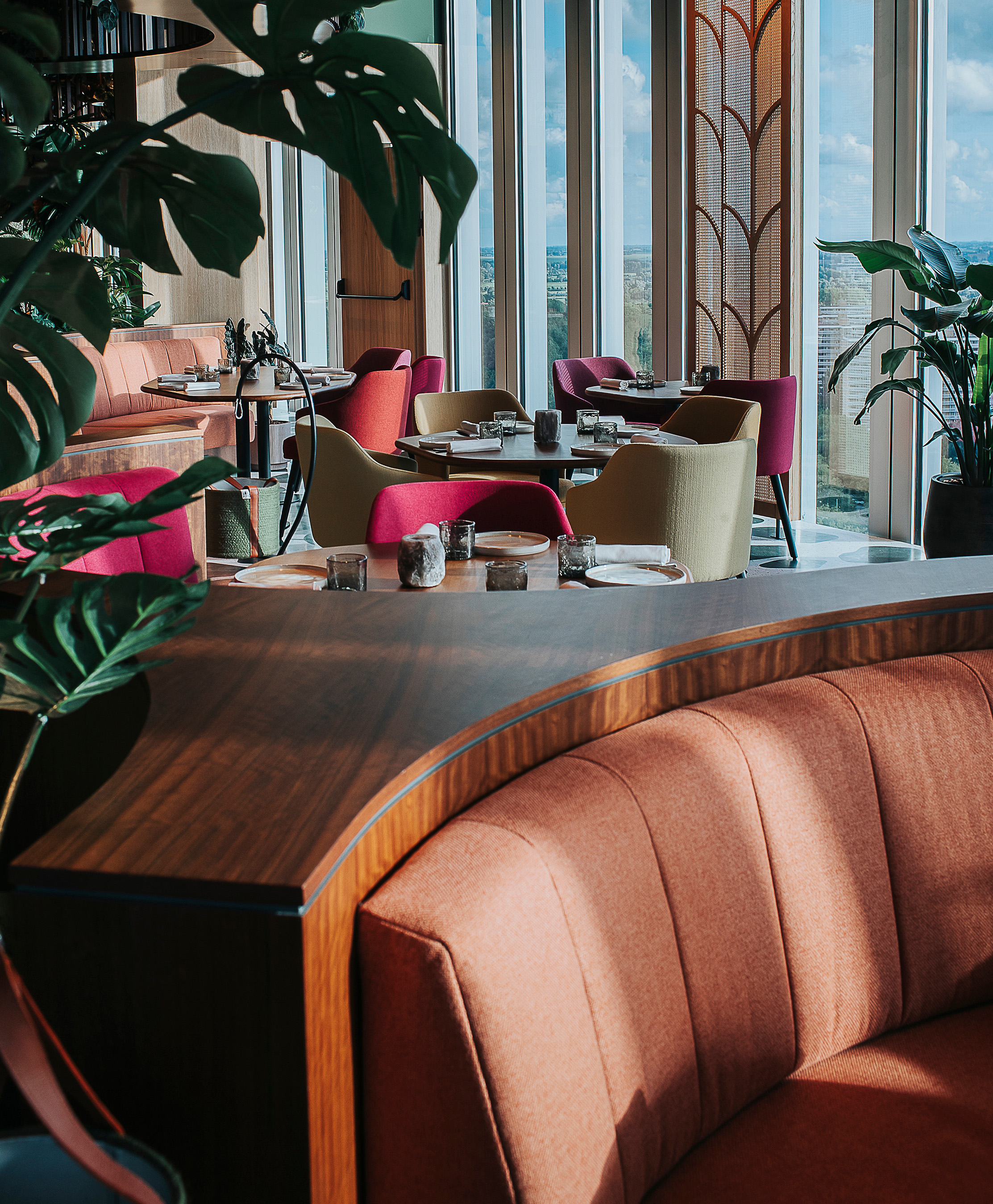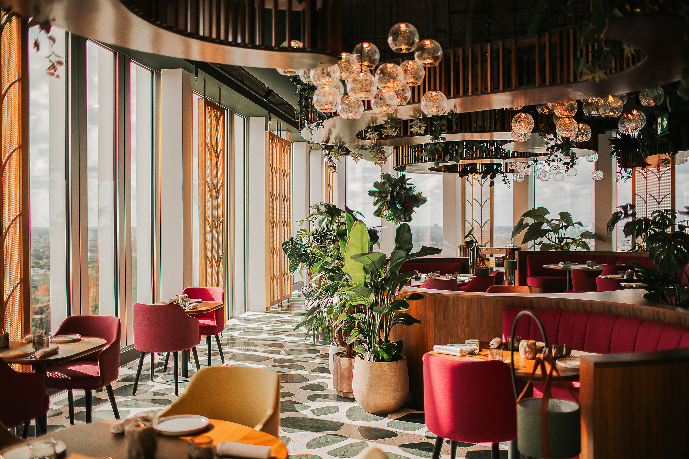 Kręte ścieżki prowadzą gości przez różne strefy restauracji, zachęcając do eksploracji i łagodząc techniczny charakter szklanej bryły wieżowca. Tuż przy wejściu uwagę zwraca podwieszony pod sufitem, lustrzany element przypominający tropikalną rzekę, który wije się ponad grupami szklanych lamp i roślinami.