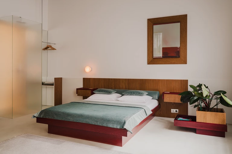 Należący do nich apartament Sommeil składa się z wielofunkcyjnego pomieszczenia i części łazienkowej. Jego ściana nośna stanowi rdzeń, wokół którego znajduje się zabudowa meblowa z forniru z orzecha amerykańskiego i kamiennego blatu Colonial White, pełniąca rolę aneksu kuchennego.
