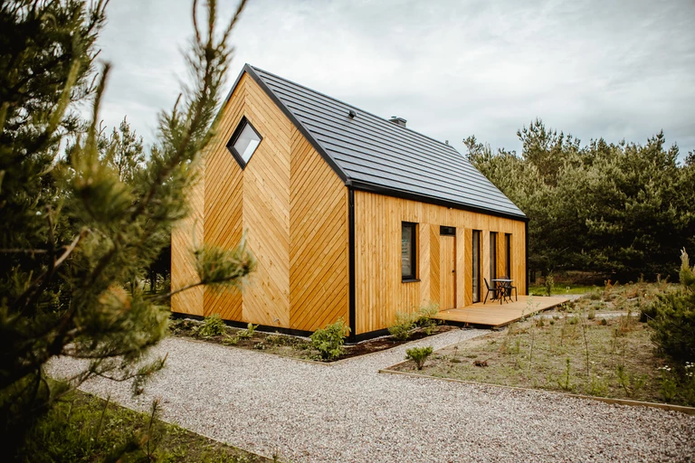 Przestronny, otwarty salon z kozą i dużą witryną z widokiem na sosnowy las oraz dwa drewniane tarasy stanowią idealną przestrzeń do odpoczynku. Kuchnia z jadalnią, gdzie znajduje się duży stół, doskonale nadadzą się do długich rozmów przy wspólnych posiłkach. Natomiast antresola z biblioteczką jest miejscem, które ułatwi odcięcie się od świata zewnętrznego.