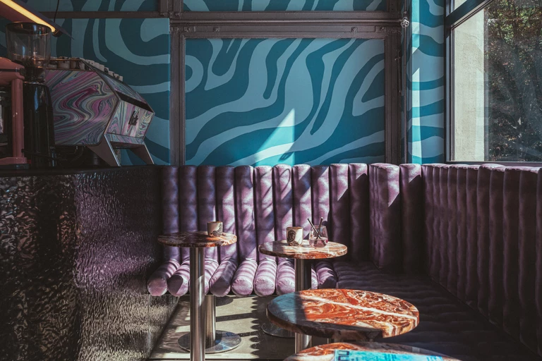 „Klientowi zależało na miejscu z niespotykanym designem, innym niż minimalistyczny wystrój, który dominuje w większości krakowskich kawiarni. Sięgnęłam więc do stylu space age i designu z lat 60.” – opisuje proces projektowy autorka wnętrza.