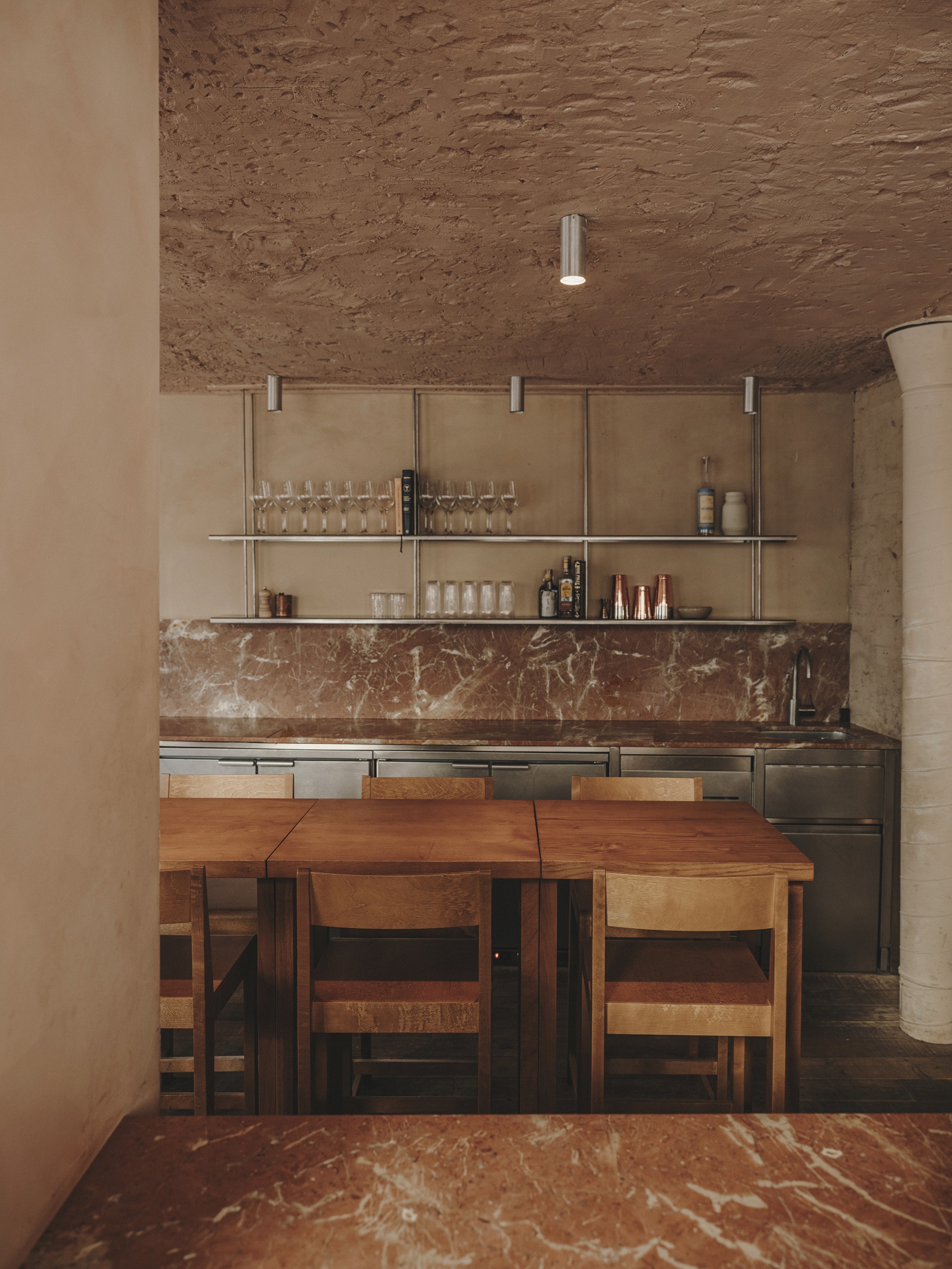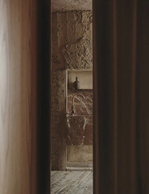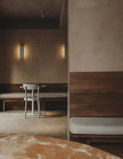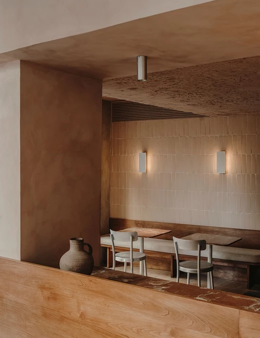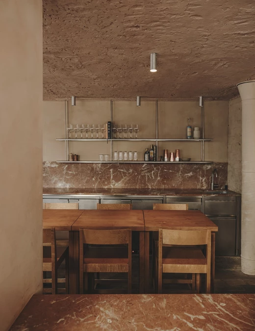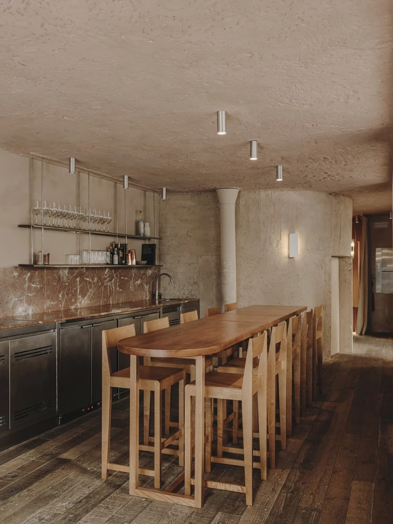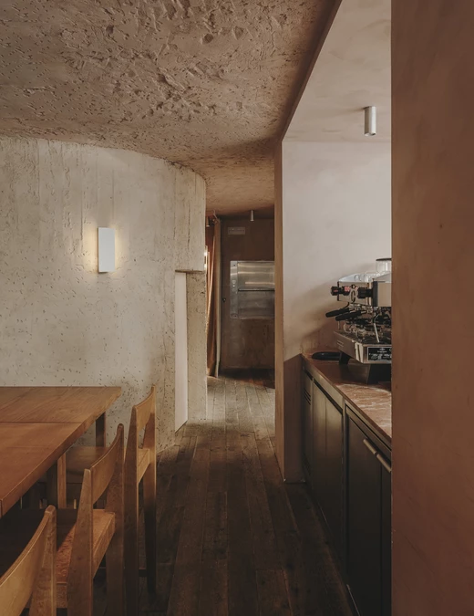 Projektantom zależało także na podkreśleniu cech samego budynku, dlatego wnętrze ma lekko, jak sami mówią, jaskiniowy charakter. Projekt wykorzystuje beton, cegłę i tynk z pierwotnej konstrukcji oraz zastane nisze uzupełnione o nowe elementy, takie jak łuk domykający strefę pieca do chleba i pizzy. To wnętrze ciągłe i zdecydowane, o zróżnicowanych fakturach, utrzymane jednak w stonowanej palecie kolorów.