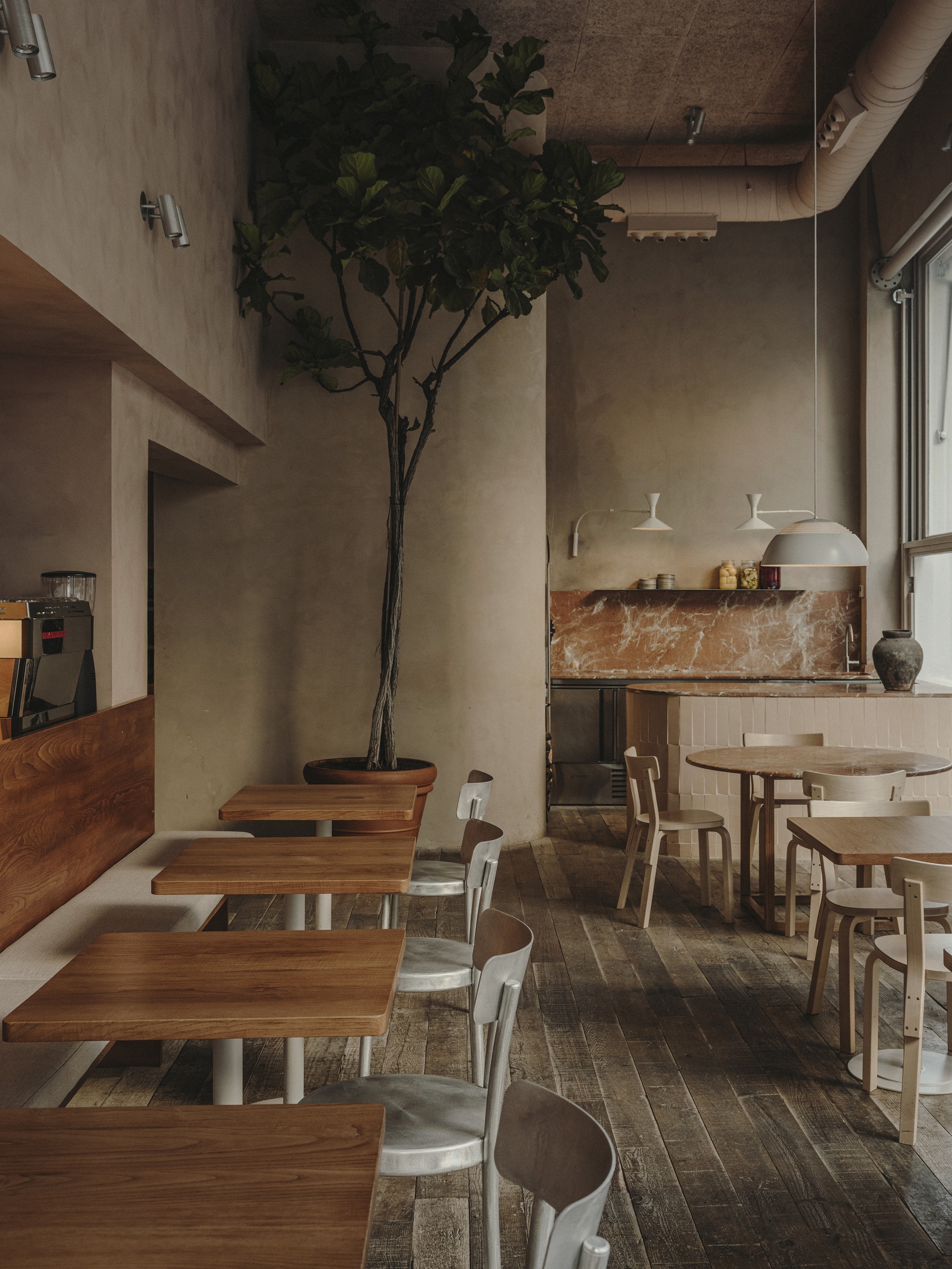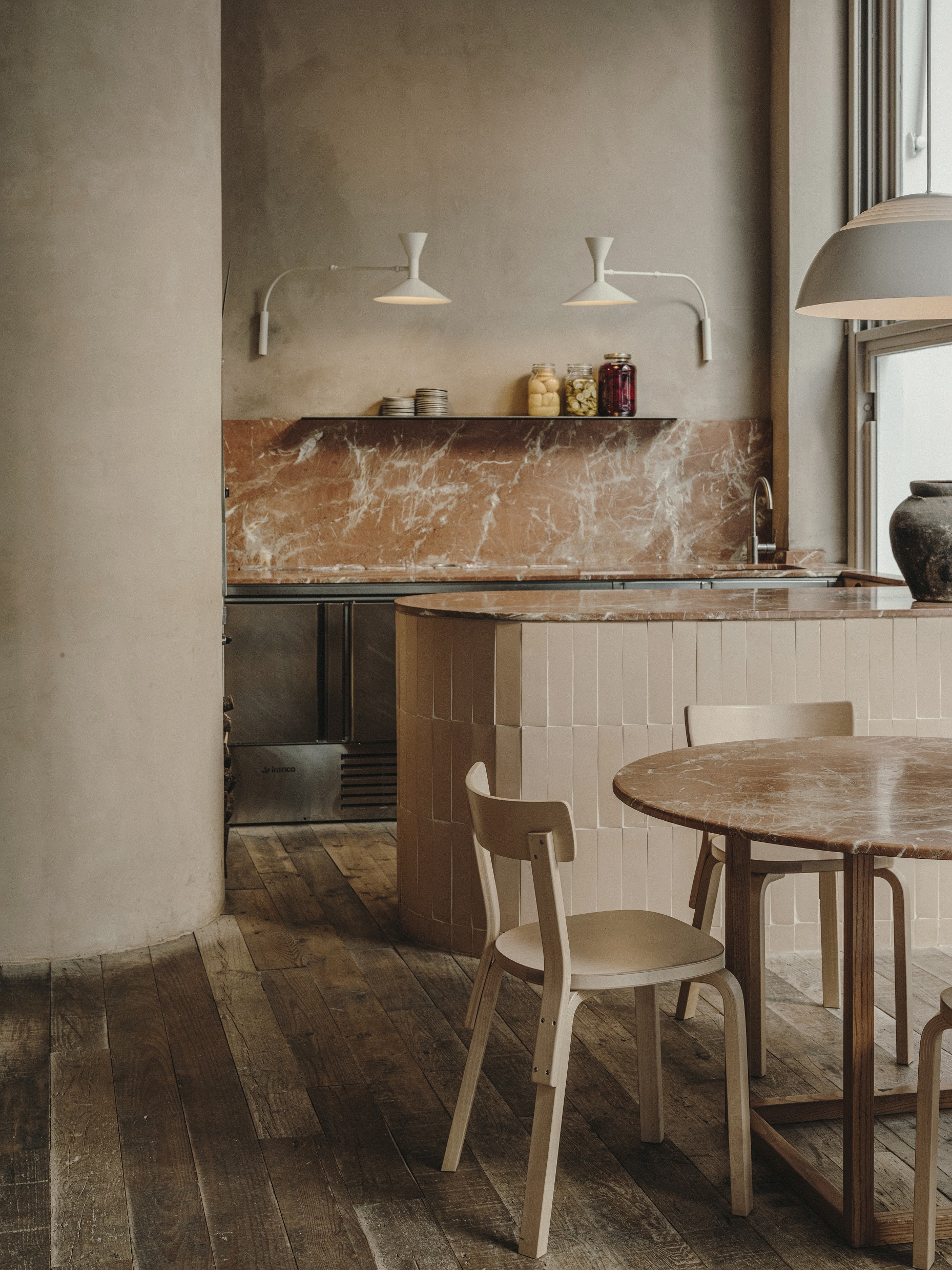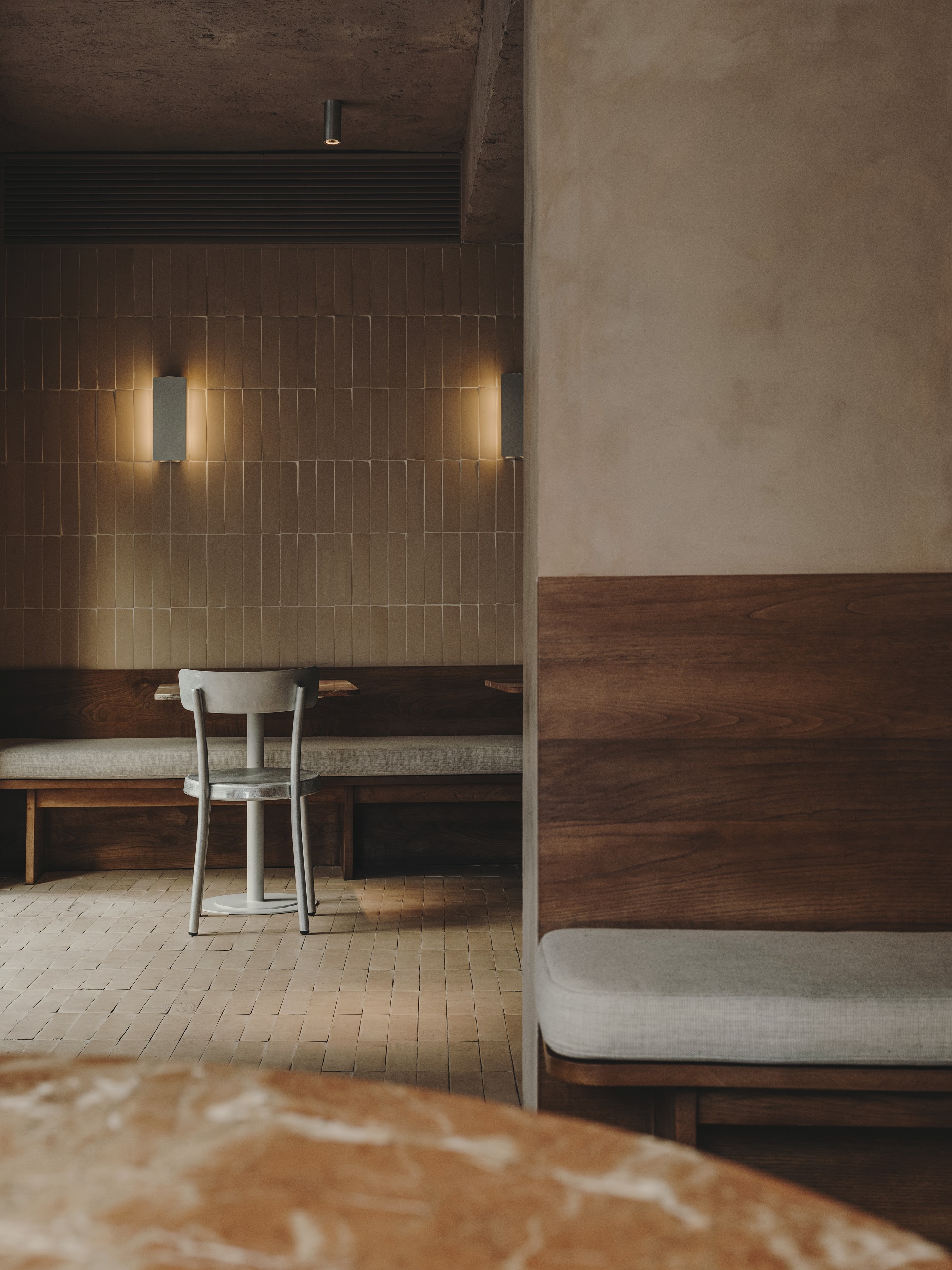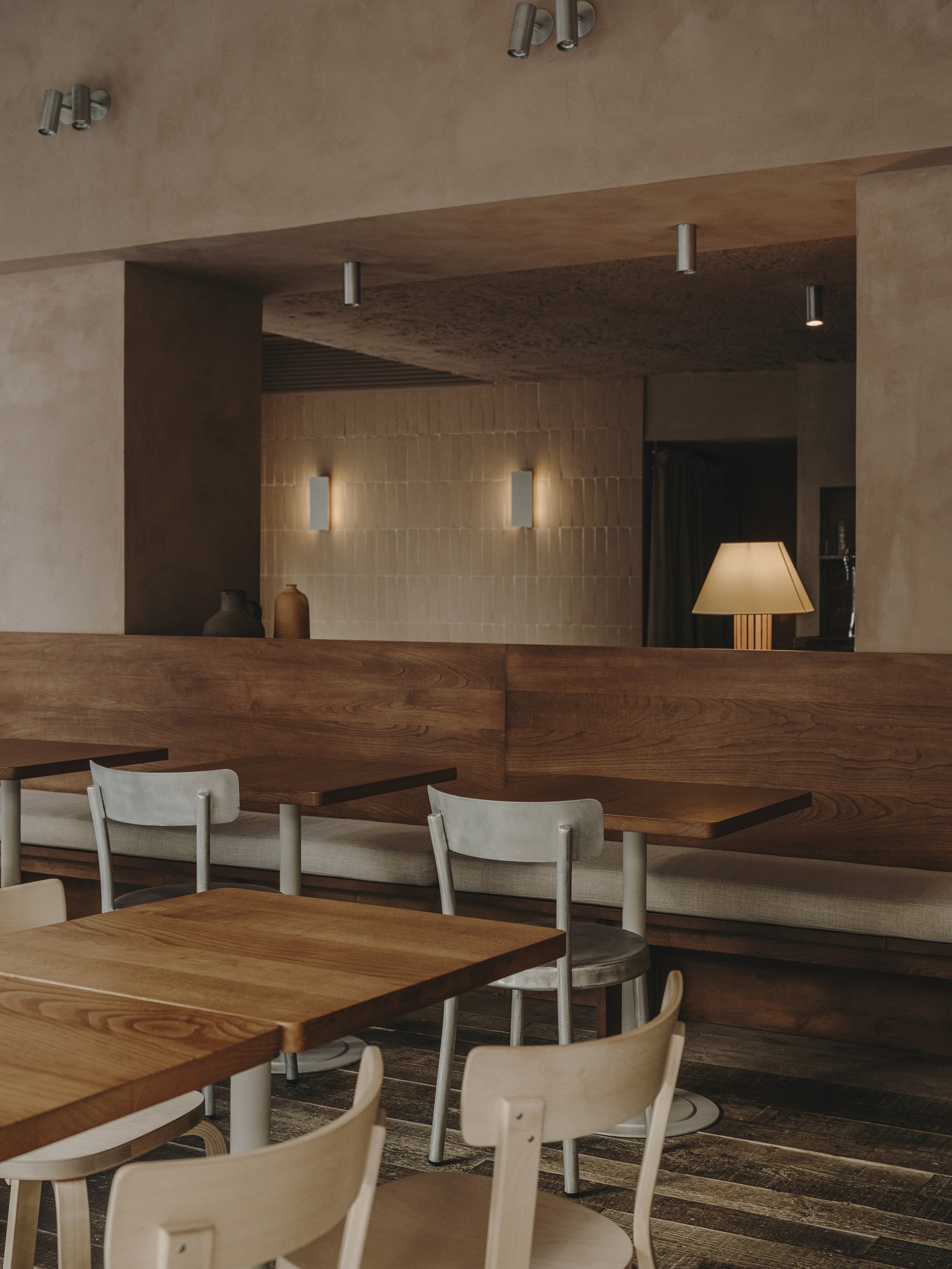 Projektantom zależało także na podkreśleniu cech samego budynku, dlatego wnętrze ma lekko, jak sami mówią, jaskiniowy charakter. Projekt wykorzystuje beton, cegłę i tynk z pierwotnej konstrukcji oraz zastane nisze uzupełnione o nowe elementy, takie jak łuk domykający strefę pieca do chleba i pizzy. To wnętrze ciągłe i zdecydowane, o zróżnicowanych fakturach, utrzymane jednak w stonowanej palecie kolorów.