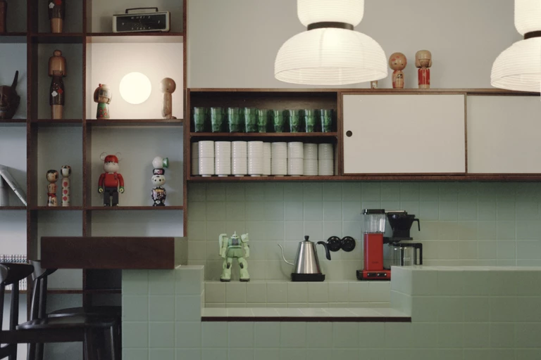 Sercem lokalu jest bar nawiązujący do domowej japońskiej kuchni. Bryłę z dużej mozaiki w kolorze mięty uzupełniono kuchennymi schowkami i półkami, na których piętrzą się japońskie naczynia. Tę nostalgiczną scenerię doskonale dopełniają sprzęty i dodatki vintage oraz dekoracje i plakaty przywiezione z Japonii.