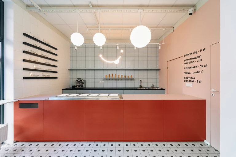 Wnętrze jest przemyślaną kompozycją, składającą się z elementów kratki, kół i plam ciepłych barw. „Wybrałyśmy je, inspirując się wzorami charakteryzującymi samą lodziarnię, w której – oprócz kolorowych lodów – podstawą jest kraciasty wafelek” – mówią projektantki.
