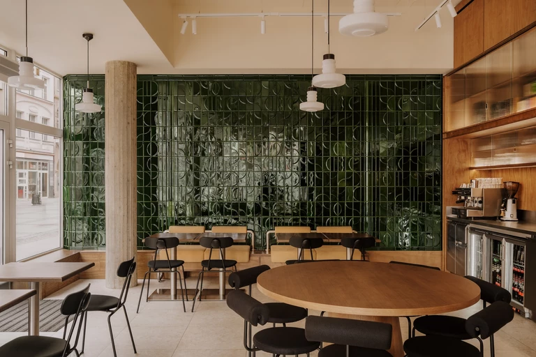 Architekci bawią się we wnętrzu kontrastami – surowy, odkryty beton ze śladami szalunki na słupach oraz szczotkowaną stal na barze kontrastują z połyskliwymi kafelkami oraz ciepłem miodowo-kasztanowej sklejki. Oszczędnie gospodarują też kolorami – zieleń, szarość, jasne drewno i biel akcentują tu czarne krzesła od polskiej marki The Good Living & Co. i detale ręcznie dmuchanych lamp od wrocławskiej manufaktury Embassy Interiors.