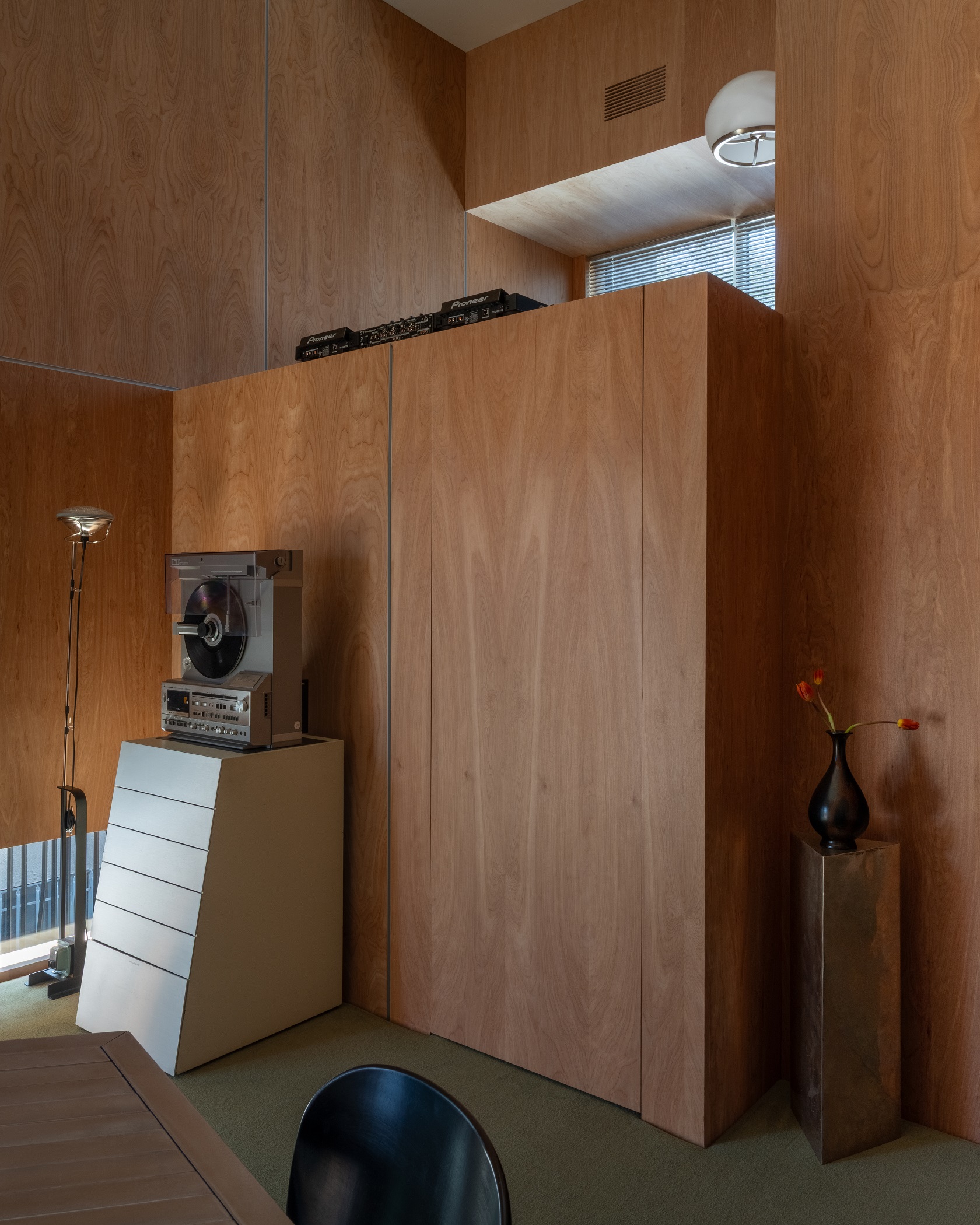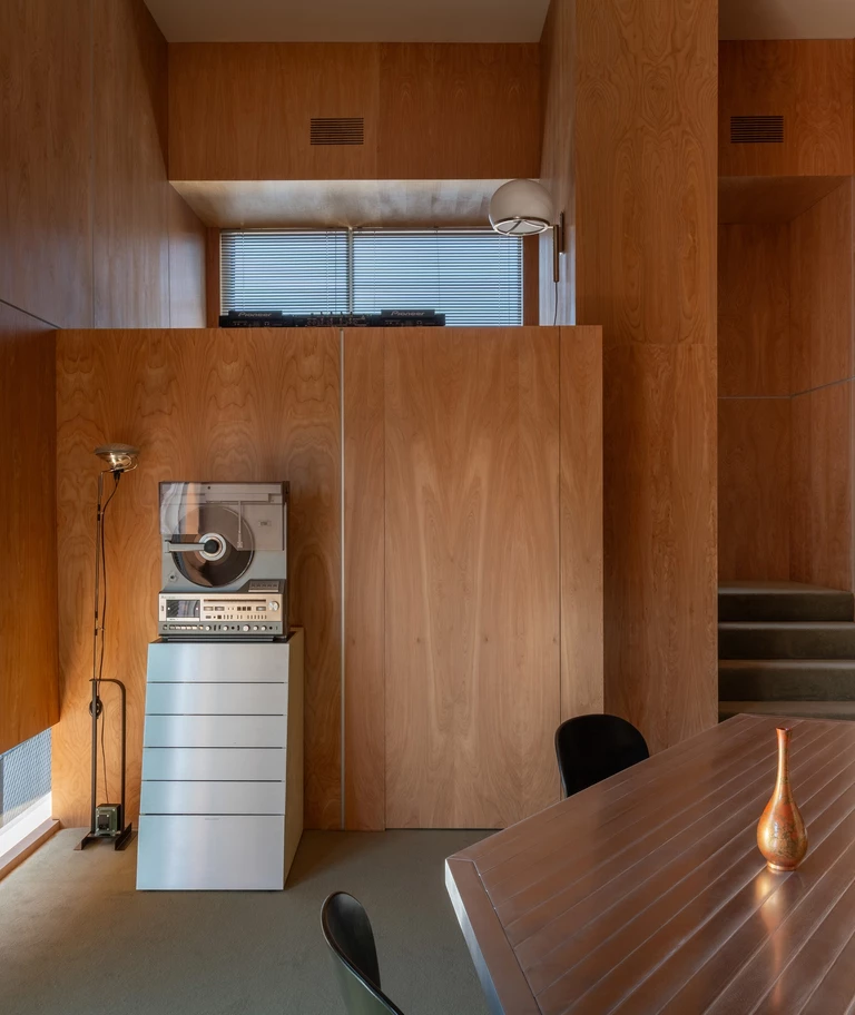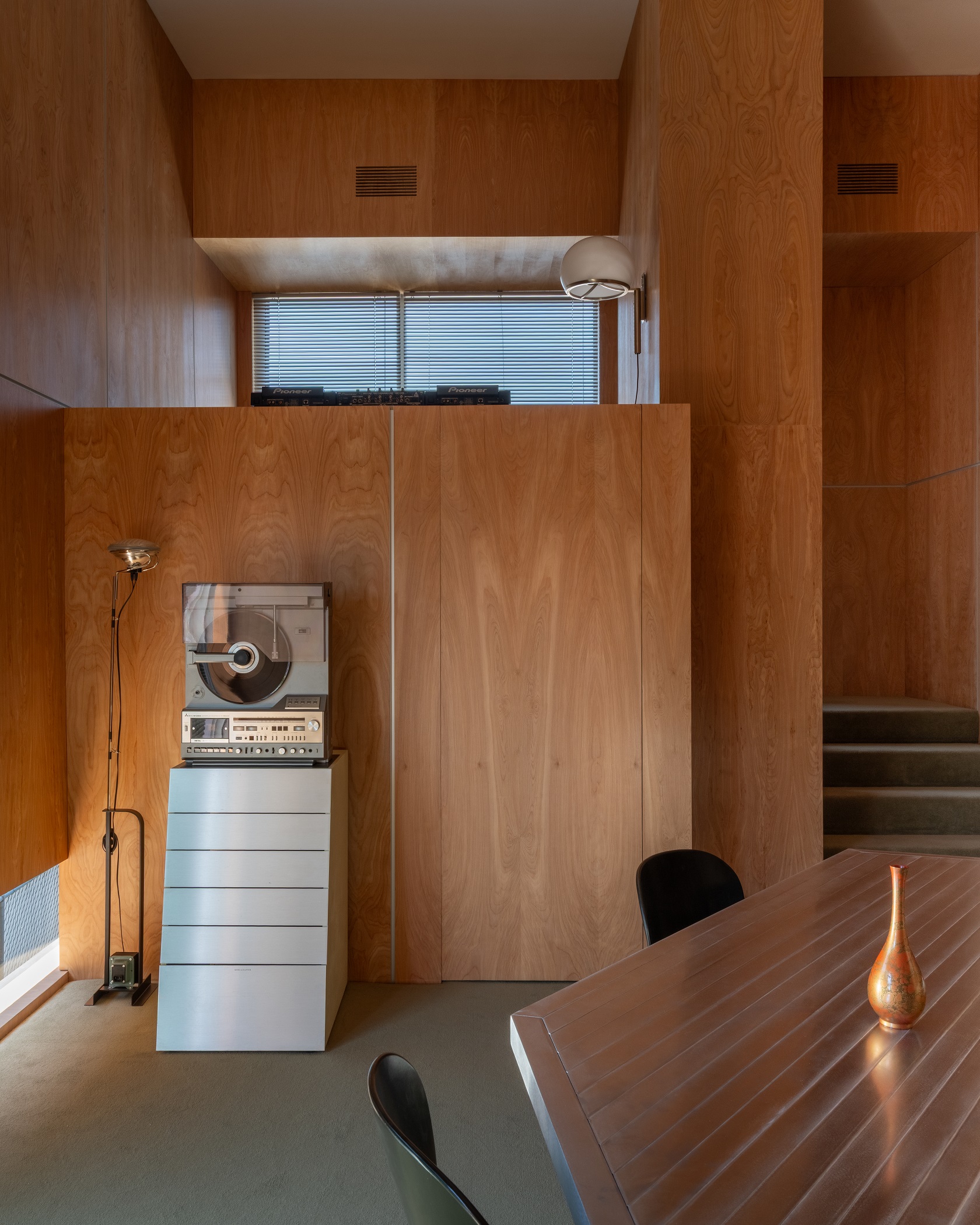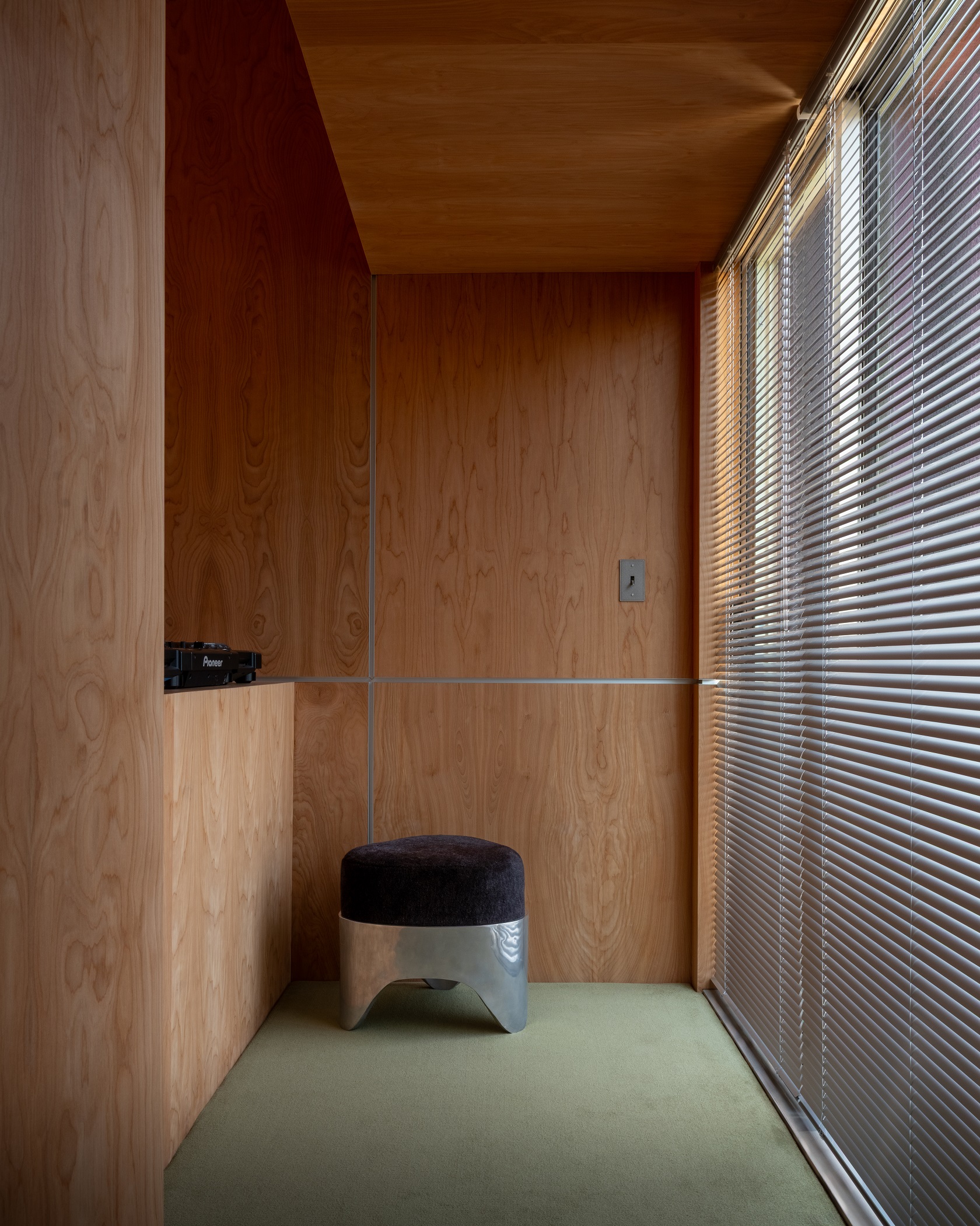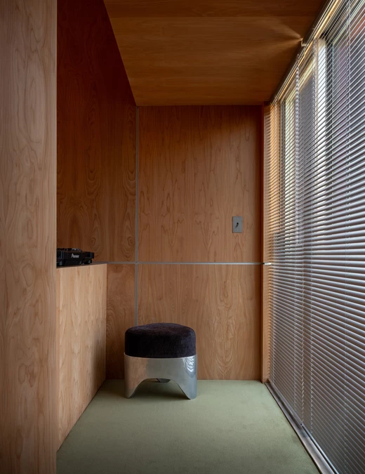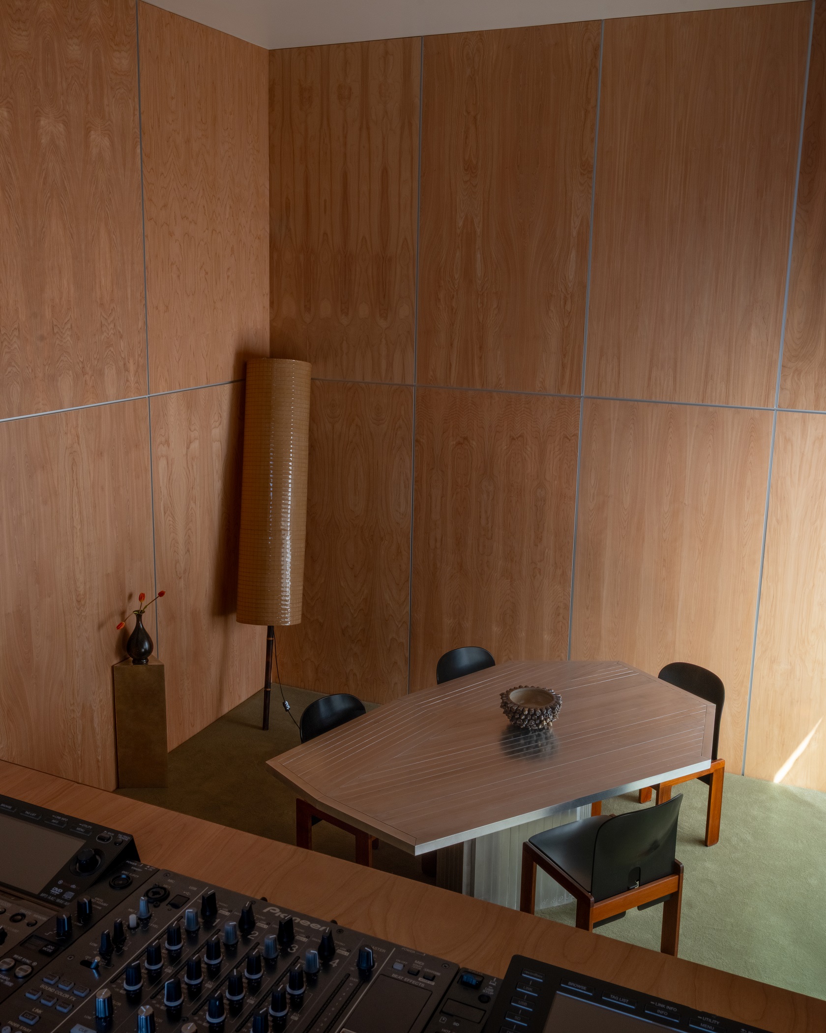 Wykonany na zamówienie modułowy stół zaprojektowany przez Studio Haos jest centralnym elementem wnętrza. Ustawiony na środku pomieszczenia porządkuje jego układ i ułatwia zmianę konfiguracji między sesją nagraniową, spotkaniem a pracą indywidualną. Towarzyszą mu vintage’owe fotele projektu Tobii Scarpy, które dodają wnętrzu autentyczności. Meble z drugiej ręki wprowadzają zróżnicowaną fakturę i patynę, rzadko obecną w mocno zdigitalizowanych miejscach pracy.