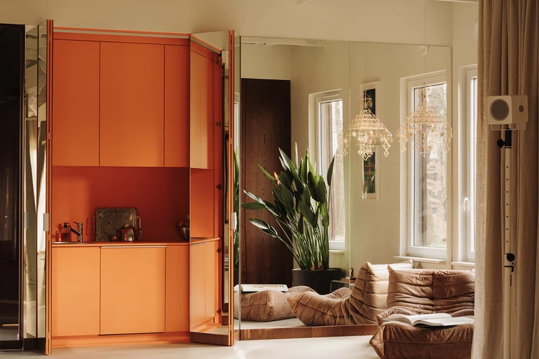 Po wejściu do Yutori trafiamy do ciemnego, wiśniowego holu. Drzwi z symbolem koła prowadzą nas do serca tego miejsca – sali utrzymanej w stonowanych barwach natury. Kolorystycznie wyróżnia się tu jedynie aneks kuchenny, który zanurzono w energetycznym odcieniu pomarańczy.