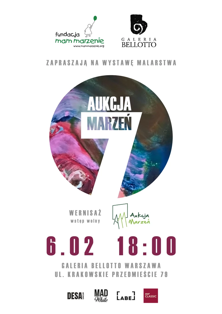 Już w najbliższy piątek, 6 lutego 2026 roku o godzinie 18:00, w warszawskiej Galerii Bellotto przy Krakowskim Przedmieściu 79 rozpocznie się uroczysty wernisaż otwierający wystawę prac 7. edycji Aukcji Marzeń. Ekspozycja będzie dostępna dla zwiedzających do 16 lutego, stanowiąc bezpośrednie przygotowanie do wielkiego finału projektu - charytatywnej licytacji dzieł sztuki, która odbędzie się w marcu w murach Domu Aukcyjnego DESA Unicum. Jesteśmy niezwykle dumni, że mogliśmy objąć patronat medialny nad wydarzeniem.