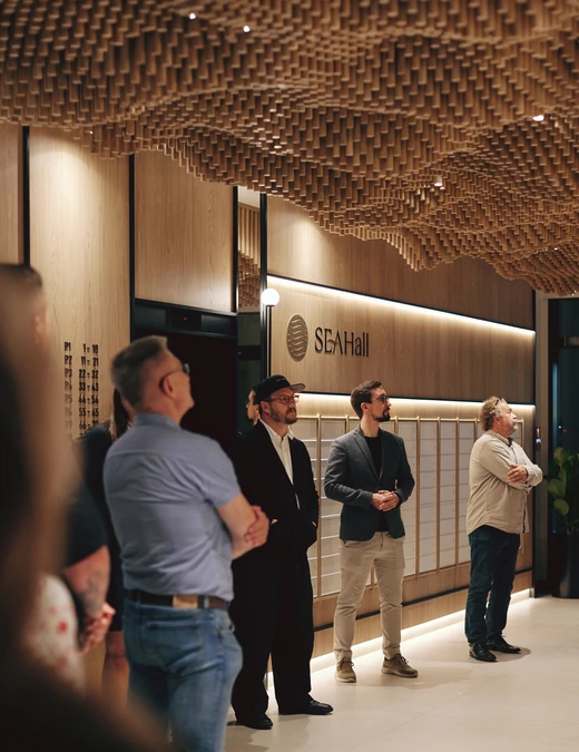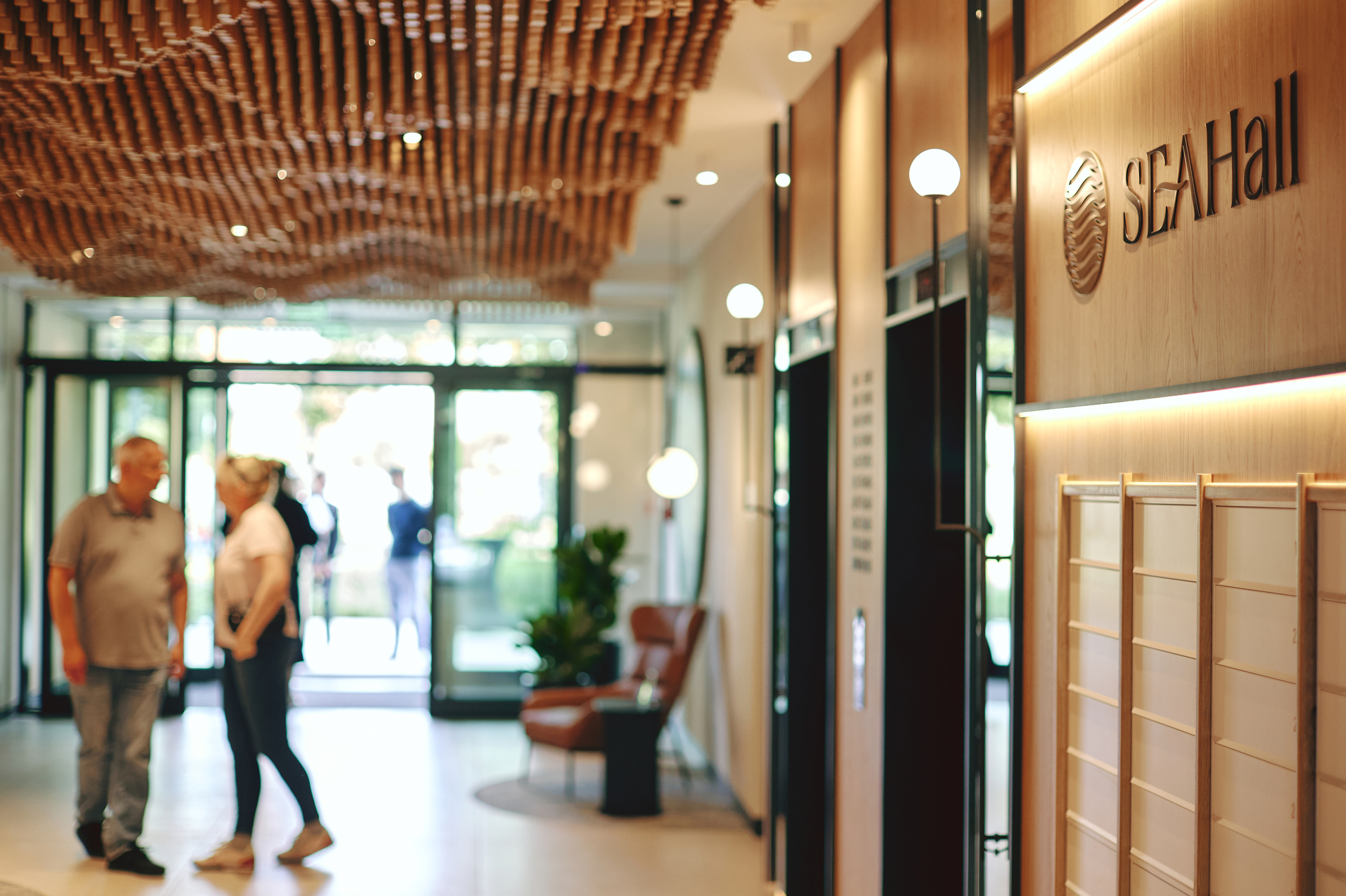 SEAHall to przestrzeń wyróżniająca się wyszukanym designem i starannie dobraną sztuką. Inspirowane nadmorskim stylem wnętrza inwestycji to owoc współpracy Allconu z renomowaną pracownią Sikora Wnętrza. Już od wejścia do reprezentacyjnego holu, uwagę zwraca rzemieślnicza, falująca instalacja sufitowa – autorski projekt realizowany przez wiele miesięcy w lokalnej stolarni. W SEAHall swoje miejsce znalazły także romantyczne obrazy Julii Marchlewskiej, inspirowane morzem i światłem. Z kolei Aleksandra Józefów przygotowała do wnętrz własną interpretację mapy Wrzeszcza, która przybrała postać oryginalnej rzeźby z betonu komórkowego.
