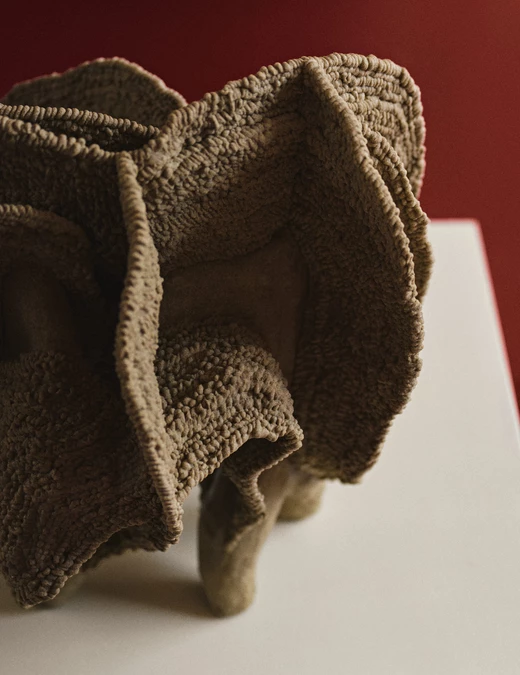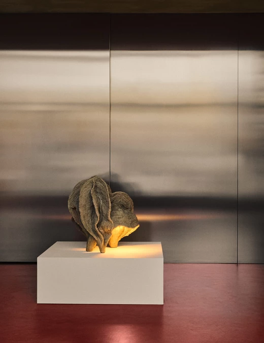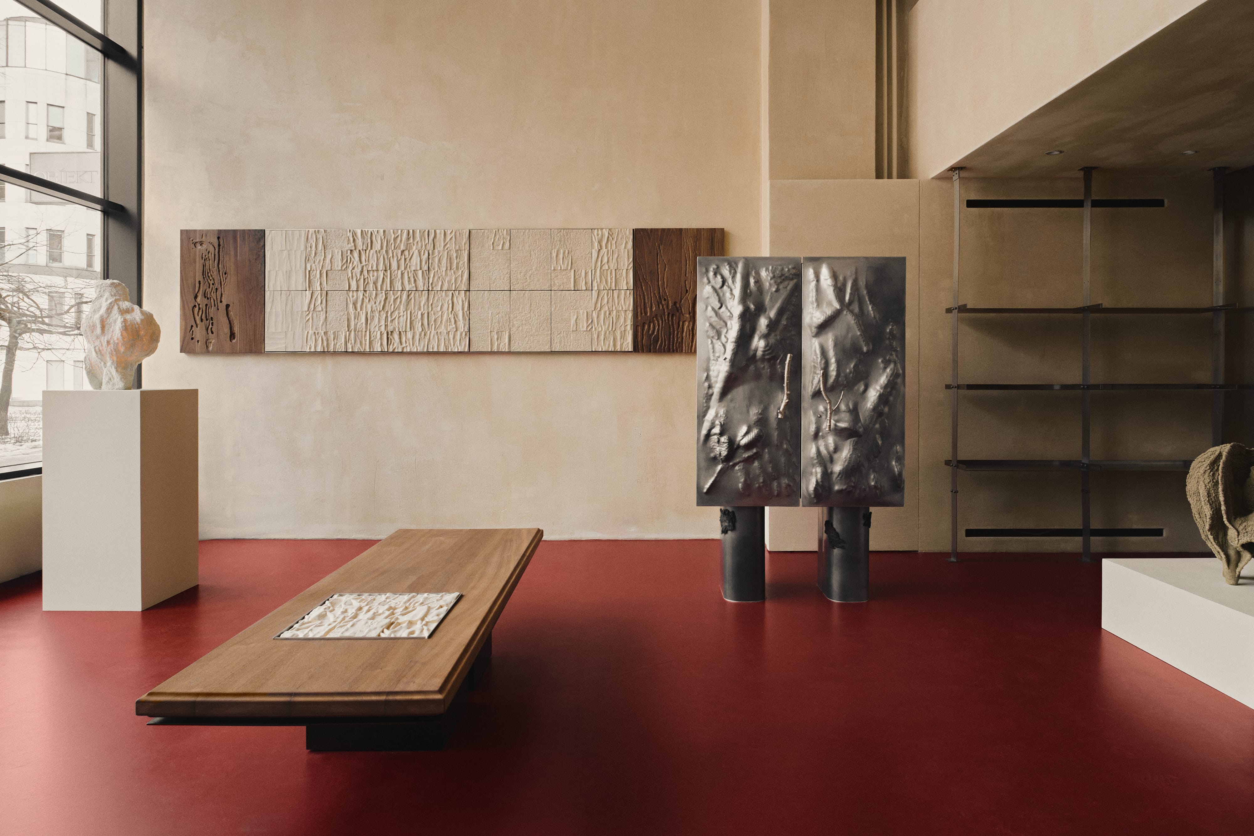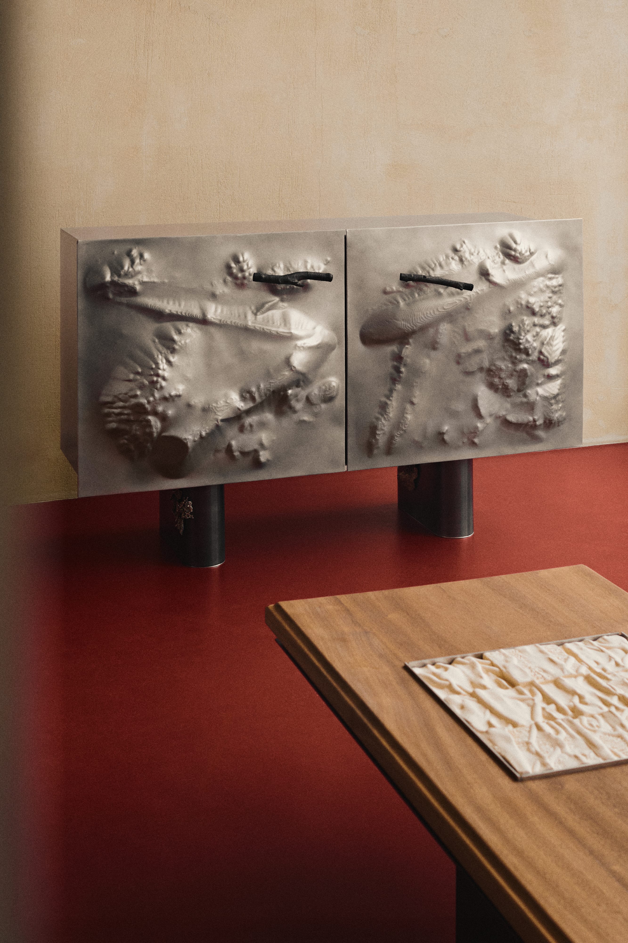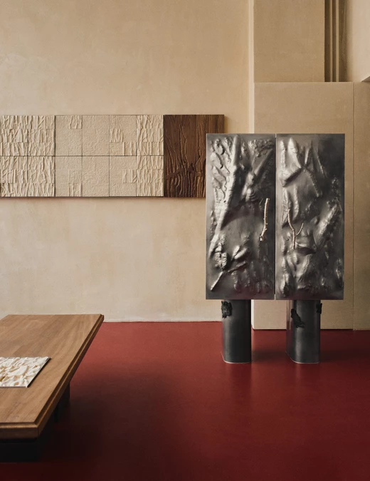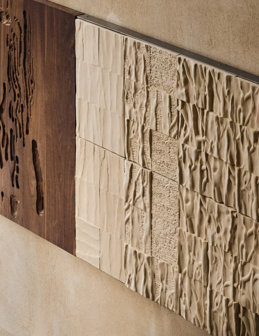 Zuzanna Spaltabaka i Igor Jansen w cyklu Corpus Ornamentum analizują ślady biologicznych procesów – korytarze korników, pnącza bluszczu czy struktury drzew poddanych erozji. Przekuwają je w monumentalne ceramiczne reliefy, które zestawiają z eleganckimi konstrukcjami z orzechowego drewna. Ich prace konfrontują dekoracyjność z zapisem naturalnej walki o światło i przestrzeń.