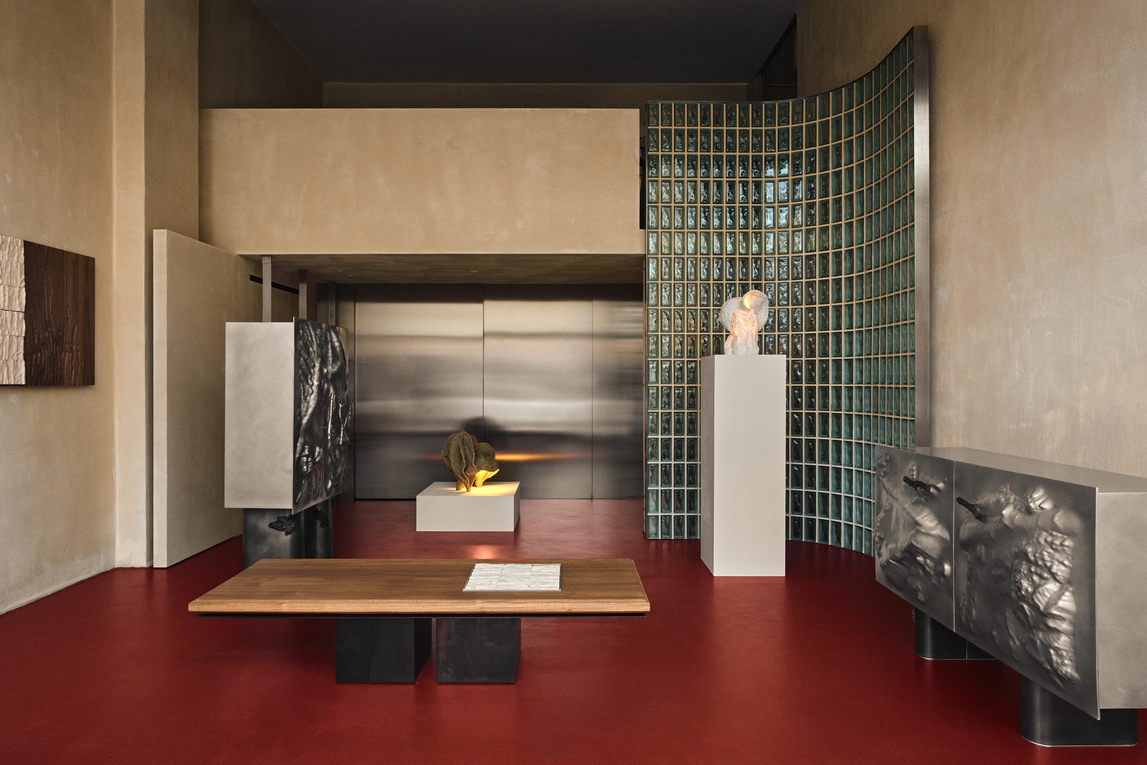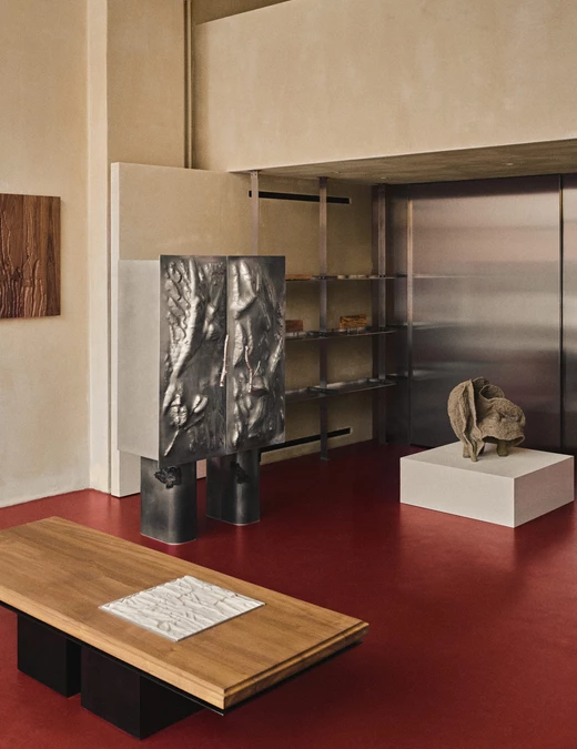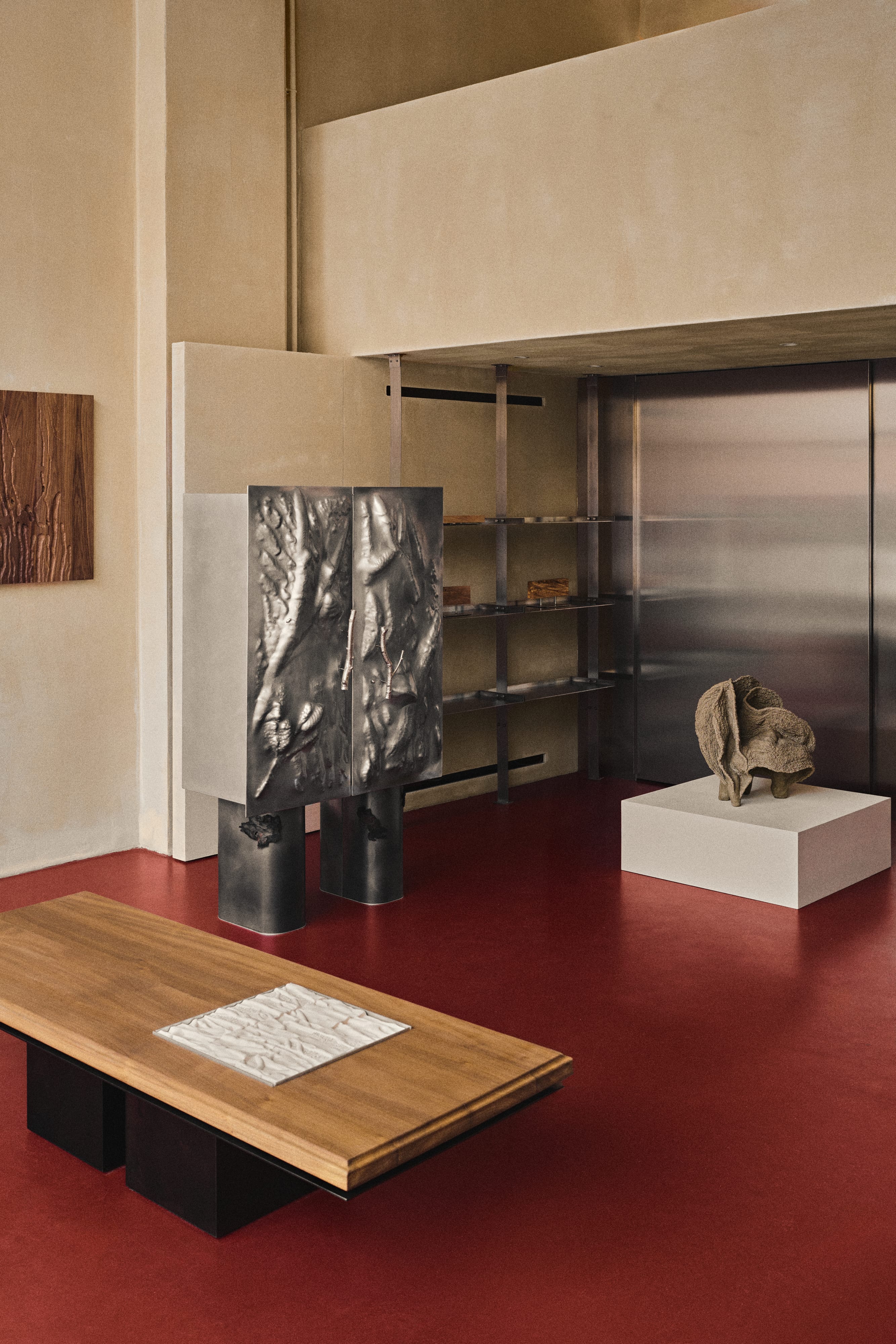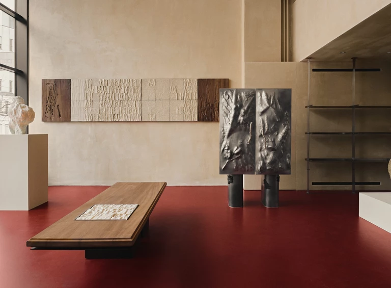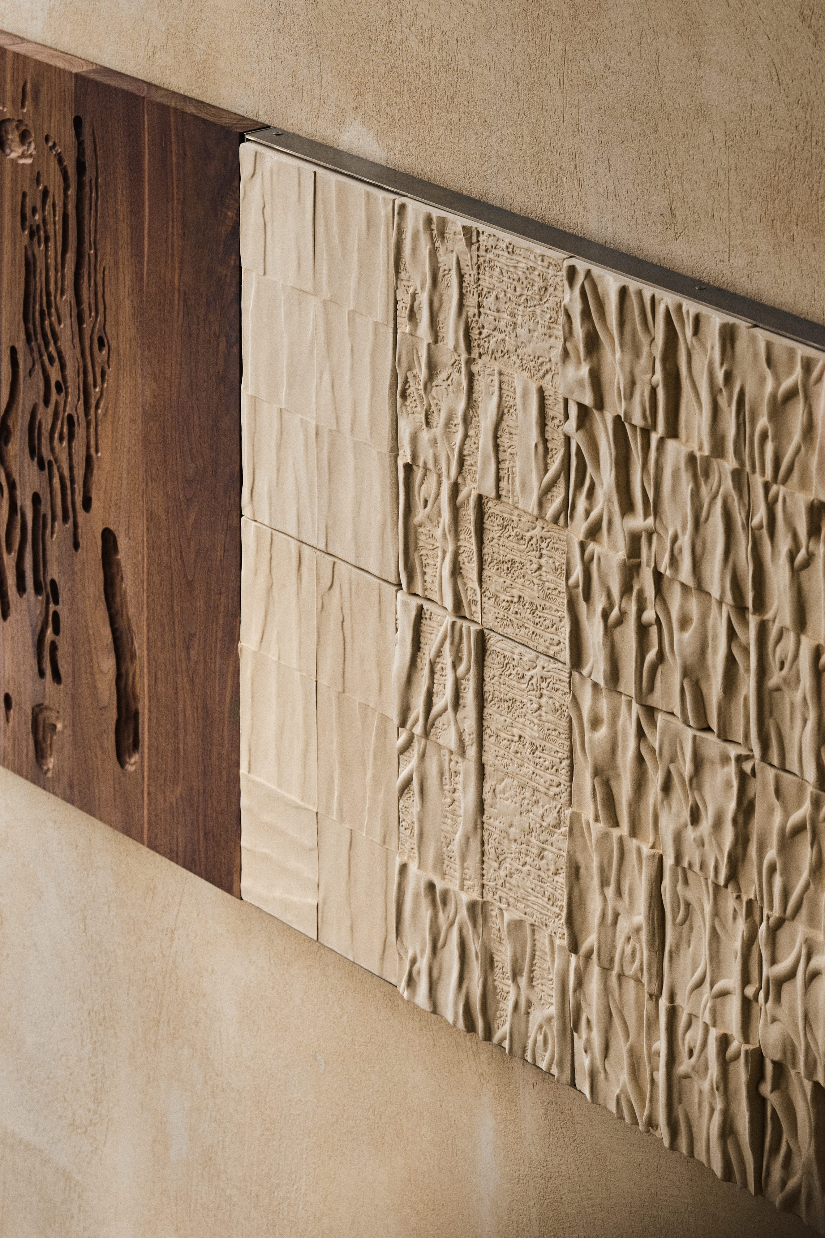 Zuzanna Spaltabaka i Igor Jansen w cyklu Corpus Ornamentum analizują ślady biologicznych procesów – korytarze korników, pnącza bluszczu czy struktury drzew poddanych erozji. Przekuwają je w monumentalne ceramiczne reliefy, które zestawiają z eleganckimi konstrukcjami z orzechowego drewna. Ich prace konfrontują dekoracyjność z zapisem naturalnej walki o światło i przestrzeń.
