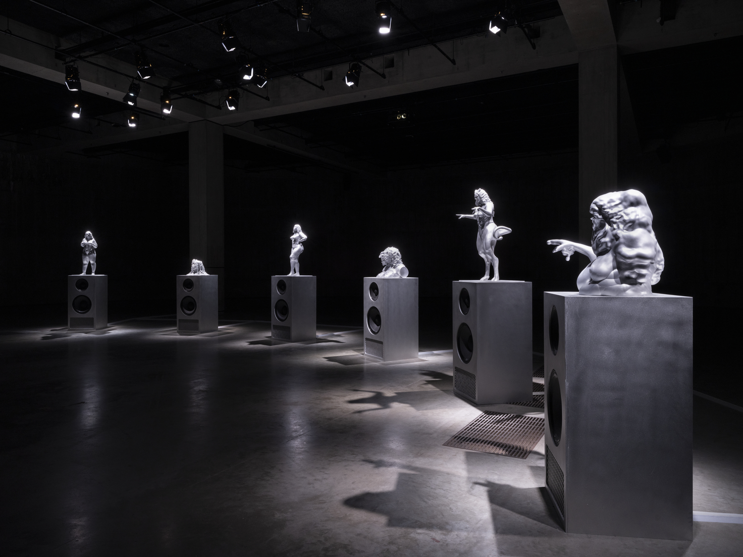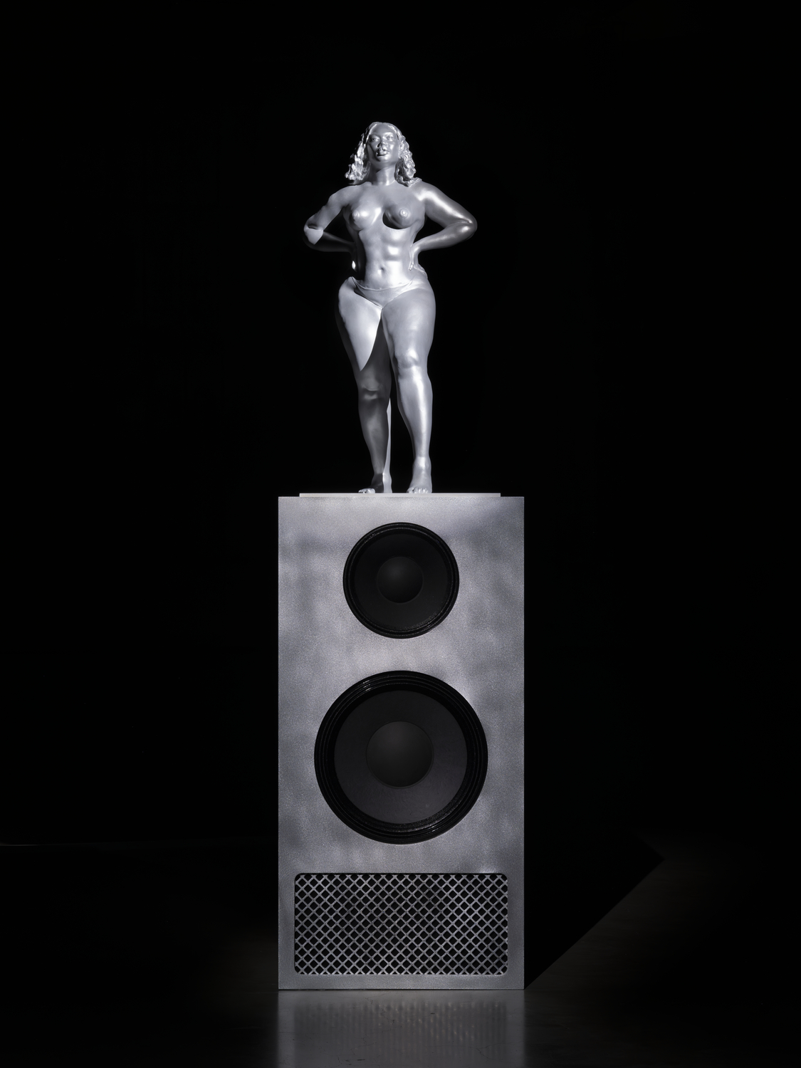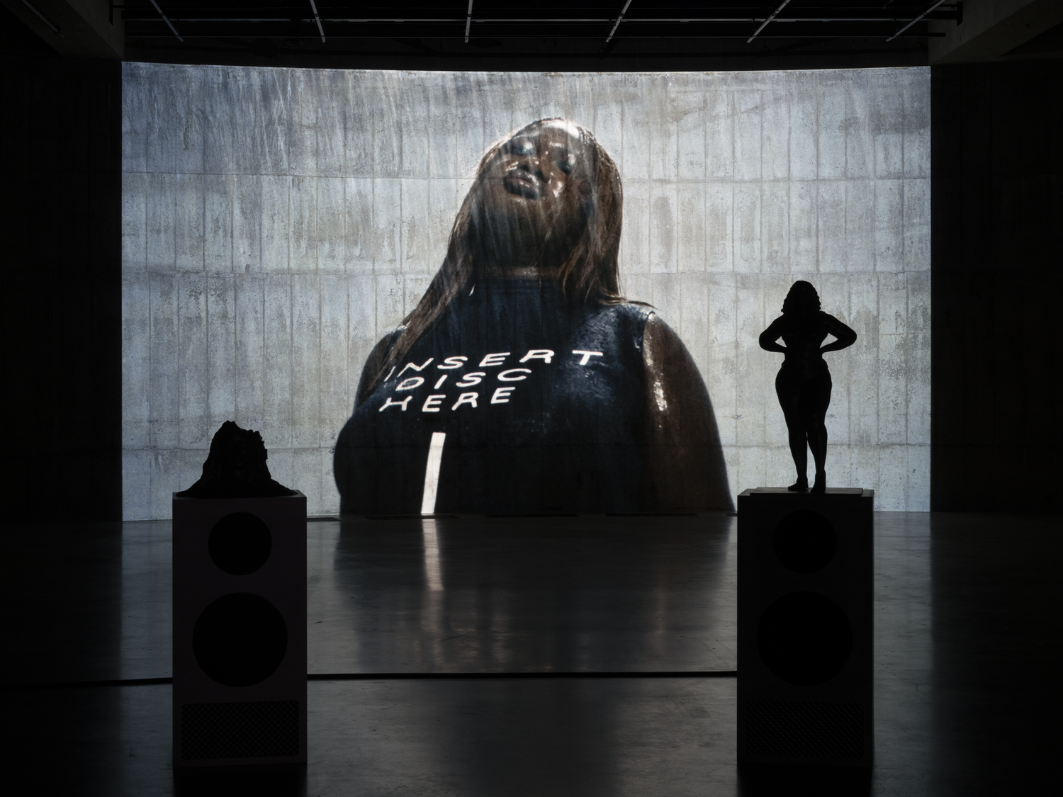 Prace Oyiri to odlewy z brązu przedstawiające jej ciało w różnych formach transformacji. To pierwszy raz, kiedy artystka pracowała z tym materiałem, a efekt jest naprawdę imponujący. Widać w nich niezwykłą lekkość i poczucie zabawy, z jakim podchodzi do tak klasycznego tworzywa. Odlewy, umieszczone na kolumnach-głośnikach, odnoszą się do presji samodoskonalenia i przemocy wpisanej w kulturę wizualną. Łączą estetykę parkietu tanecznego z obrazem ciała rozczłonkowanego przez kapitalizm, zawieszonego między pożądaniem a wymazaniem. Projekt Ghost Rider rozwija ten wątek. Podczas gdy w londyńskiej wystawie artystka badała, w jaki sposób ciała są przetwarzane i zamieniane w towar, w Zachęcie koncentruje się na tych, których obecność została wymazana, a ciała uczyniono niewidzialnymi. Temat ten podejmuje nowa rzeźba przygotowana specjalnie na wystawę – widmowa konsola DJ-ska, która zamyka serię brązów, a zarazem nadaje im nowe znaczenia. Rzeźbom towarzyszyć będzie również projekcja wideo.