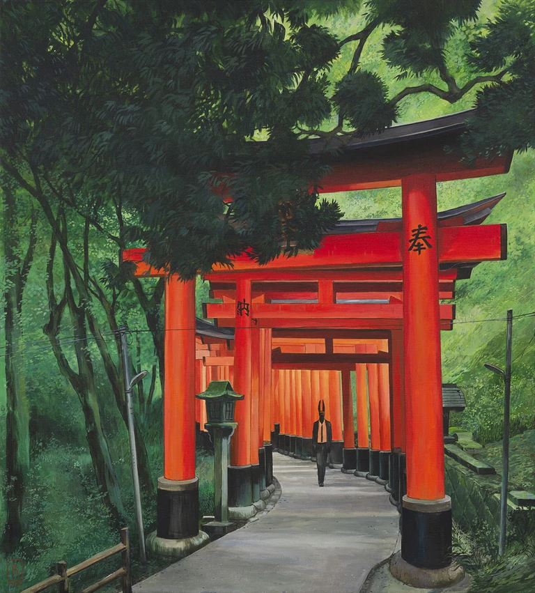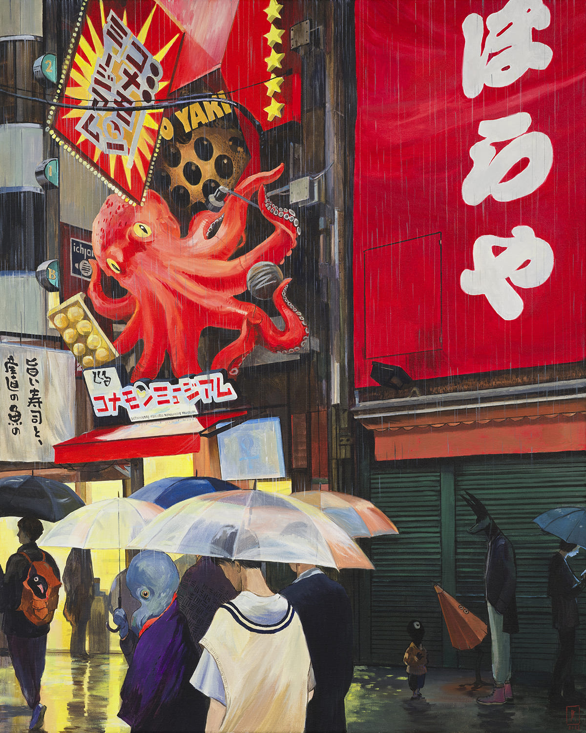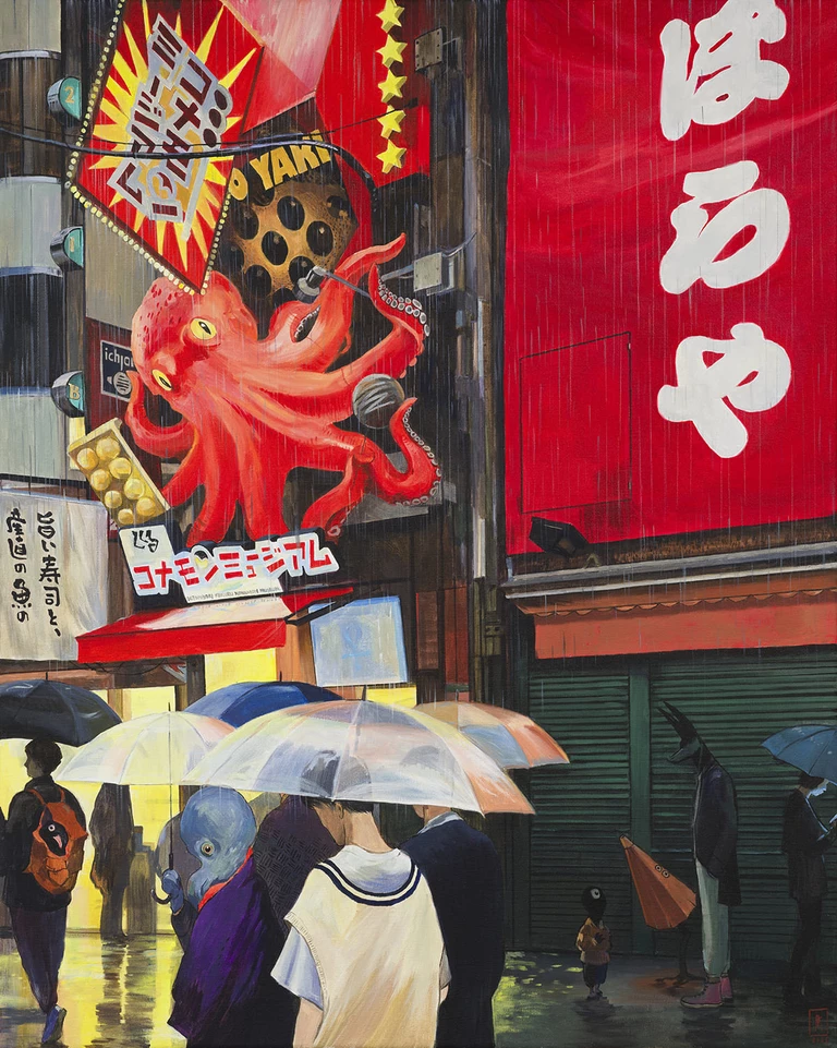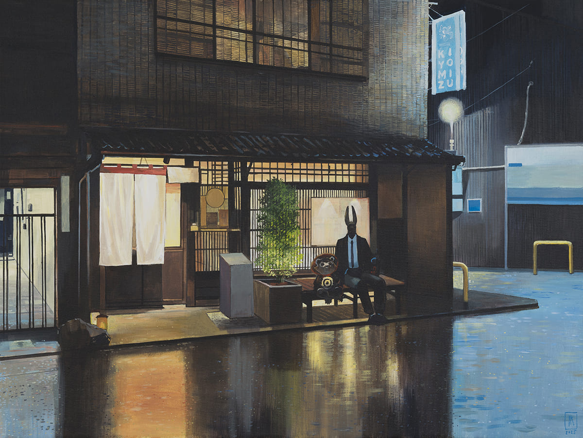 Jej fotograficzne notatki z podróży posłużyły mi do pokazania świata, w którym tajemnica funkcjonuje obok codziennego życia. Yōkai, stworzenia pochodzące z ludowych wierzeń i tradycji Japonii, spotykają Anubisa - wiecznego podróżnika pomiędzy światem żywych i zmarłych, rodem ze starożytnego Egiptu. Mamy więc na obrazach prezentowanych na wystawie nocny orszak lisów, ich wesele, psotne tanuki, koty z podwójnymi ogonami czy morskiego potwora umibozu – tłumaczy malarka. – Obok zaś my - pochłonięci zakupami, robieniem zdjęć, rozmowami przez telefon, zapominający o tym, co niewidzialne. Podróżując, warto się czasem zatrzymać. Postać gdzieś dłużej, przysiąść na ławeczce, zmienić w ostatniej chwili plany. Wystawą “Anubis i Yōkai 2” zapraszamy was do zejścia z obranej na mapie trasy i wejścia w świat fantastycznych stworzeń z innego świata. Z Krainy Bogów.