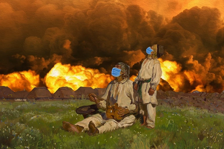 Na obrazie Józefa Chełmońskiego „Bociany” zamiast sielskiej przyrody, w tle pokazano pożar, a główni bohaterowie obrazu na twarzy mają maseczki.„Pejzaż z Bystrej” Juliana Fałata zamiast zimowego pejzażu ukazuje pustynię, a „Rybacy” z płótna Leona Wyczółkowskiego zamiast ryb łowią plastik.