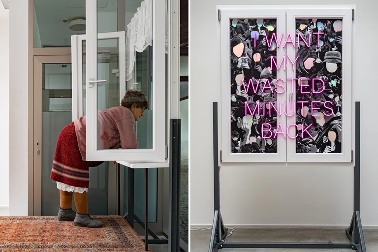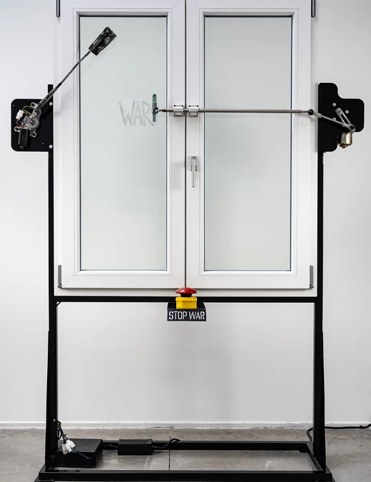 Mechaniczne ramię uporczywie przekreśla napis „WAR” na szybie. Drugie ramię usuwa gąbką to przekreślenie. W ten sposób Michał Rejner, laureat pierwszego miejsca w konkursie OKNOPLAST FOR ART komentuje współczesną rzeczywistość z której nie jesteśmy w stanie usunąć wszechobecnego zagrożenia wojną. Z kolei z sąsiedniego okna spogląda na nas sympatyczna babcia, oparta o poduszkę. To praca „Halina parapetowa” duetu Ewy Bone i Ewy Kozubal, które zajęły drugie miejsce. To tylko dwie, z pięciu prac prezentowanych na pokonkursowej wystawie.