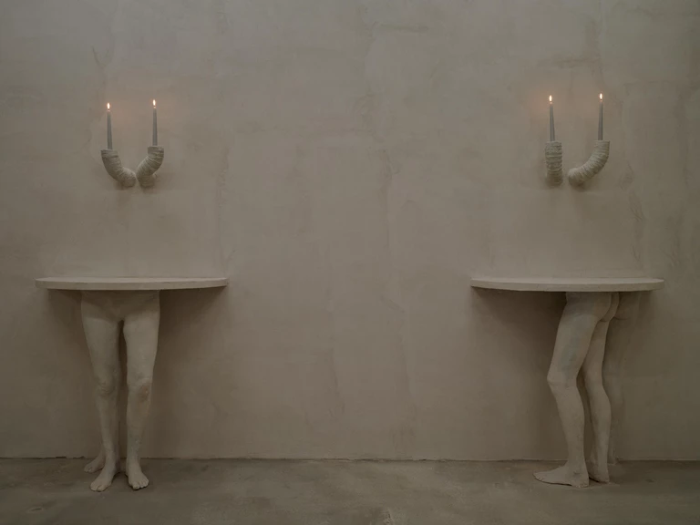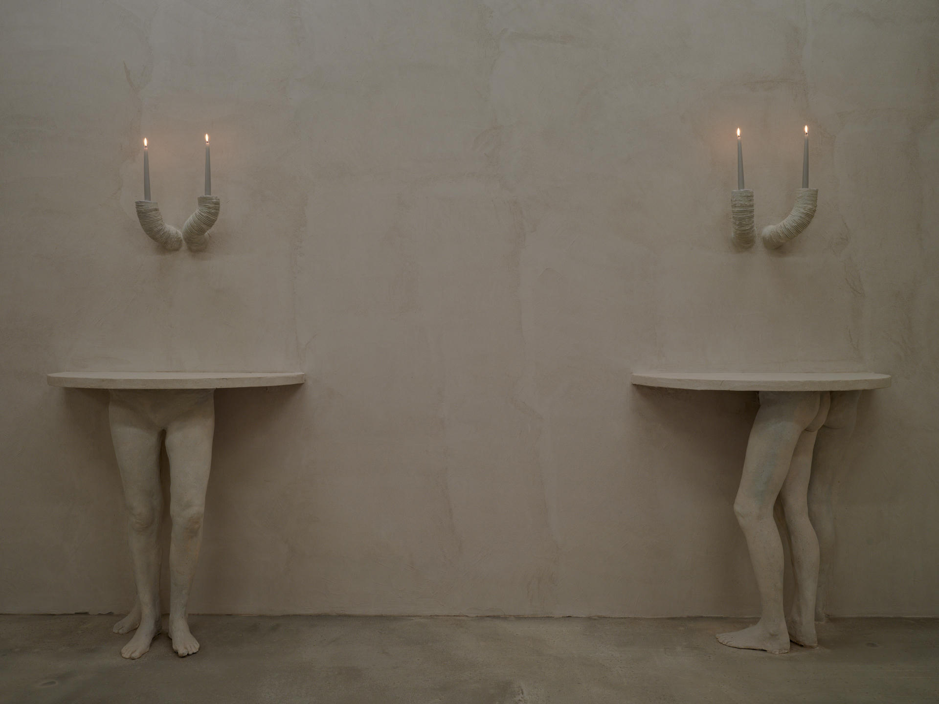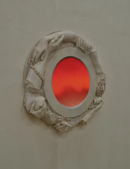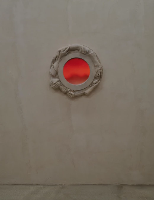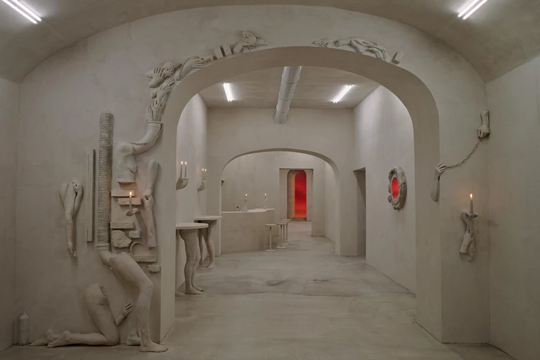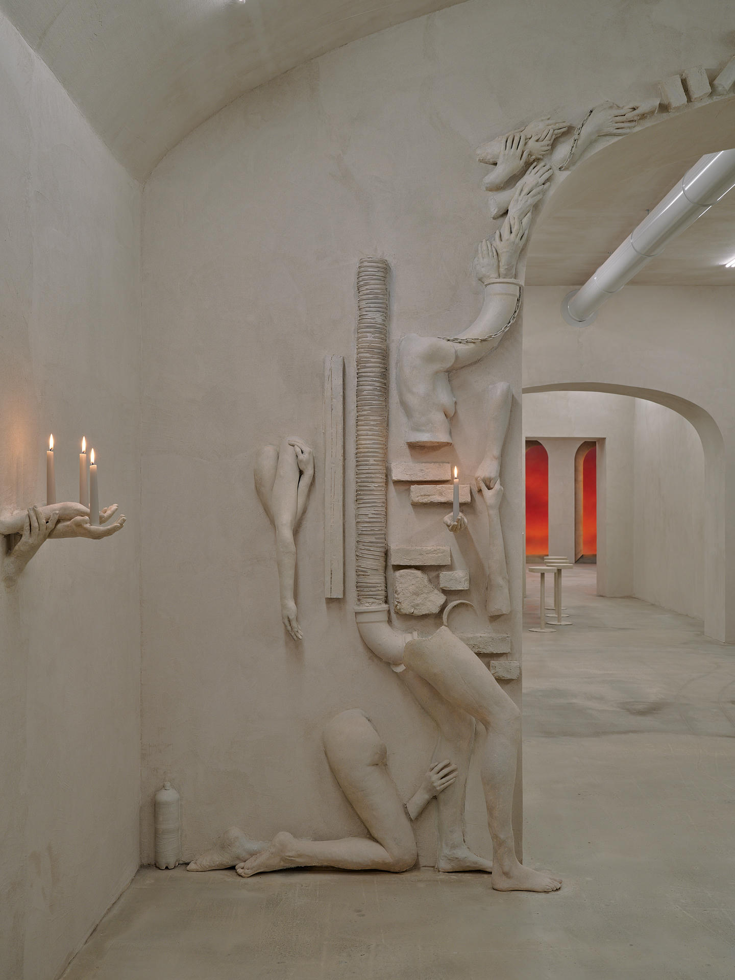 Gipsowe reliefy Keith-Roach budują poczucie surrealizmu i niepokoju: fragmenty ciał wyrastają ze ścian i łączą się z cegłą, rurami oraz drewnem, pełniąc rolę współczesnych kariatyd. Malowidła ścienne Page’a zmieniają pomieszczenie w iluzoryczną kolumnadę. Iluzja ta działa jednak tylko przez chwilę, by następnie obnażyć swoją sztuczność. Z bliska reliefy okazują się malowanym gipsem, a perspektywa malowideł Page’a się rozpada.