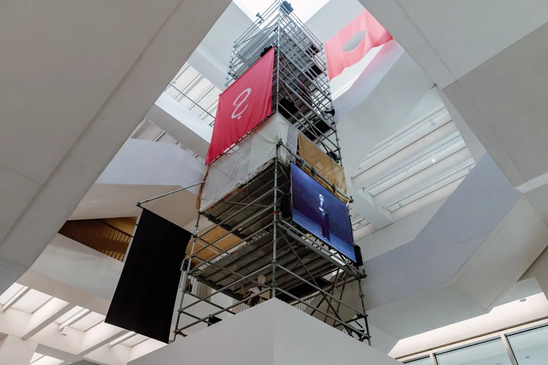– Instalacja zgłębia koncepcję społeczeństwa kontroli, przedstawioną przez Michela Foucaulta w pracy Nadzorować i karać. Narodziny więzienia. Książka, napisana wkrótce po pobycie filozofa w Warszawie w 1958 roku, w cieniu Pałacu Kultury, dotyczy internalizacji norm i zasad społecznych, a jako metaforę dyscyplinującej władzy traktuje architekturę panoptyczną – której model realizuje również budynek podarowany miastu przez Stalina – tłumaczy kurator Pier Bal-Blanc. – W Republice cyników – plac Defilad prace są prezentowane na tymczasowej konstrukcji, rusztowaniu ustawionym w sercu Muzeum, w kontekście sąsiadującego z MSN-em Pałacu Kultury. Artystki i artyści podważają ustalone zbiorowe normy i – świadomie lub nie – wskrzeszają zasady starożytnej filozofii cynickiej, które rezonują ze współczesnymi wyzwaniami społecznymi i klimatycznymi.