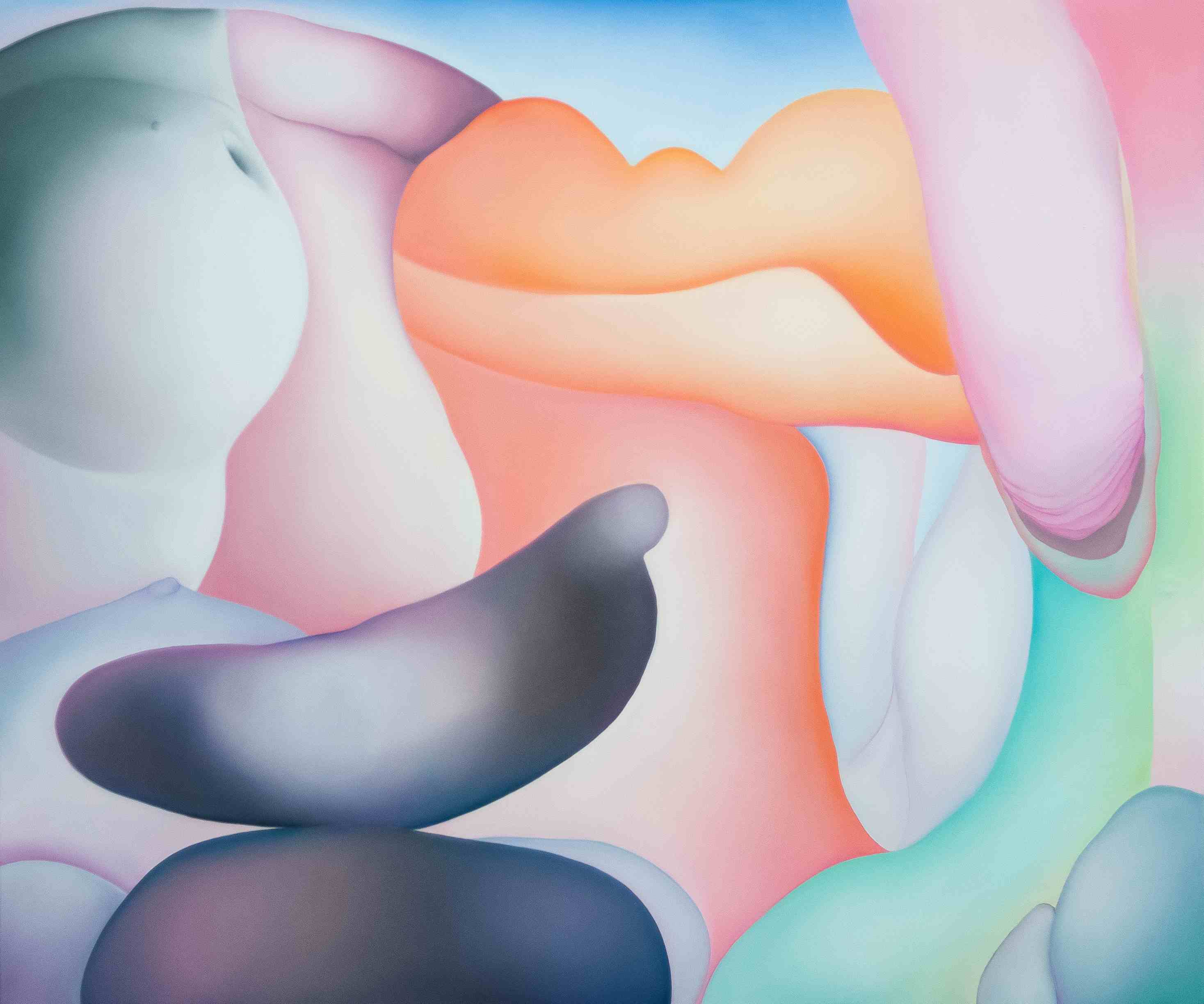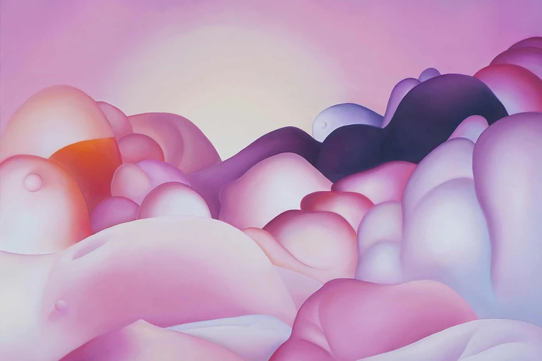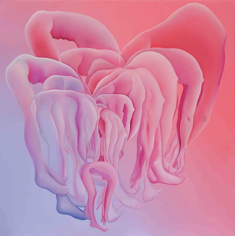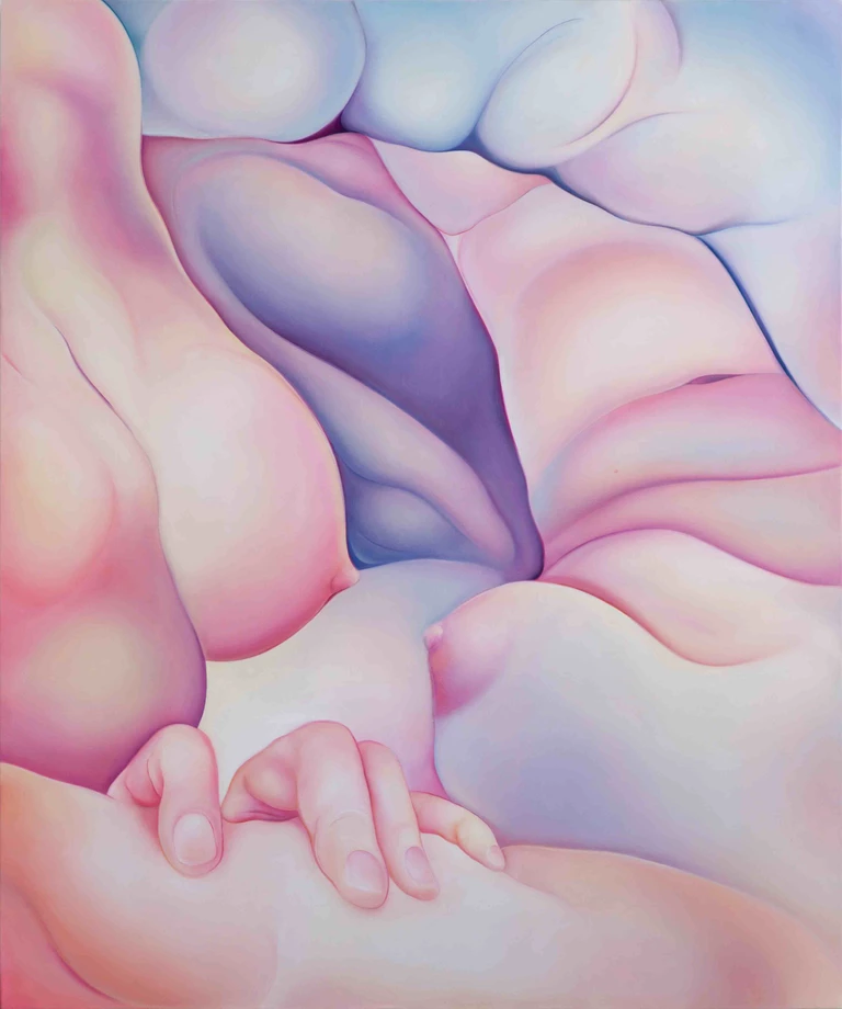 Miękkie przejścia tonalne, gradienty i rozświetlone pastelowe płaszczyzny budują aurę niemal euforycznej lekkości – ta pozorna cukierkowość okazuje się jednak zwodnicza. Pod powierzchnią delikatnych barw kryje się wyraźna fizyczność. Ciała tracą granice, stapiają się ze sobą i podkreślają swoją materialną obecność. Nagromadzone formy przywodzą na myśl krajobrazy i organiczne struktury, zacierając podział między tym, co ludzkie, a tym, co naturalne.