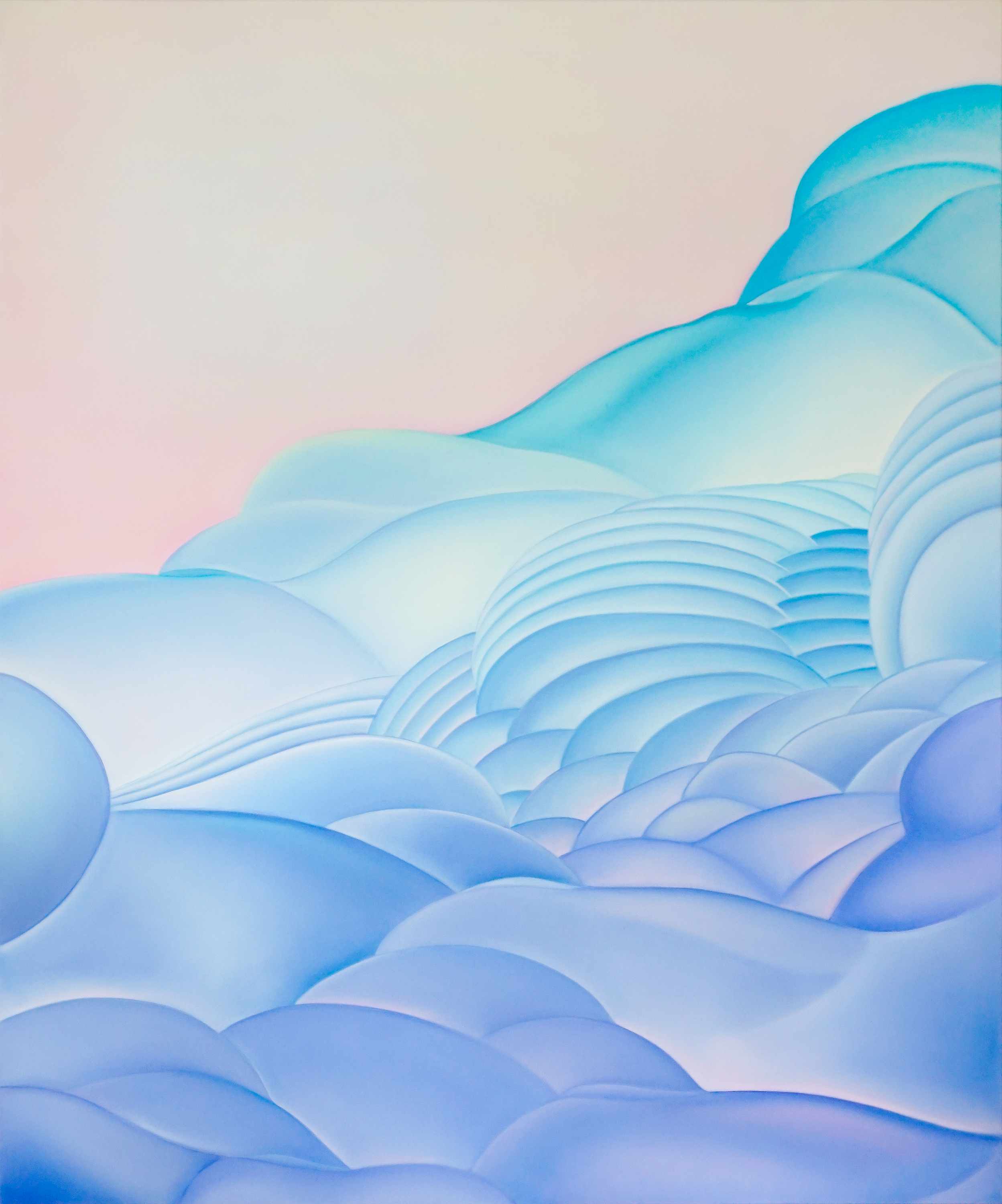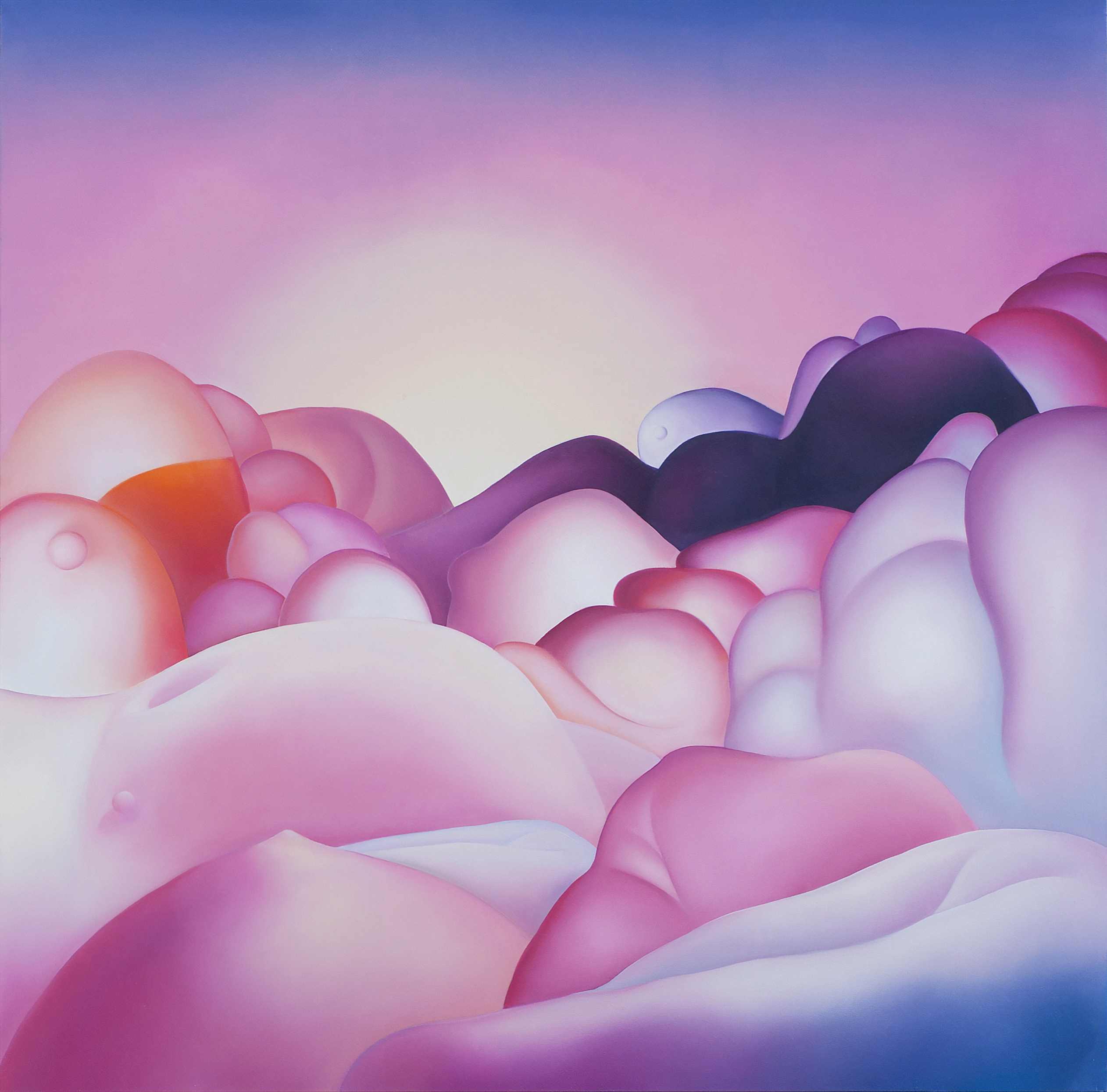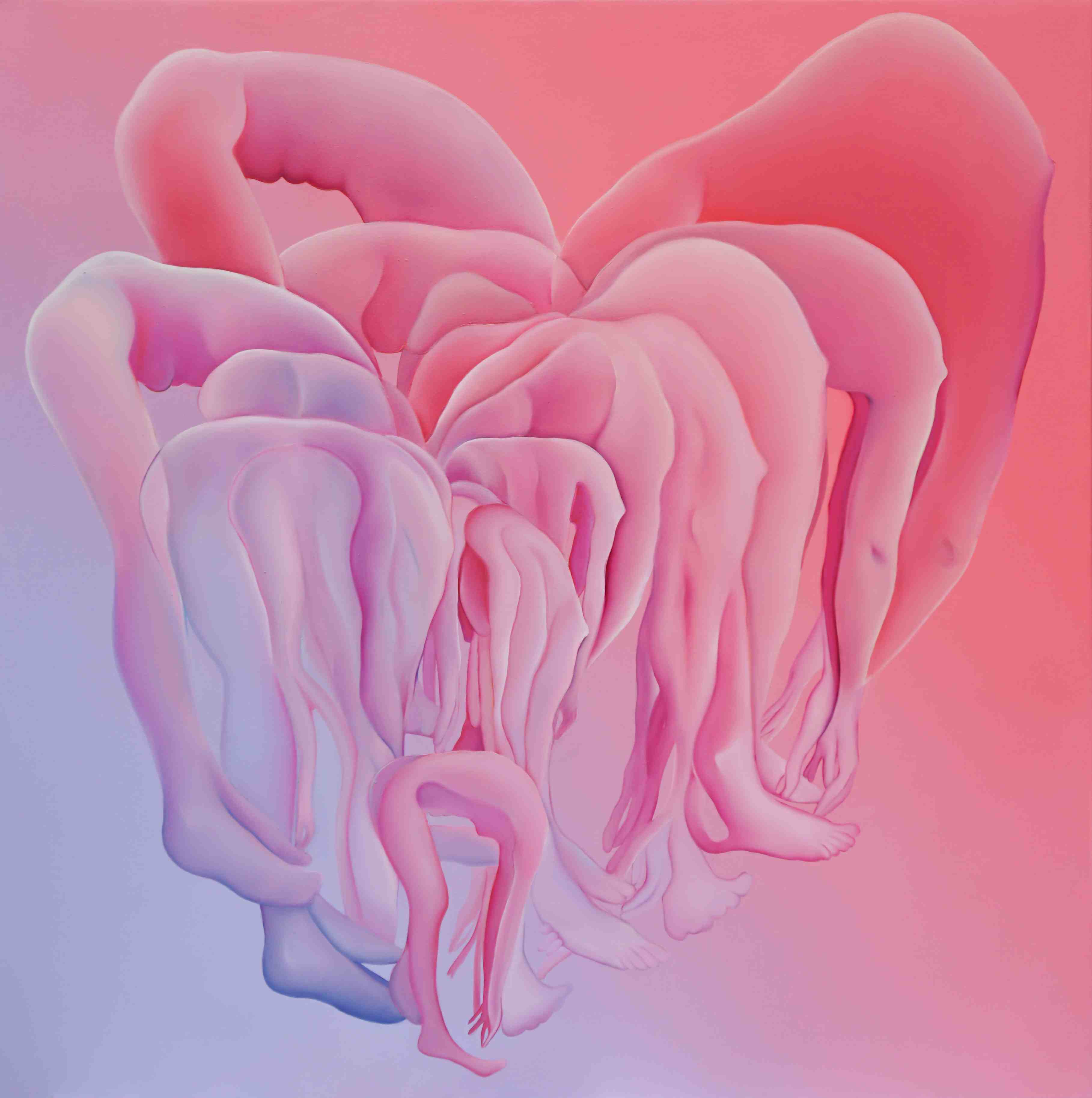 Miękkie przejścia tonalne, gradienty i rozświetlone pastelowe płaszczyzny budują aurę niemal euforycznej lekkości – ta pozorna cukierkowość okazuje się jednak zwodnicza. Pod powierzchnią delikatnych barw kryje się wyraźna fizyczność. Ciała tracą granice, stapiają się ze sobą i podkreślają swoją materialną obecność. Nagromadzone formy przywodzą na myśl krajobrazy i organiczne struktury, zacierając podział między tym, co ludzkie, a tym, co naturalne.
